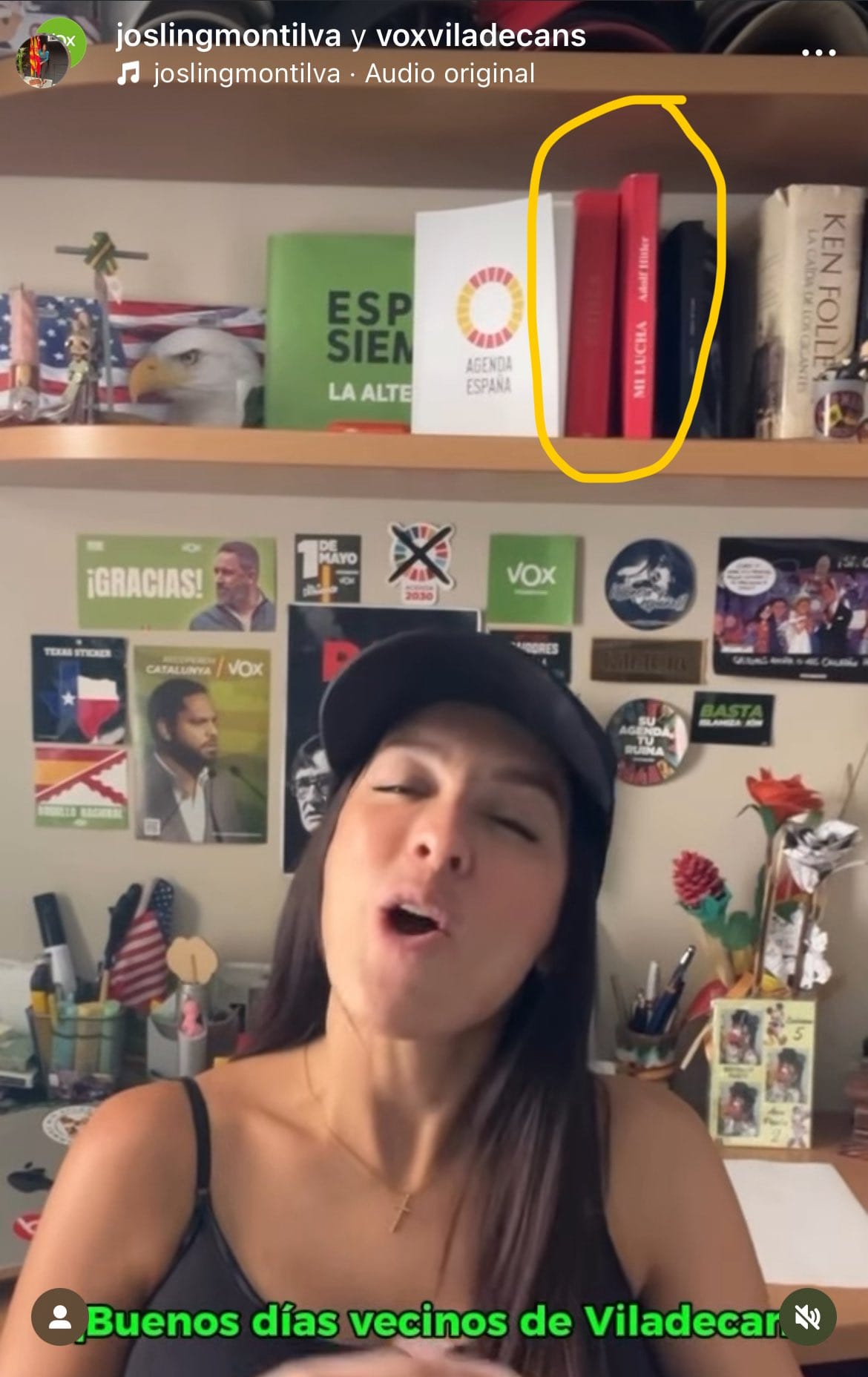 El 9 de septiembre, la concejala de VOX en Viladecans (Barcelona, Catalunya), Josling Montilva, publicó un vídeo en la red social Instagram, en el que daba la bienvenida al curso escolar hablando de una educación “de y para las familias”. En el vídeo se puede observar que la concejala tiene la pared llena de simbología de su formación política, así como otros símbolos de la ultraderecha estadounidense. También muestra algunos libros de su biblioteca personal, como la conocida novela de Ken Follett La caída de los gigantes y un libro rojo: Mein Kampf (Mi lucha), de Adolf Hitler.
