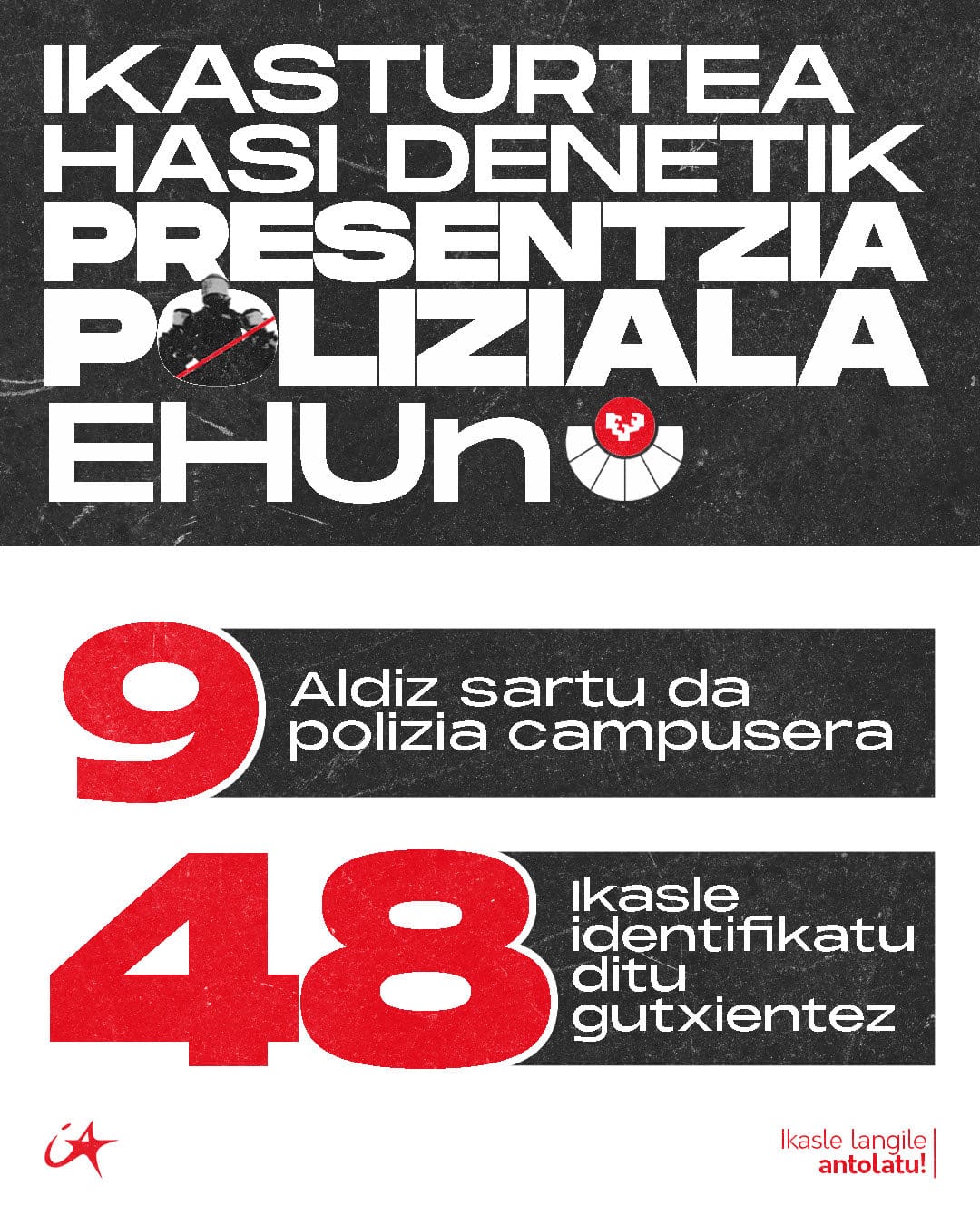 No han pasado ni dos meses desde el inicio del curso académico, pero en ese tiempo Ikasle Abertzaleak (IA) ya ha hecho públicos varios datos alarmantes sobre la intervención de las fuerzas policiales en la Universidad del País Vasco (UPV/EHU).
