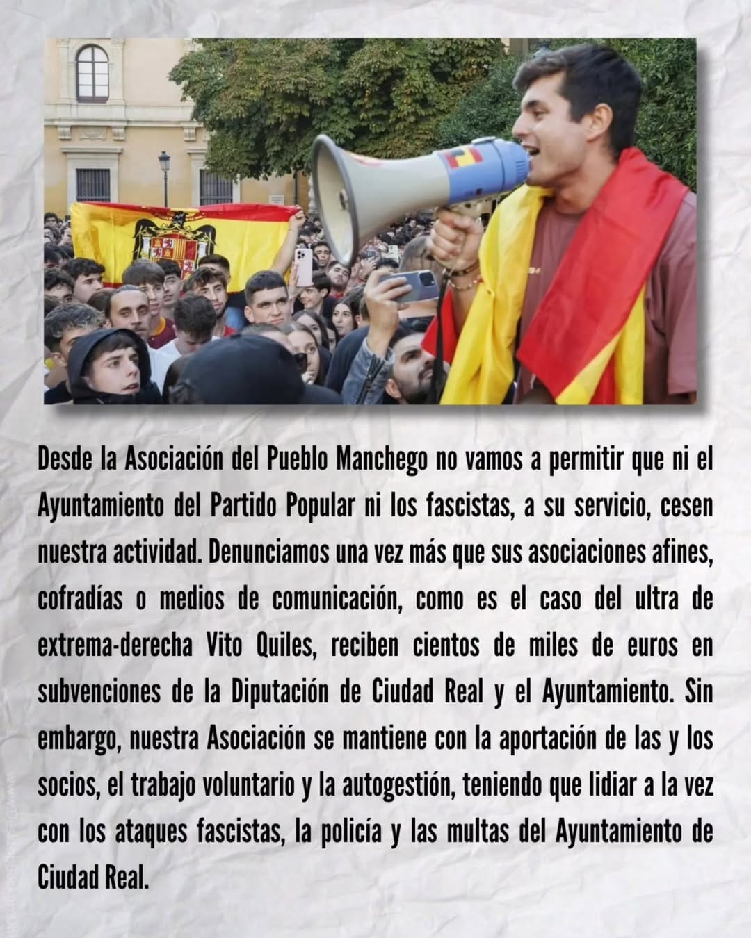 Denuncian que "sus asociaciones afines, cofradías o medios de comunicación, como es el caso del ultra de extrema derecha Vito Quiles, reciben cientos de miles de euros en subvenciones de la Diputación de Ciudad Real y el Ayuntamiento", mientras que la Asociación del Pueblo Manchego se mantiene con las aportaciones económicas de sus socios, el trabajo voluntario y la autogestión.