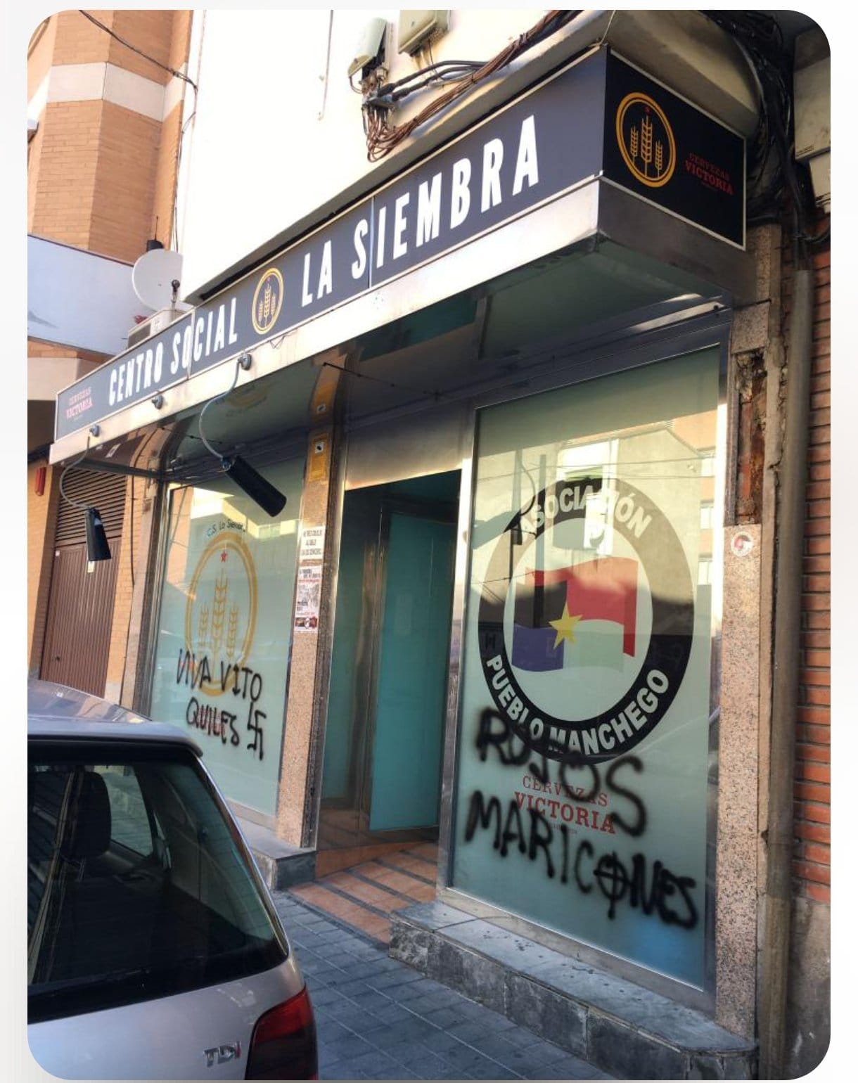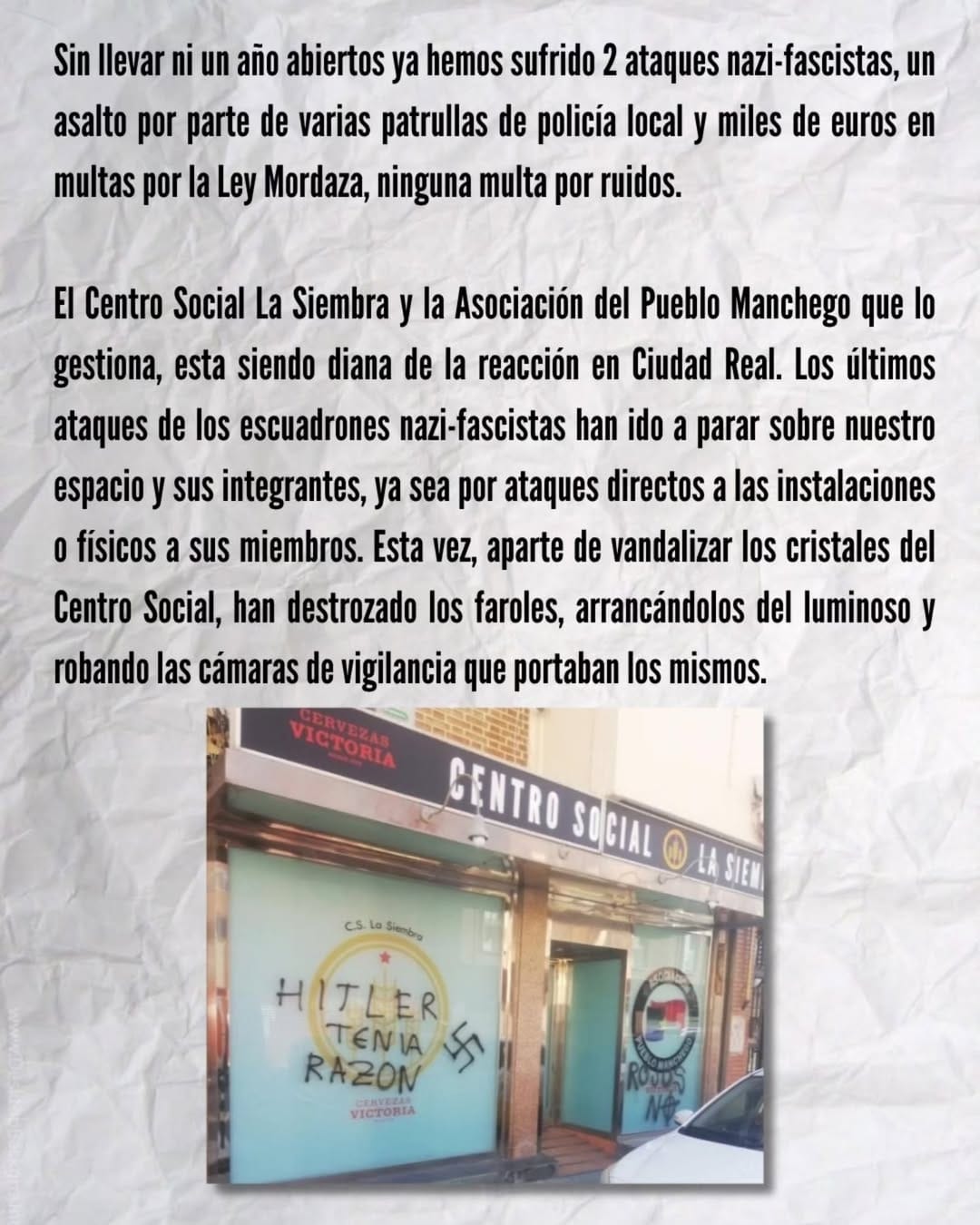 El Centro Social La Siembra y la Asociación del Pueblo Manchego que lo gestiona denuncian que están siendo "diana de la reacción" en Ciudad Real (Castilla La-Mancha). "Los últimos ataques de los escuadrones nazi-fascistas han ido a parar sobre nuestro espacio y sus integrantes, ya sea por ataques directos a las instalaciones o físicos a sus miembros". Esta vez, explican que el ataque no se ha limitado unas pintadas: "Aparte de vandalizar los cristales del Centro Social, han destrozado los faroles, arrancándolos del luminoso y robando las cámaras de vigilancia que portavan los mismos".