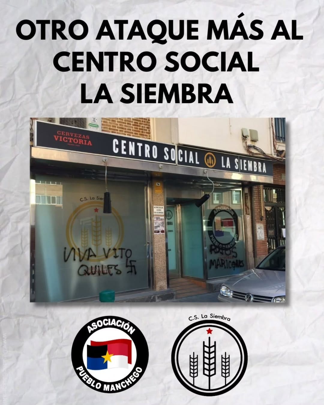 El Centro Social Autogestionado La Siembra ha recibido un segundo ataque fascista en menos de un año de existencia. Otra vez más, fascistas han pintado su fachada con mensajes amenazantes y proclamas "Viva Vito Quiles", acompañado de una esvástica, y "Rojos maricones". Miembros del local explican que últimamente también han recibido un asalto por parte de varias patrullas de policía local y miles de euros en multas por la Ley Mordaza, "ninguna por ruidos".