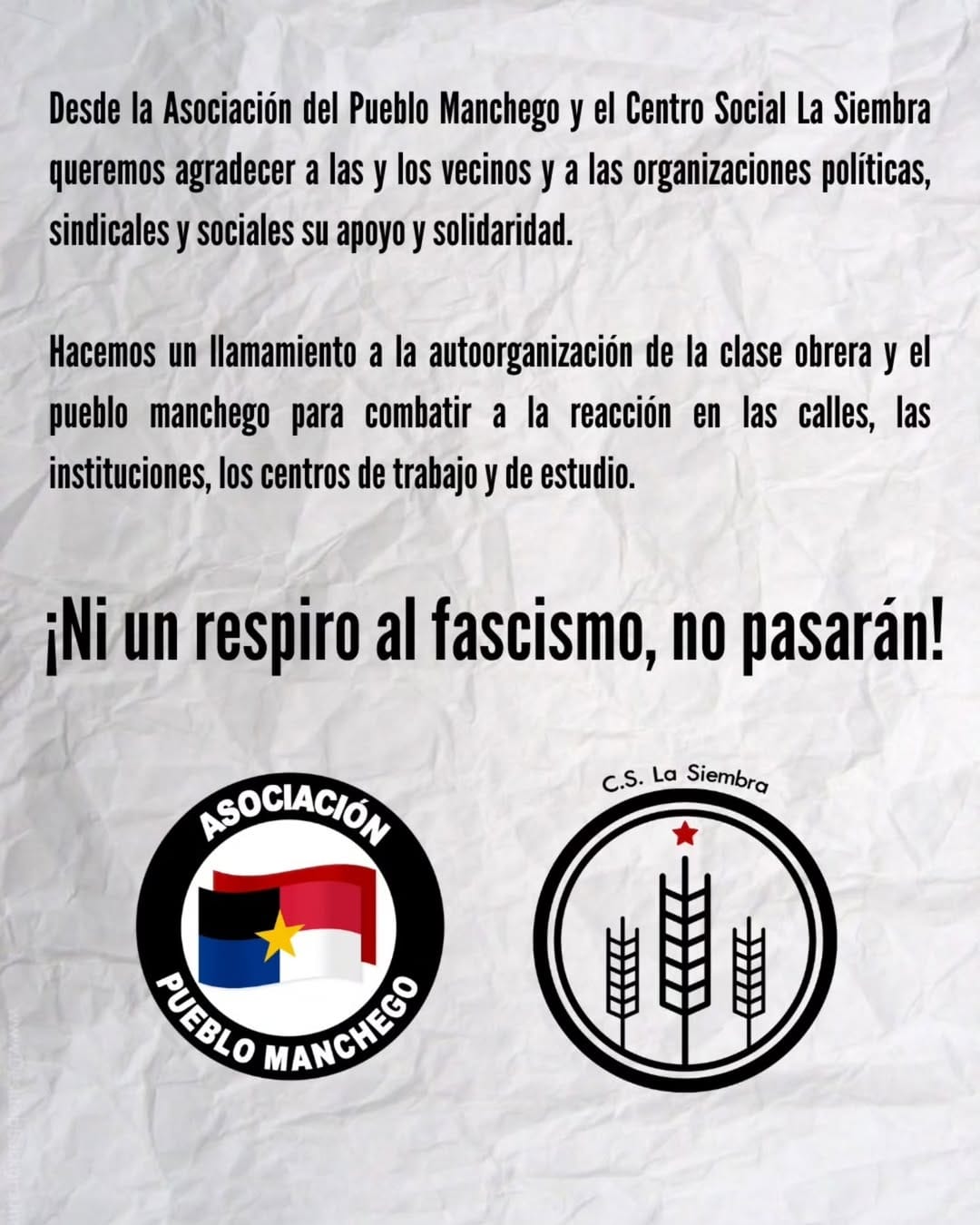 Han mostrado su agradecimiento al vecindario, organizaciones políticas, sindicales y sociales su apoyo y su solidaridad, al tiempo que hacen un llamamiento a la autoorganización de la clase obrera y el pueblo manchego para combatir la reacción en las calles, las instituciones, los centros de trabajo y de estudio. "¡Ni un respiro al fascismo, no pasarán!", concluyen.