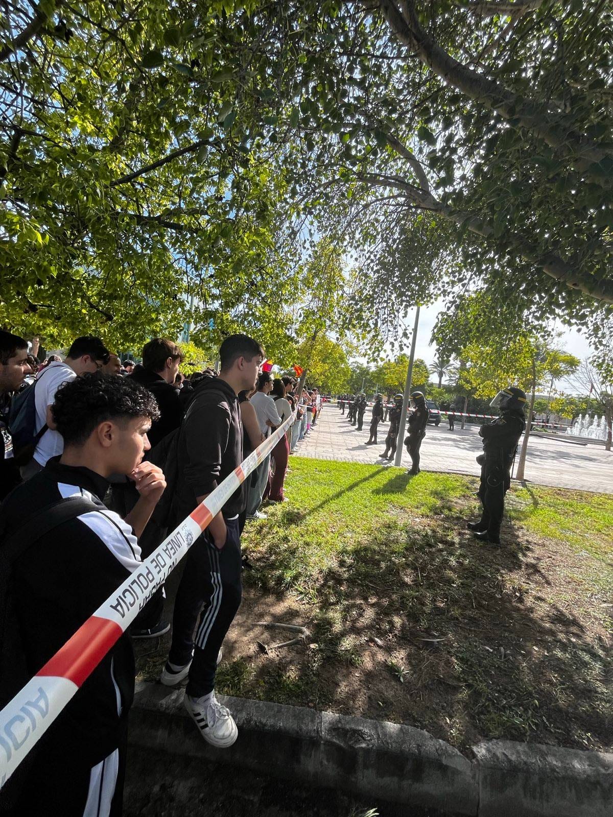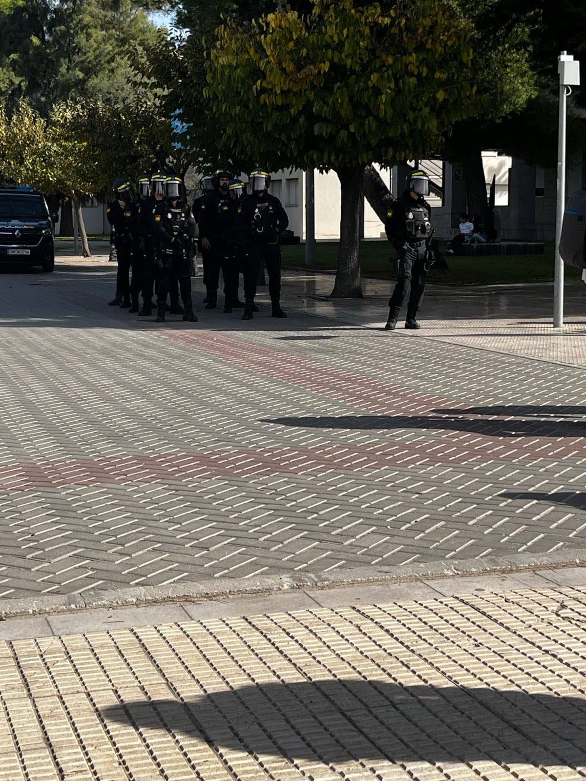 En paralelo, frente a la Facultad de Derecho, centenares de estudiantes y organizaciones antifascistas convocantes de la contramanifestación coreaban lemas como “Alacant serà la tomba del feixisme” y “Vito, colega, sácate la carrera”, denunciando la presencia del agitador fascista en el campus.