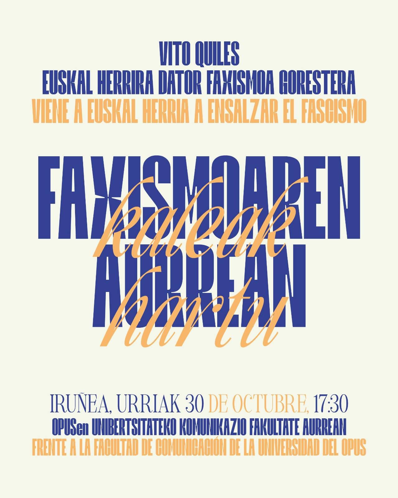 Ante esta situación, varios colectivos han llamado a movilizarse contra el fascismo en Iruñerria, advirtiendo: Vito Quiles viene a Euskal Herria a ensalzar el fascismo. La concentración será mañana, 30 de octubre, a las 17:30 frente a la Facultad de Comunicación de la Universidad de la Opus, bajo el lema “Tomemos las calles frente al fascismo”.