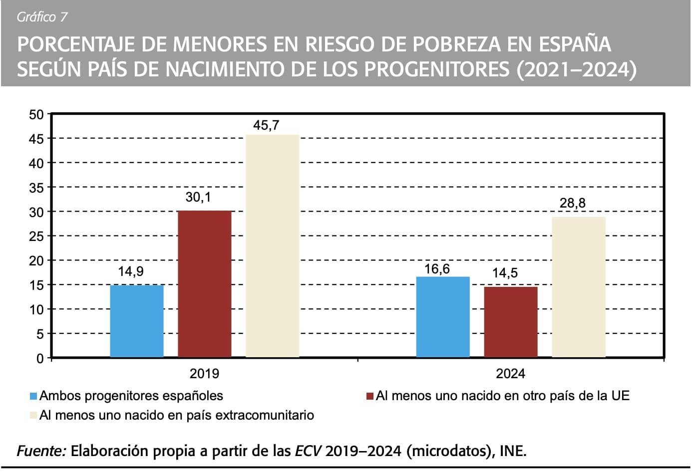 Un análisis desglosado según el país de nacimiento de los progenitores evidencia diferencias notables: en hogares con padres nacidos en el extranjero, especialmente extracomunitarios, las tasas de pobreza infantil se duplican o triplican en comparación con hogares con progenitores españoles. En estos casos, la tasa llega hasta cerca del 45%, contrastando con el 14-16% que afecta a niños de padres españoles. La precariedad laboral, la inestabilidad de empleo y la elevada carga en gastos de vivienda influyen en esta vulnerabilidad, acentuando la transmisión intergeneracional de la pobreza, lo que demuestra que las políticas sociales del Gobierno español no están funcionando para proteger adecuadamente a estas familias.