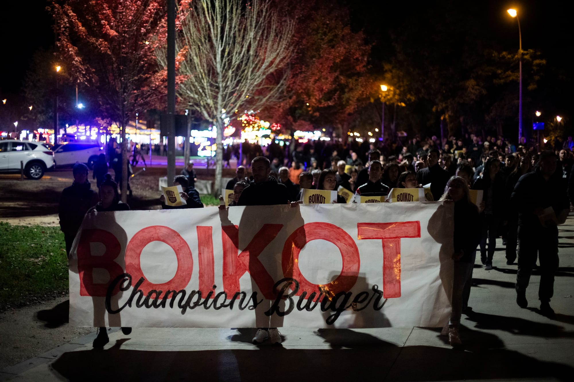 Los vecinos también señalaron a los patrocinadores que están detrás de The Champions Burger, “la mayoría de los cuales mantiene relaciones económicas con Israel”, citando entre ellos a Pepsi, Heineken y Uber. En la manifestación del viernes afirmaron que cientos de personas se han organizado este año contra todo eso, y que las movilizaciones de los últimos días son prueba de ello: “La asamblea vecinal, la kalejira (pasacalle), la recogida de firmas que continuará hasta el martes, la propaganda en el barrio…”.