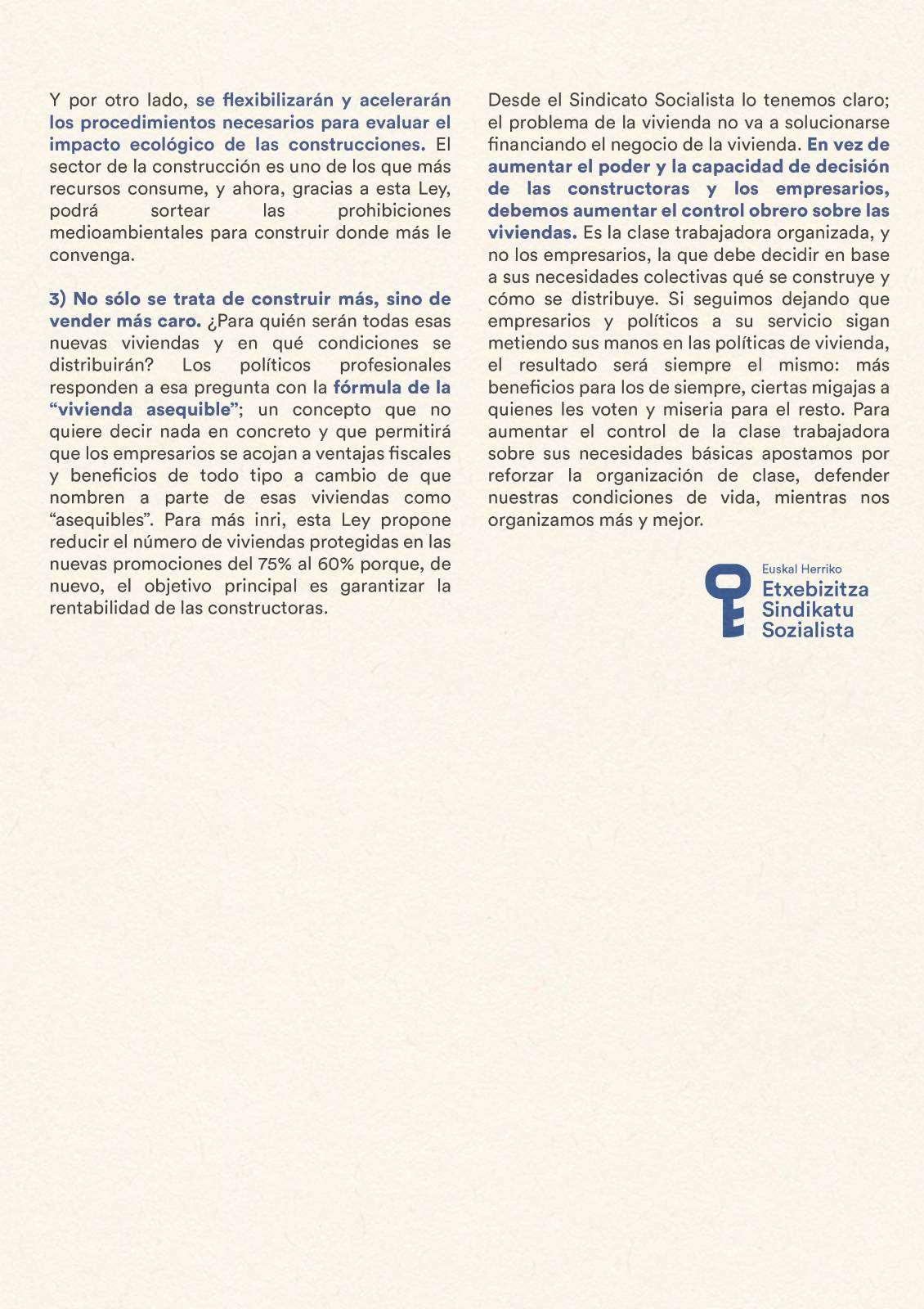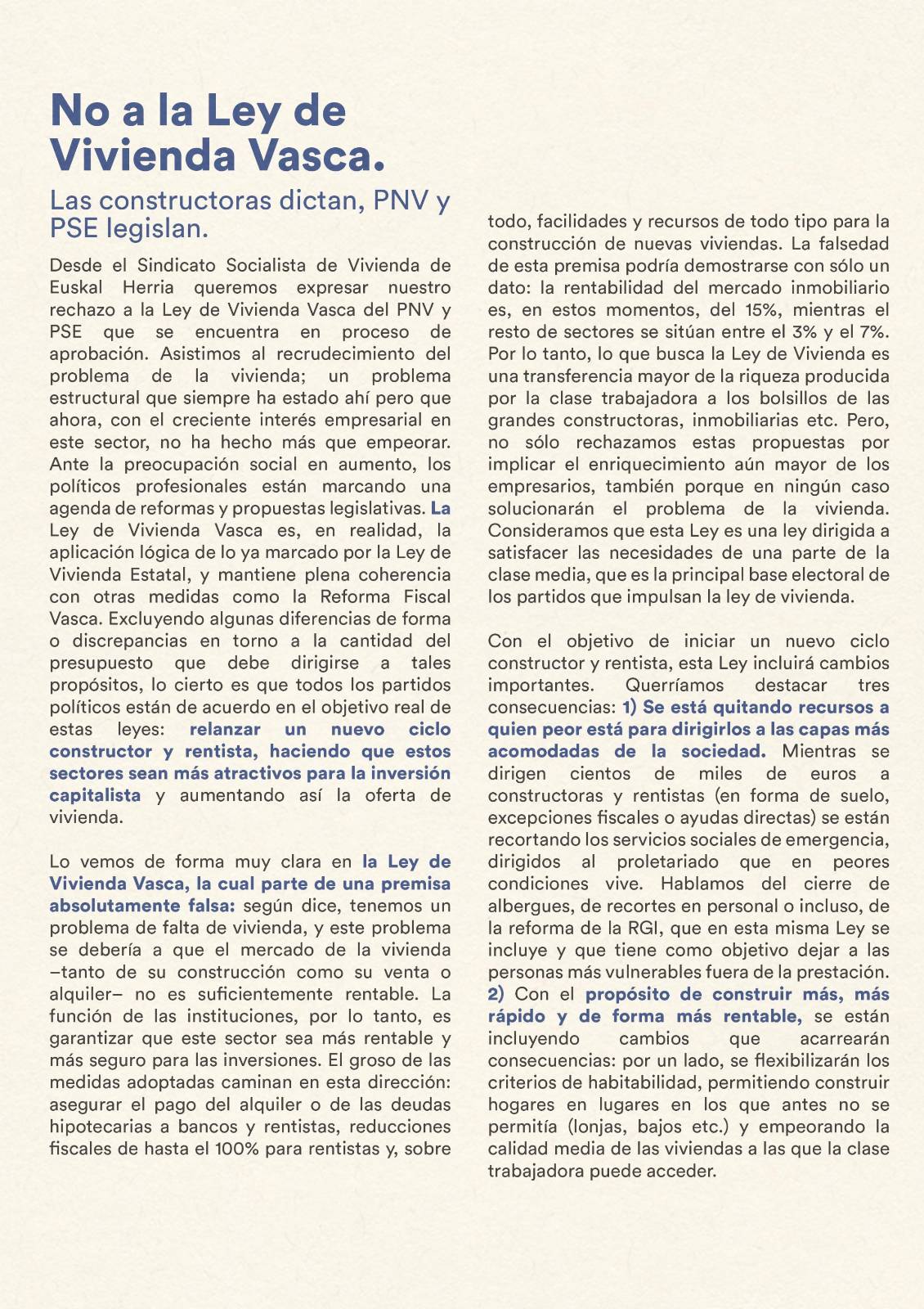 El Sindicato Socialista de Vivienda de Euskal Herria concluye su comunicado afirmando que “el problema de la vivienda no va a solucionarse financiando el negocio de la vivienda”. Reclama “sacar las manos de constructoras e inmobiliarias de las políticas de vivienda” y “aumentar el control obrero sobre las viviendas y sobre las decisiones que afectan a las necesidades básicas de la clase trabajadora”.