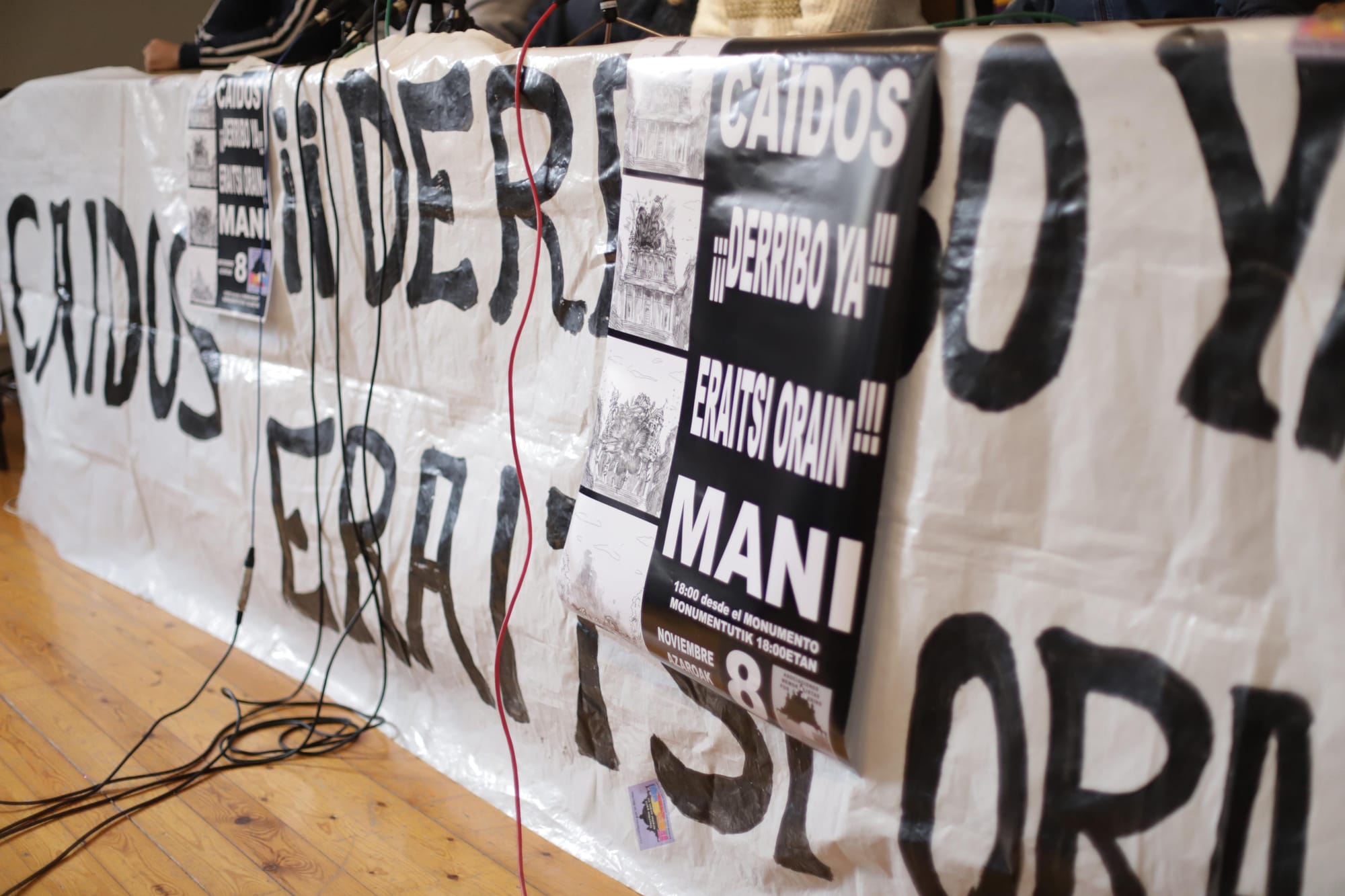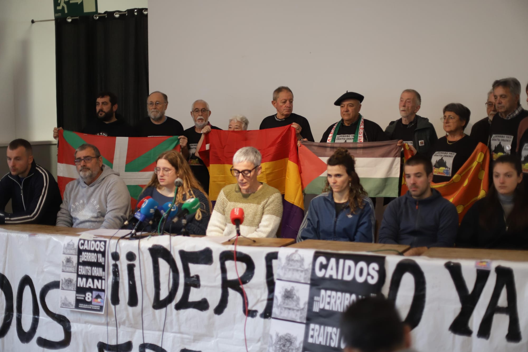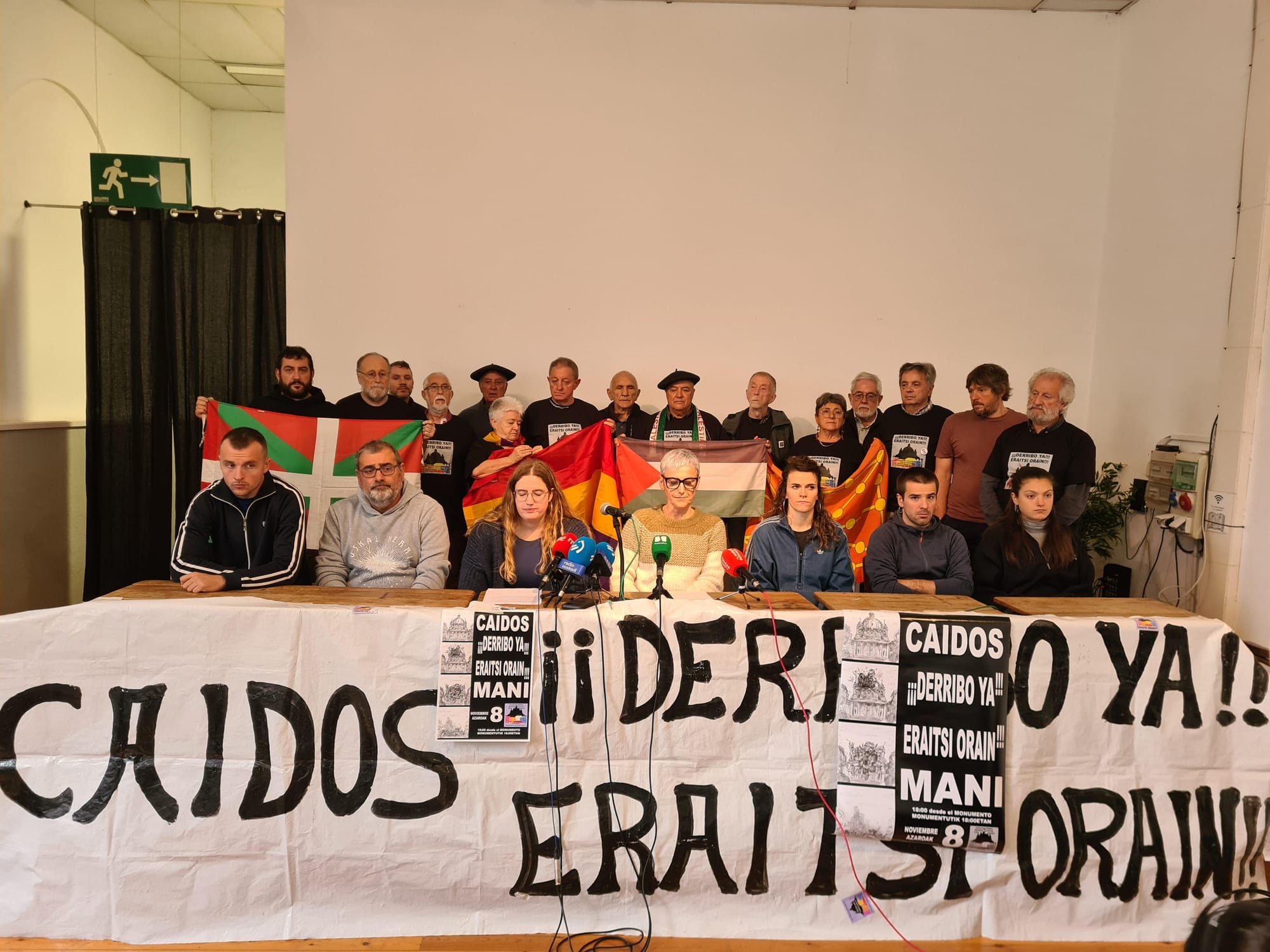 En rueda de prensa defendieron la reivindicación realizada por "víctimas del franquismo y asociaciones memorialistas para pedir la demolición del Monumento a los Caídos", y llamaron a participar en la movilización del sábado para "exigir que ese símbolo franquista sea retirado para siempre de las calles de Iruñea". En la comparecencia participaron varios sindicatos, así como diversas organizaciones de Iruñerria como Mugarik Gabe, Zabaldi, Lunes Lilas, Haritu y el Consejo Socialista de Iruñerria.