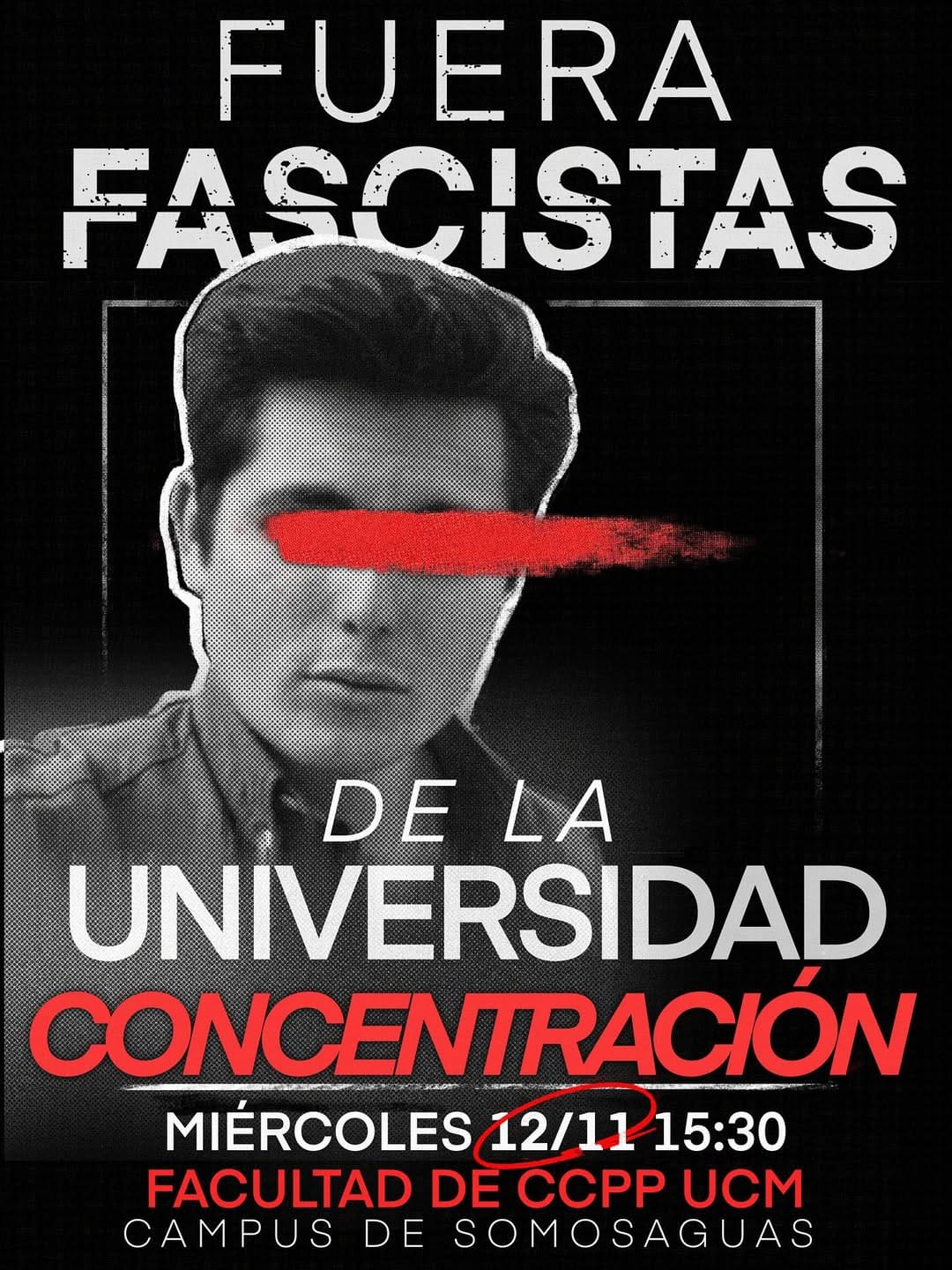 Varias organizaciones políticas y sindicatos estudiantiles ha convocado una concentración unitaria para el próximo miércoles 12 de noviembre a las 15:30 frente a la Facultad de Ciencias Políticas y Sociología de la Universidad Complutense de Madrid. Bajo el lema Fuera fascistas de la universidad, la convocatoria busca impedir que el agitador fascista haga acto de presencia en el campus y difunda sus discursos de odio.