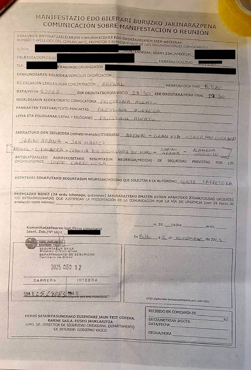 Los organizadores hicieron la primera notificación hace un mes. Inicialmente, las autoridades rechazaron la solicitud para realizar la manifestación en apoyo de la resistencia palestina, tomando como pretexto el itinerario planteado (Areatza-Calle Gran Vía de Don Diego López Haro-Sagrado Corazón); argumentaron que para esa misma tarde "ya había varias convocatorias". Sin embargo, posteriormente, al volver a tramitar la notificación, no ha habido ningún problema.