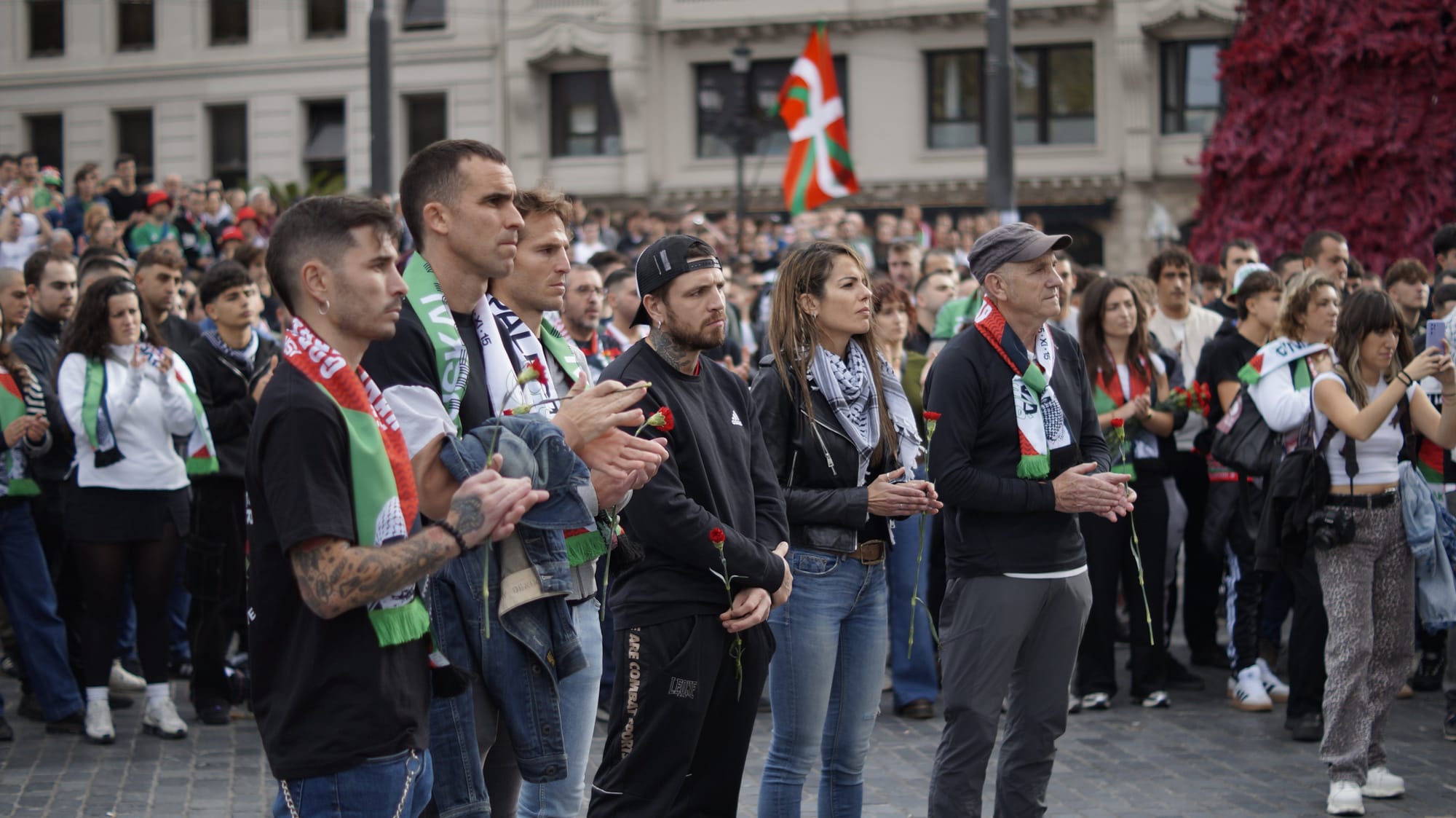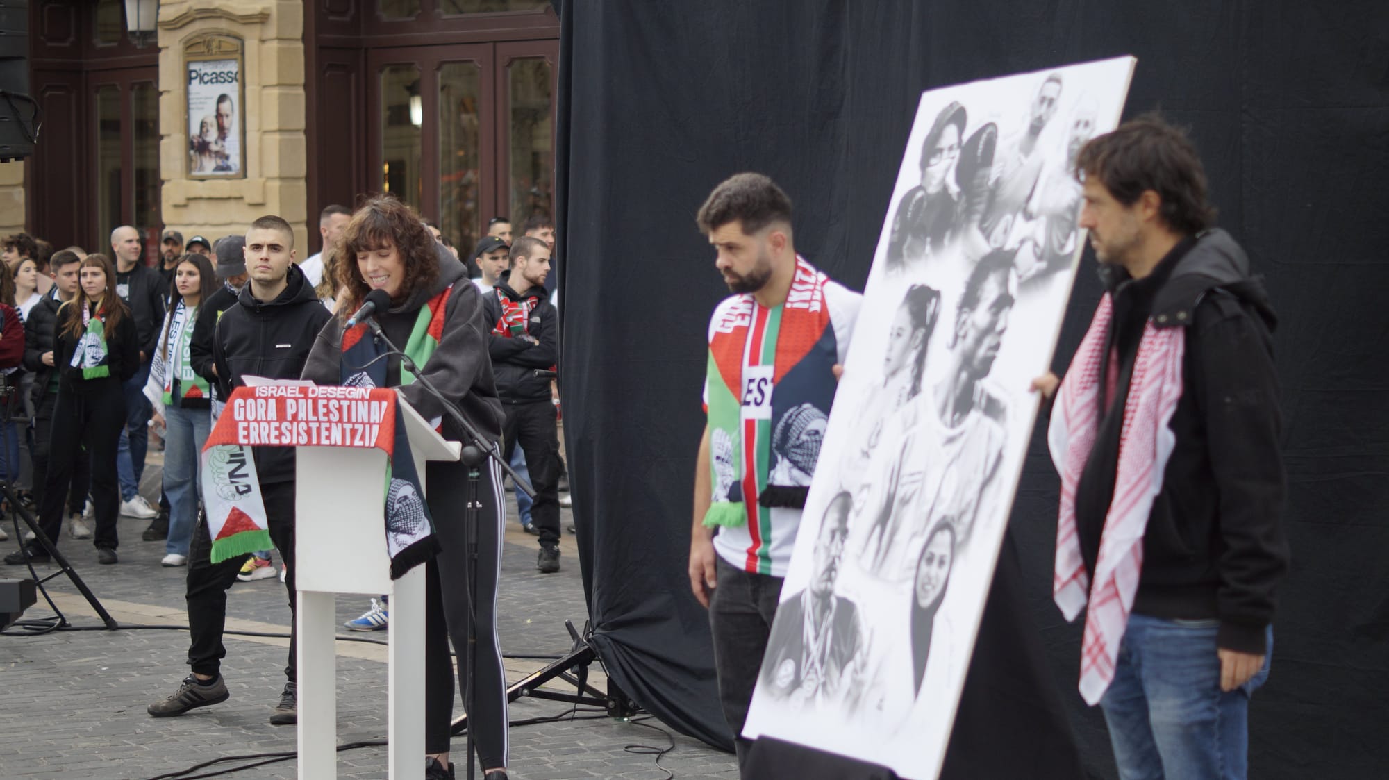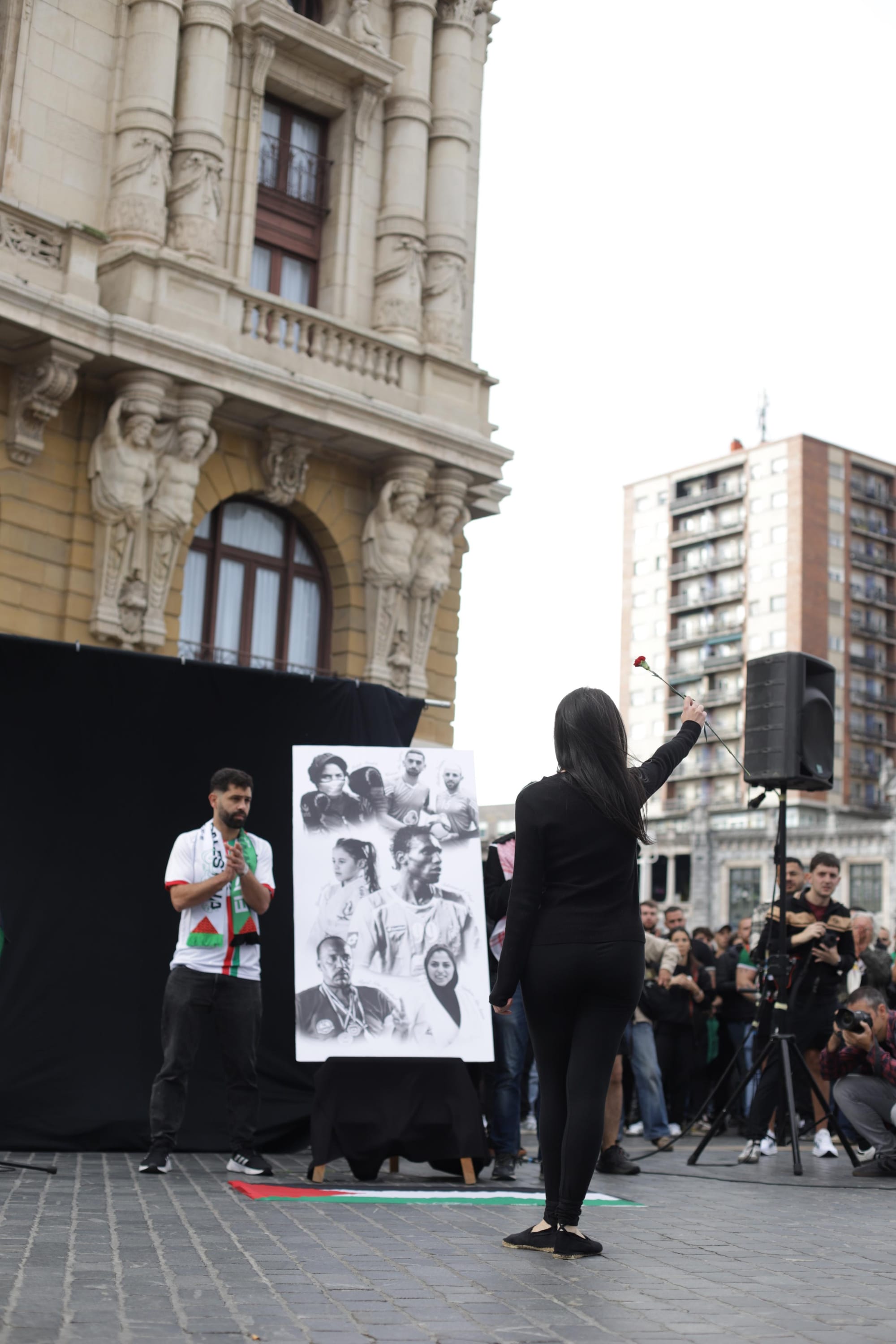 Pasadas las 13:00 comenzó el homenaje, y cientos de personas acudieron a la Plaza Arriaga para recordar a los palestinos asesinados. En el acto participaron varios deportistas conocidos de Euskal Herria; entre ellos, los boxeadores Kerman Lejarraga e Ibon Larrinaga, la atleta Maitane Melero y los futbolistas Manu García, Jagoba Beobide y Mikel González.