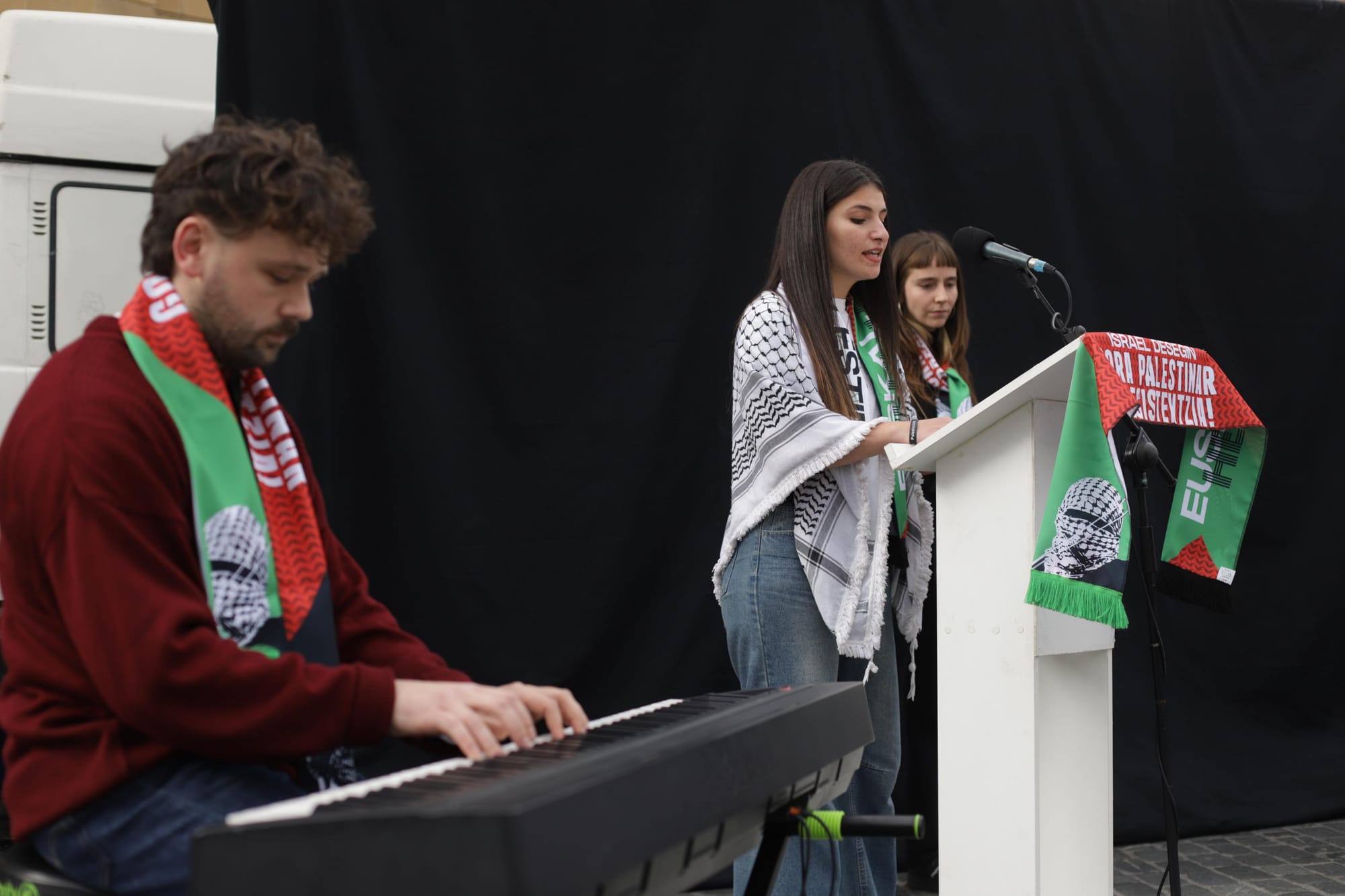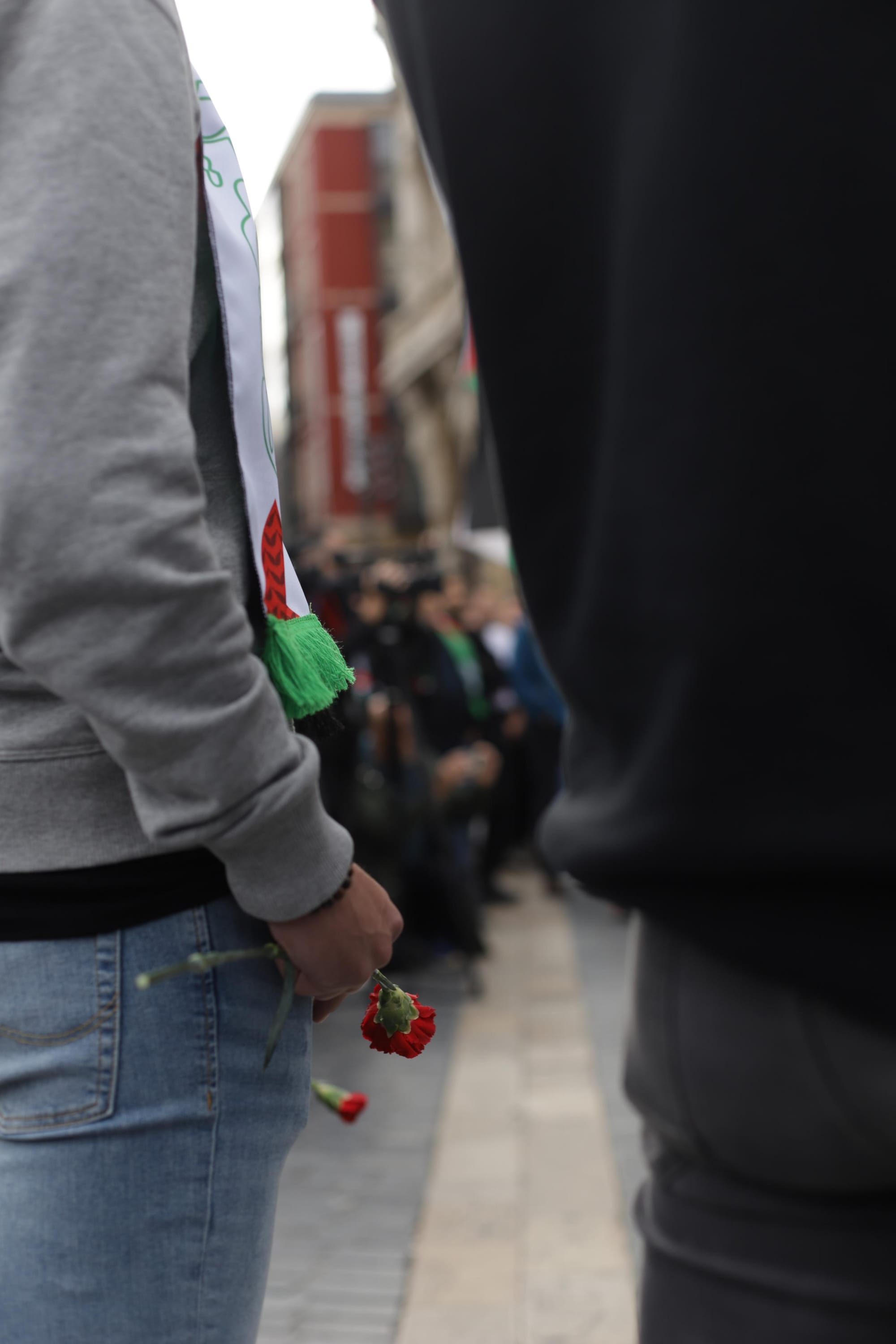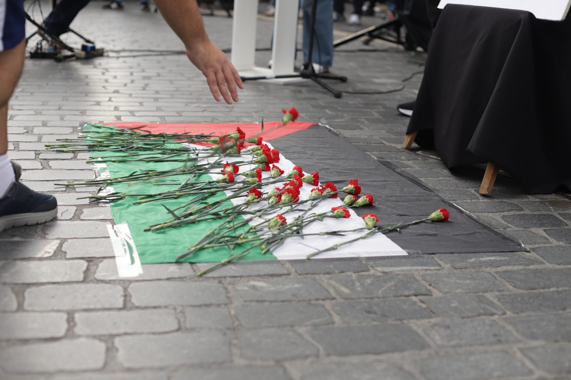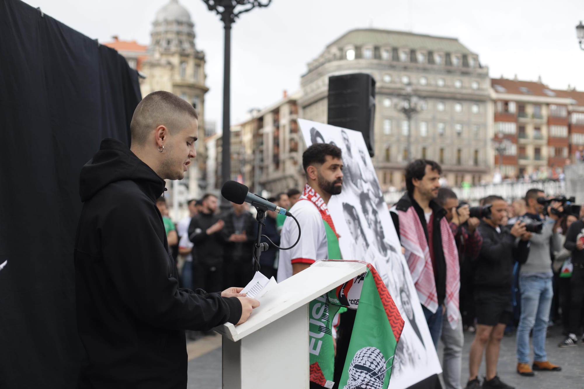 Pasadas las 13:00 comenzó el homenaje, y cientos de personas acudieron a la Plaza Arriaga para recordar a los palestinos asesinados. En el acto participaron varios deportistas conocidos de Euskal Herria; entre ellos, los boxeadores Kerman Lejarraga e Ibon Larrinaga, la atleta Maitane Melero y los futbolistas Manu García, Jagoba Beobide y Mikel González.