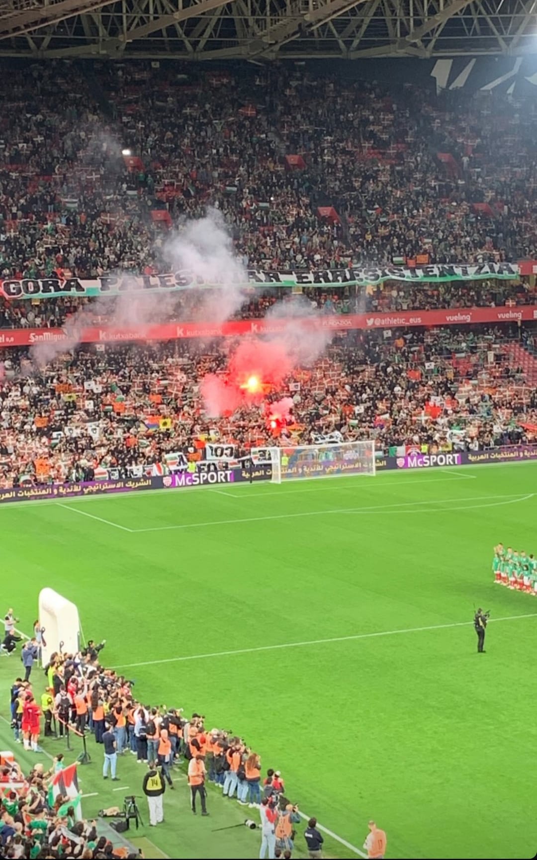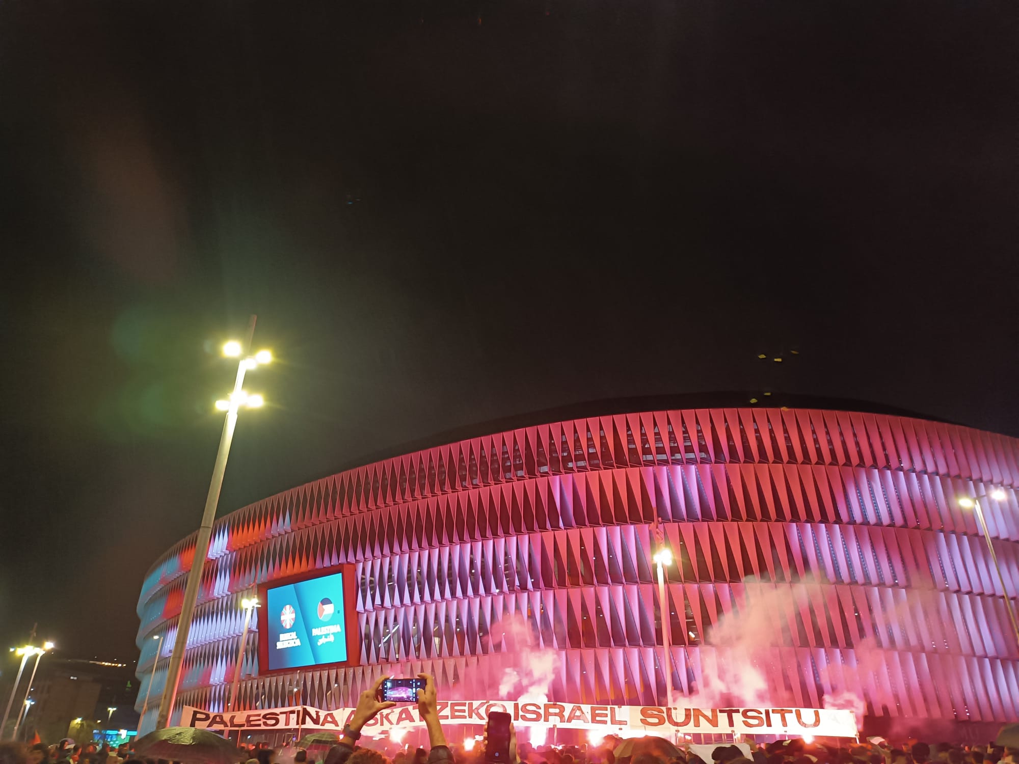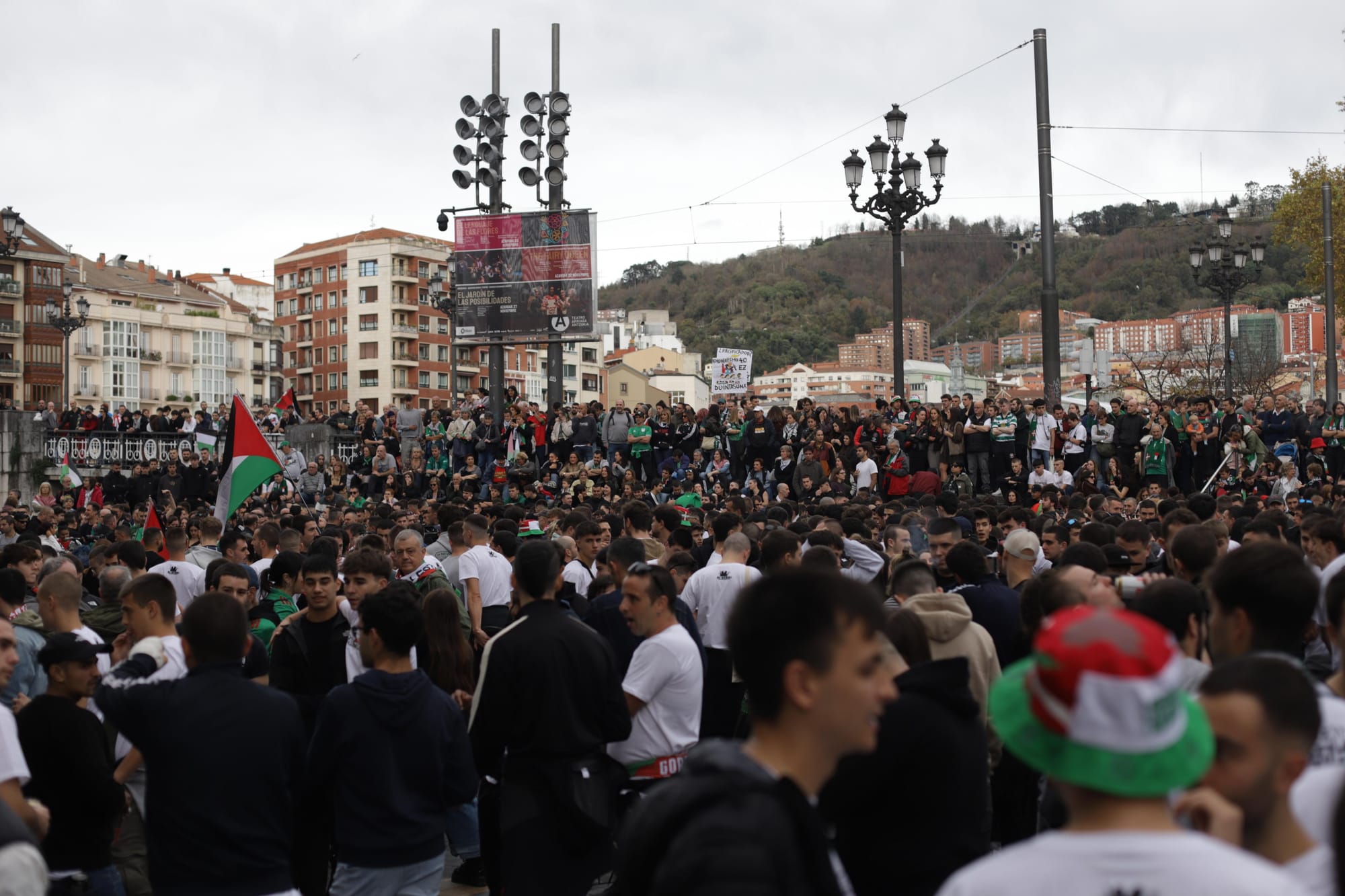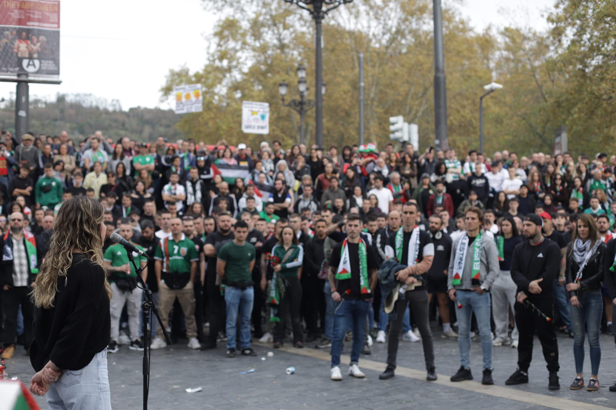Por la tarde, las gradas de aficionados realizaron el pasacalles que suele celebrarse cuando juega la Selección Vasca, pero este año, además de reivindicar la oficialidad de la selección, añadieron una reivindicación más: defendieron la resistencia palestina, de la mano de la plataforma Palestinarekin Elkartasuna.