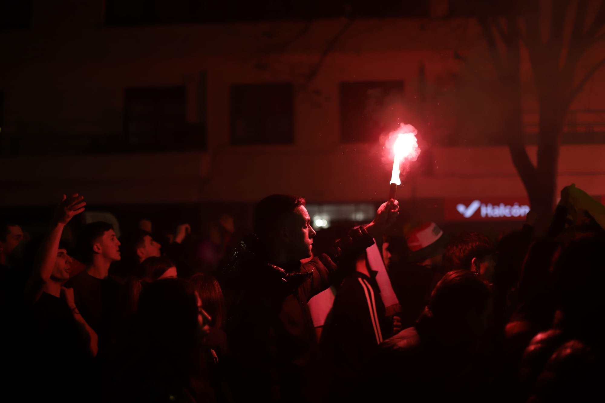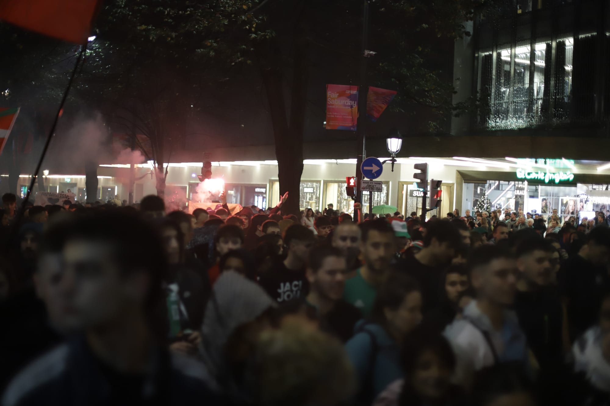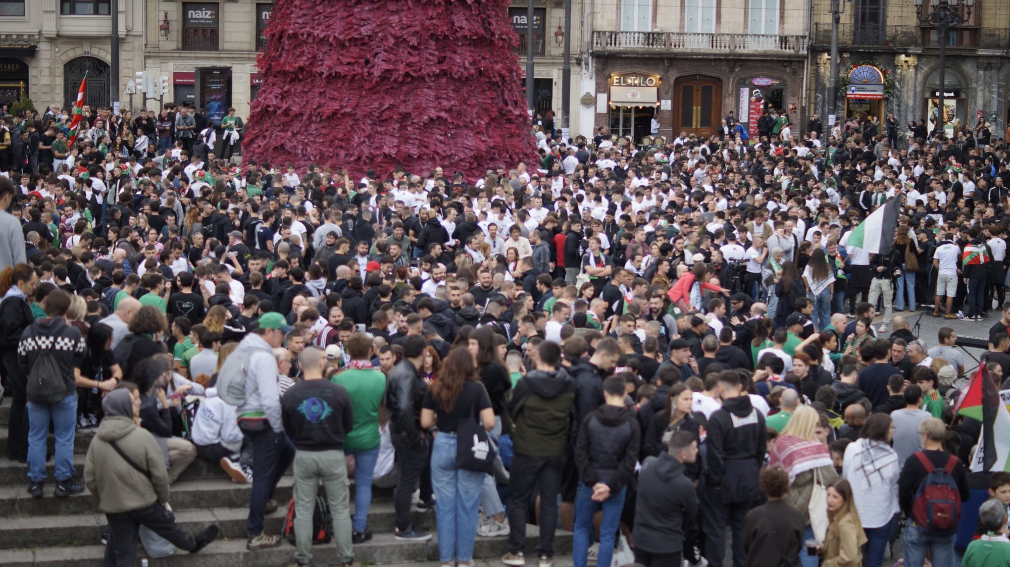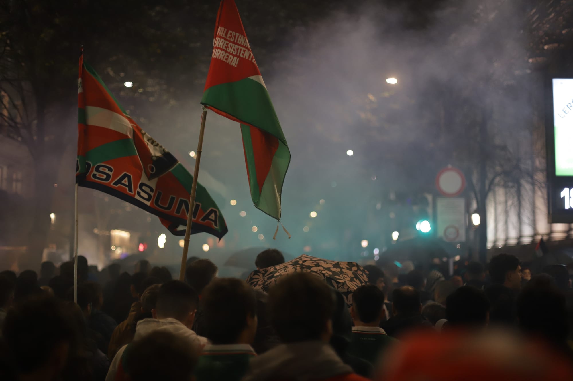 Por la tarde, las gradas de aficionados realizaron el pasacalles que suele celebrarse cuando juega la Selección Vasca, pero este año, además de reivindicar la oficialidad de la selección, añadieron una reivindicación más: defendieron la resistencia palestina, de la mano de la plataforma Palestinarekin Elkartasuna.