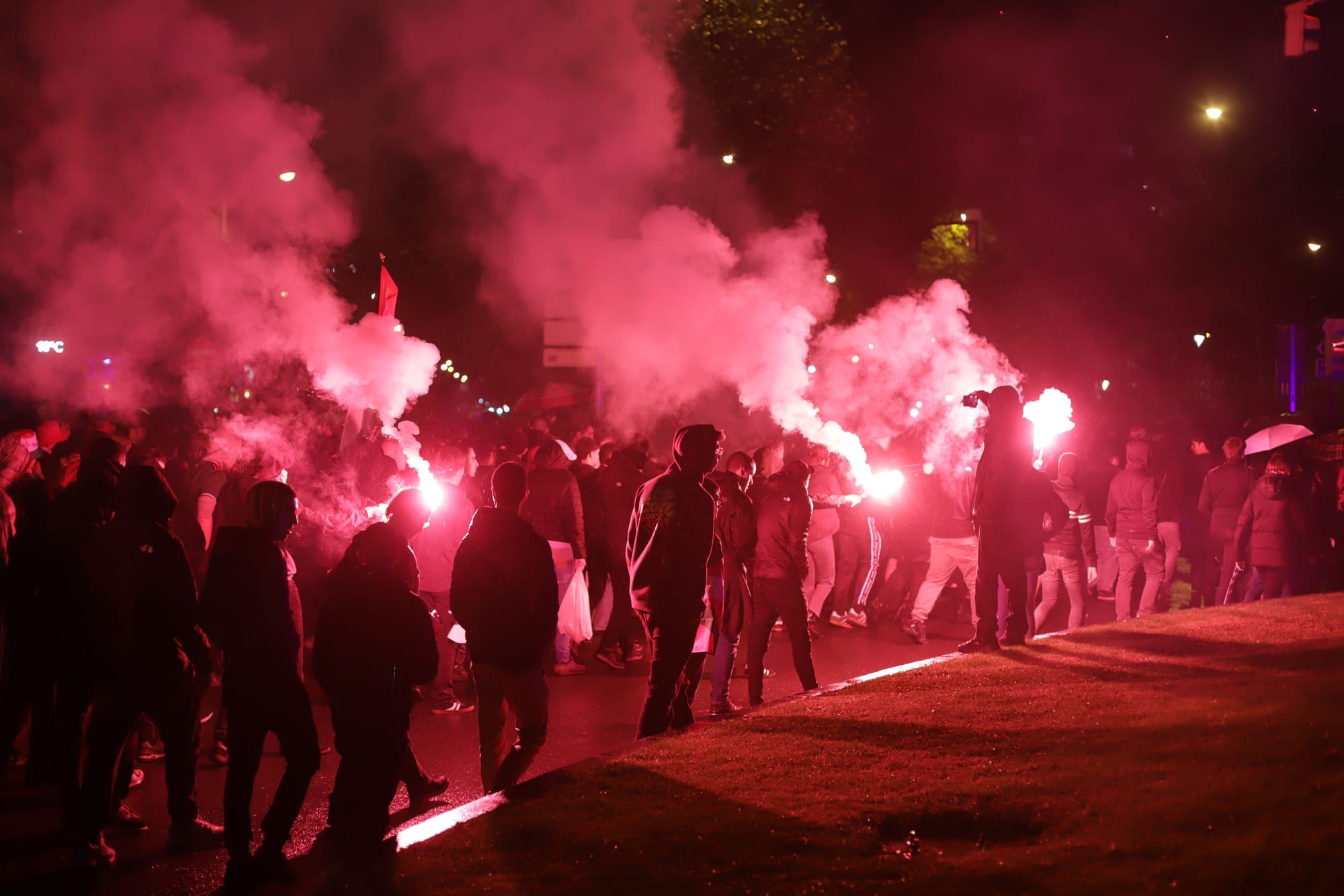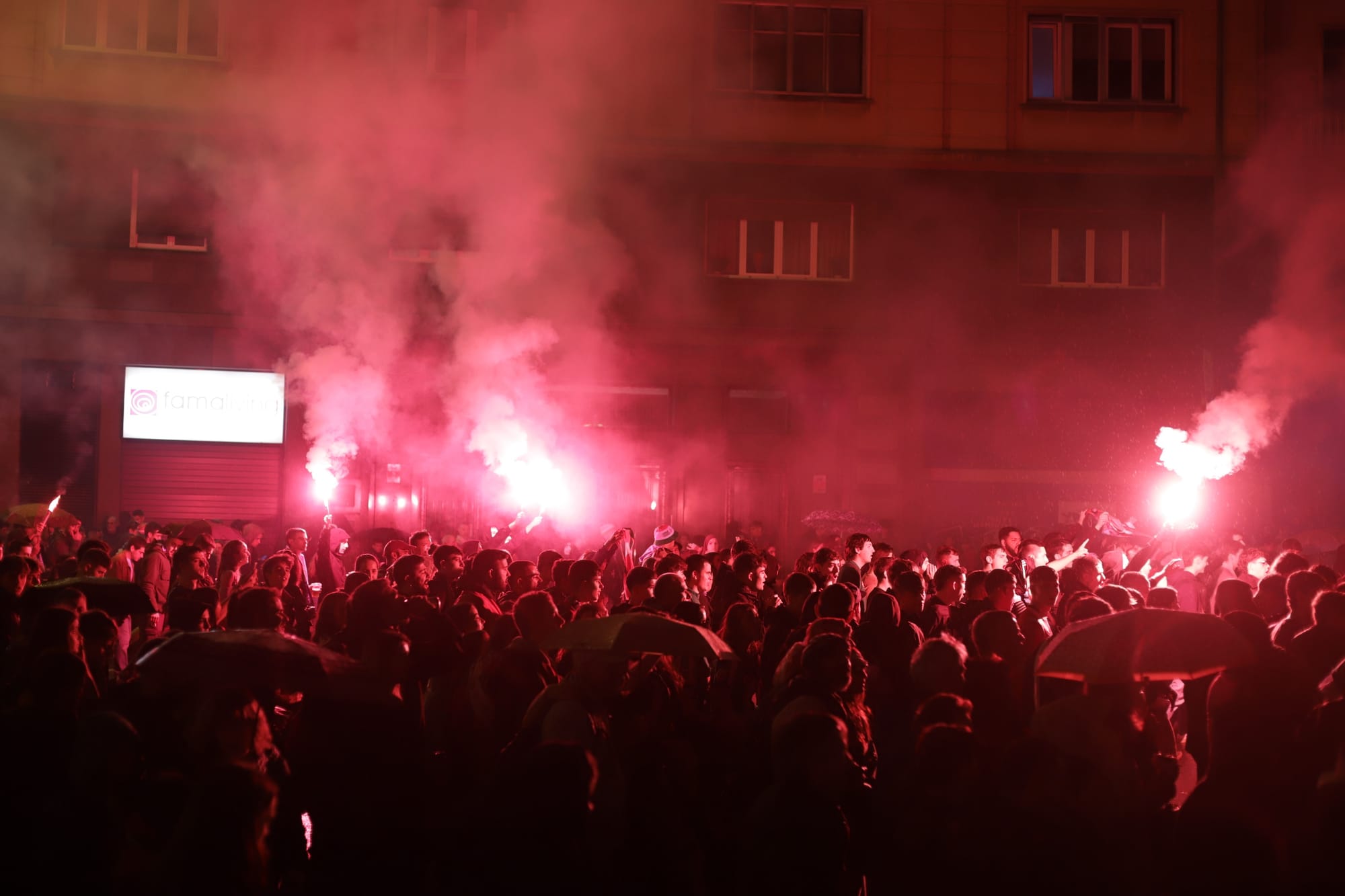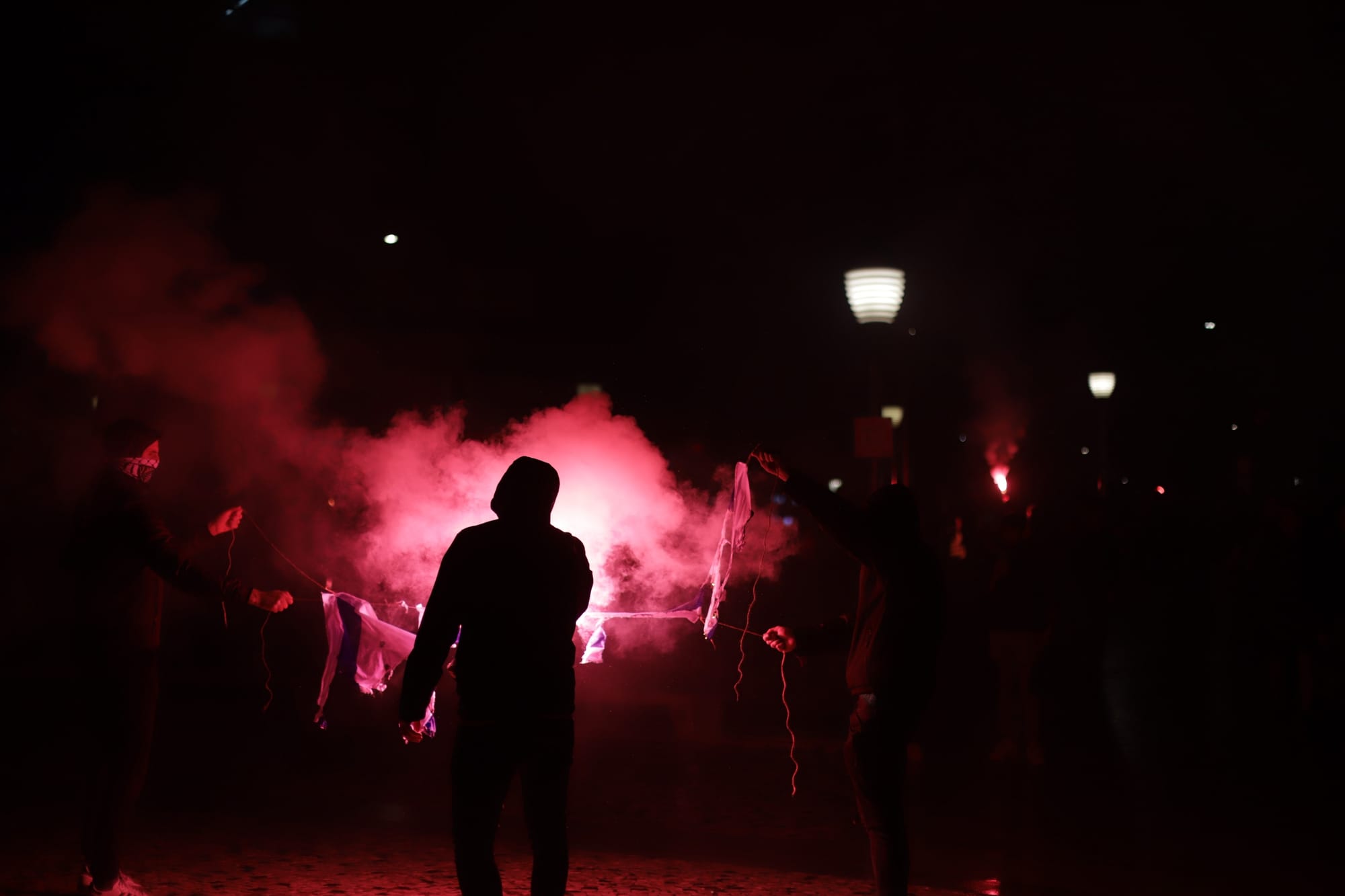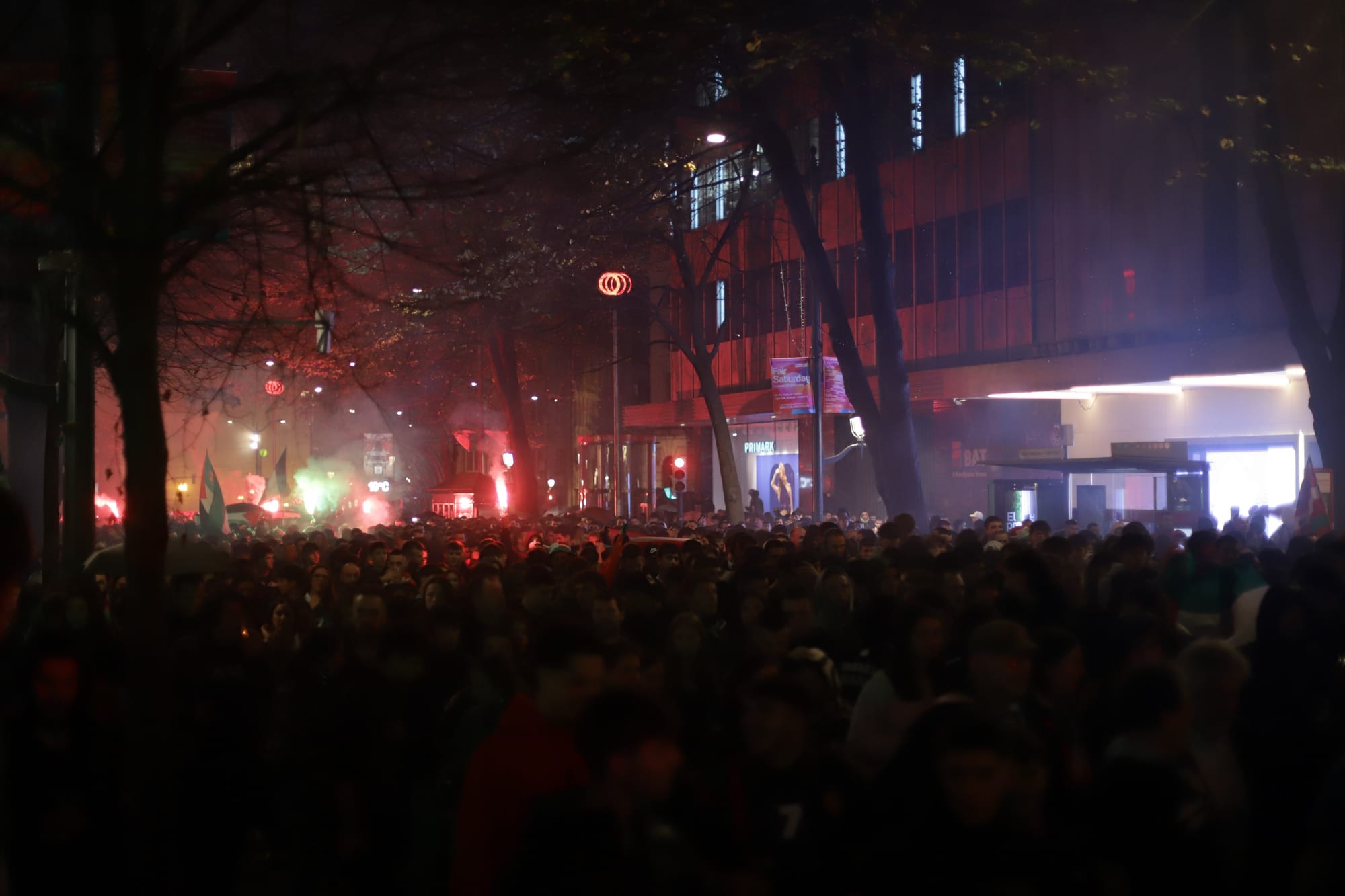 Por la tarde, las gradas de aficionados realizaron el pasacalles que suele celebrarse cuando juega la Selección Vasca, pero este año, además de reivindicar la oficialidad de la selección, añadieron una reivindicación más: defendieron la resistencia palestina, de la mano de la plataforma Palestinarekin Elkartasuna.