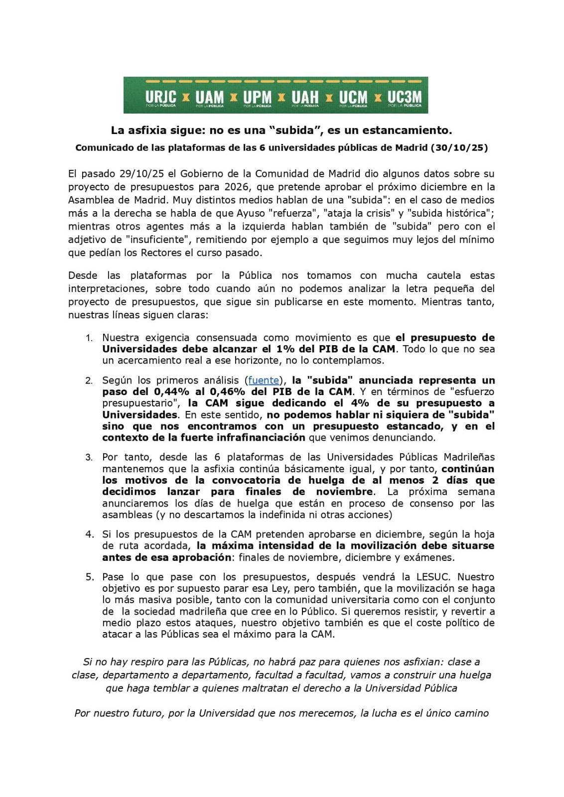 Las plataformas —URJC x UAM x UPM x UAH x UCM x UC3M— advirtieron en su comunicado conjunto del 30 de octubre que la supuesta “subida” anunciada en el proyecto de presupuestos de 2026 es, en realidad, un “estancamiento”. Afirman que, de acuerdo con los primeros análisis, el gasto universitario pasaría del 0,44% al 0,46% del PIB, mientras el esfuerzo presupuestario seguiría siendo del 4% del presupuesto autonómico, cifras que describen como "incompatibles" con un funcionamiento adecuado de las instituciones públicas.