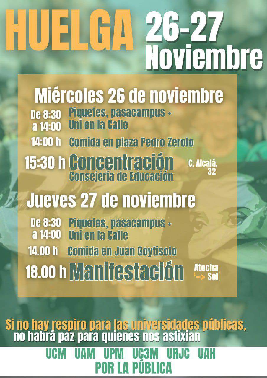 El calendario de la huelga incluye, entre otras actividades, piquetes y actividades de Uni en la Calle desde primera hora de ambos días, una concentración este miércoles a las 15:30 frente a la Consejería de Educación y una manifestación el jueves a las 18:00 entre Atocha y Sol. Las plataformas sostienen que “la asfixia continúa básicamente igual” y llaman a una movilización sostenida ante la futura Ley de Enseñanzas Superiores, Universidades y Ciencia (LESUC), insistiendo en que “si no hay respiro para las públicas, no habrá paz para quienes nos asfixian”.