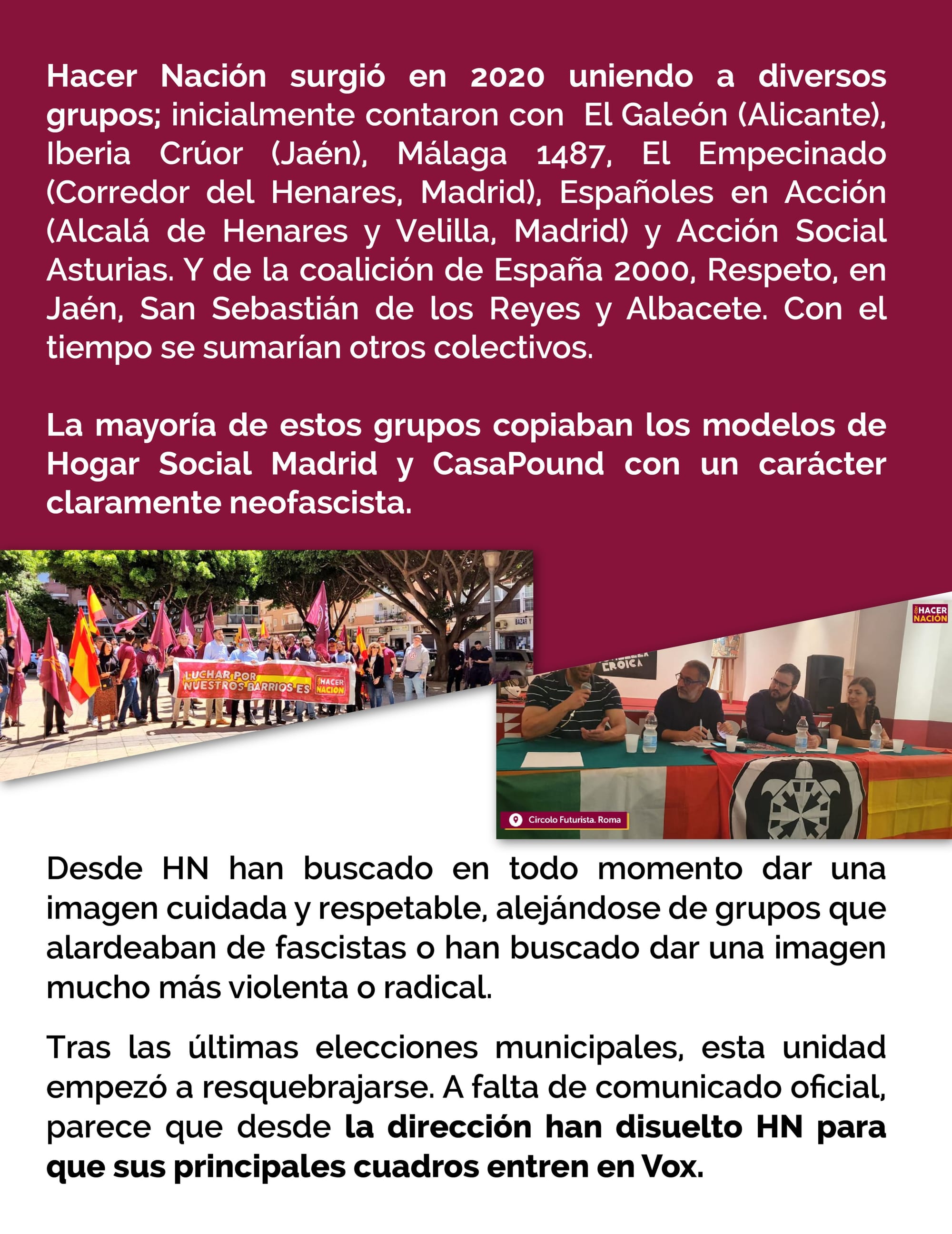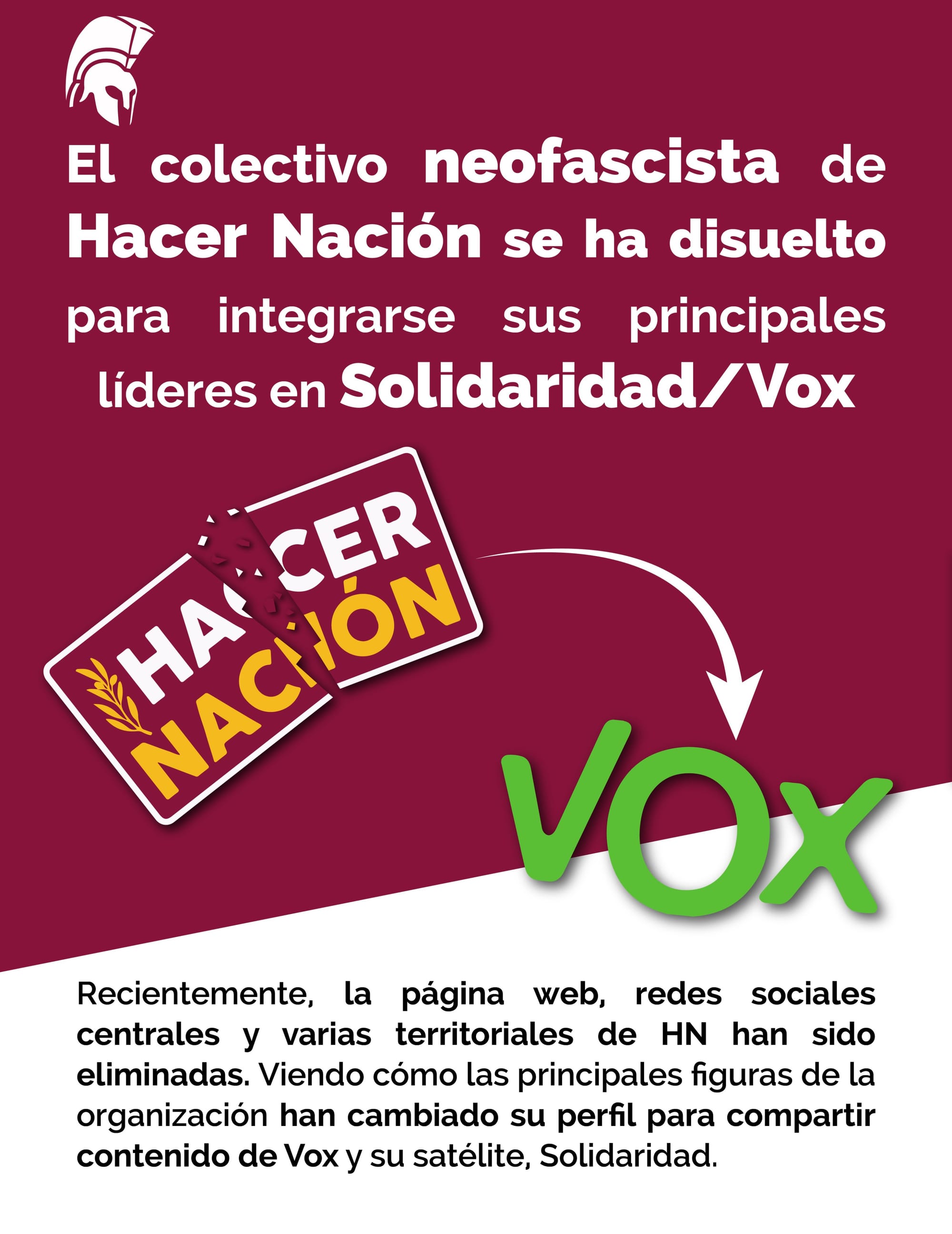 Según informó el blog de investigación antifascista Sistema 161 este miércoles, la organización fascista Hacer Nación (HN) ha eliminado su página web, redes sociales centrales, aunque algunos perfiles de secciones territoriales se mantienen. Además, las principales figuras de la organización han cambiado su perfil y han pasado a compartir contenido de Vox y su satélite "sindical", Solidaridad.