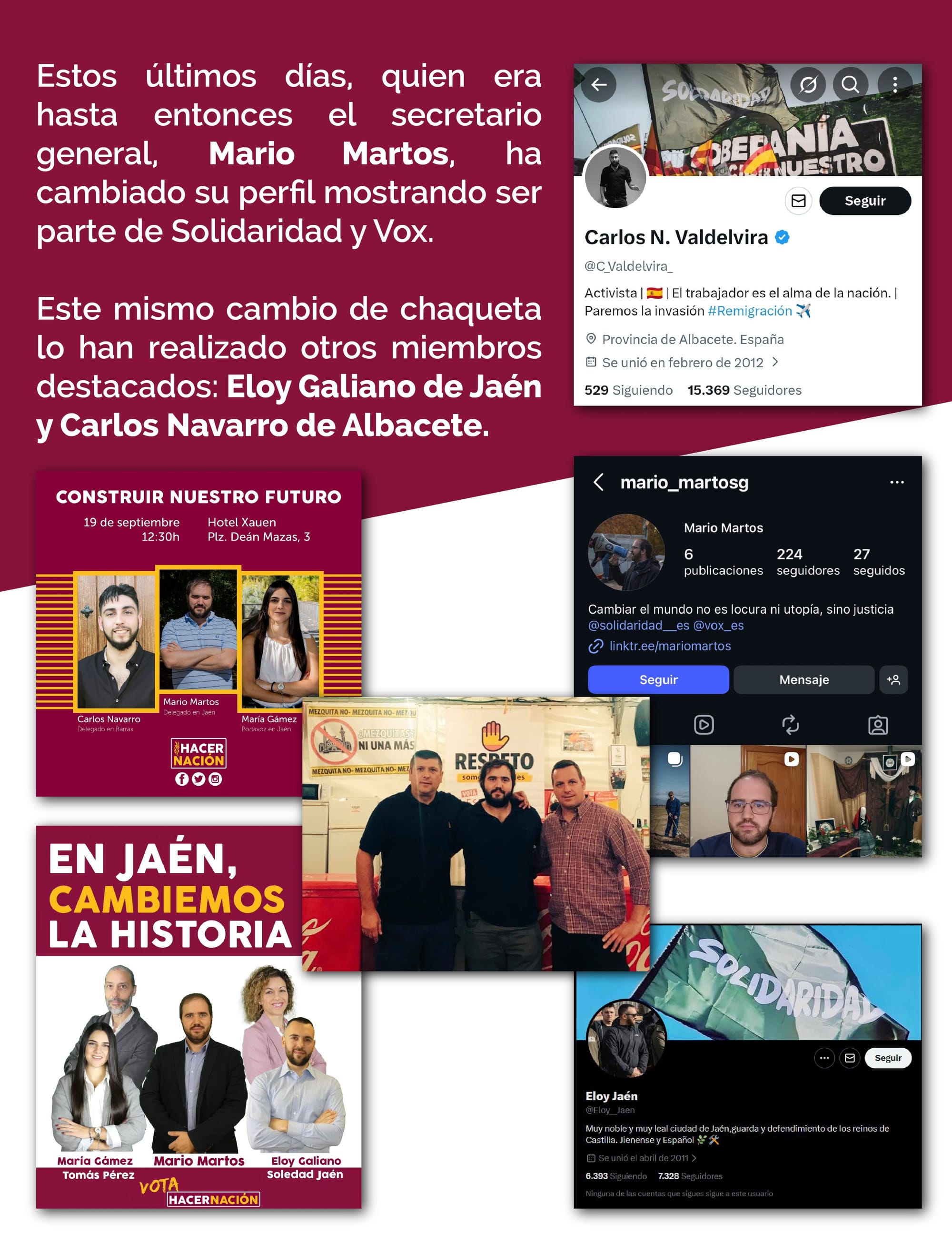 En concreto, quien hasta hace poco era secretario general de HN, Mario Martos, ha cambiado su perfil en redes sociales y ahora se declara como miembro de Solidaridad y Vox. Otros miembros destacados como Eloy Galiano de Jaén y Carlos Navarro de Albacete también habrían "cambiado de chaqueta". Sistema 161 remarca que la mayoría que la militancia de HN proviene de España 2000 y de la coalición Respeto, con escaso éxito electoral.