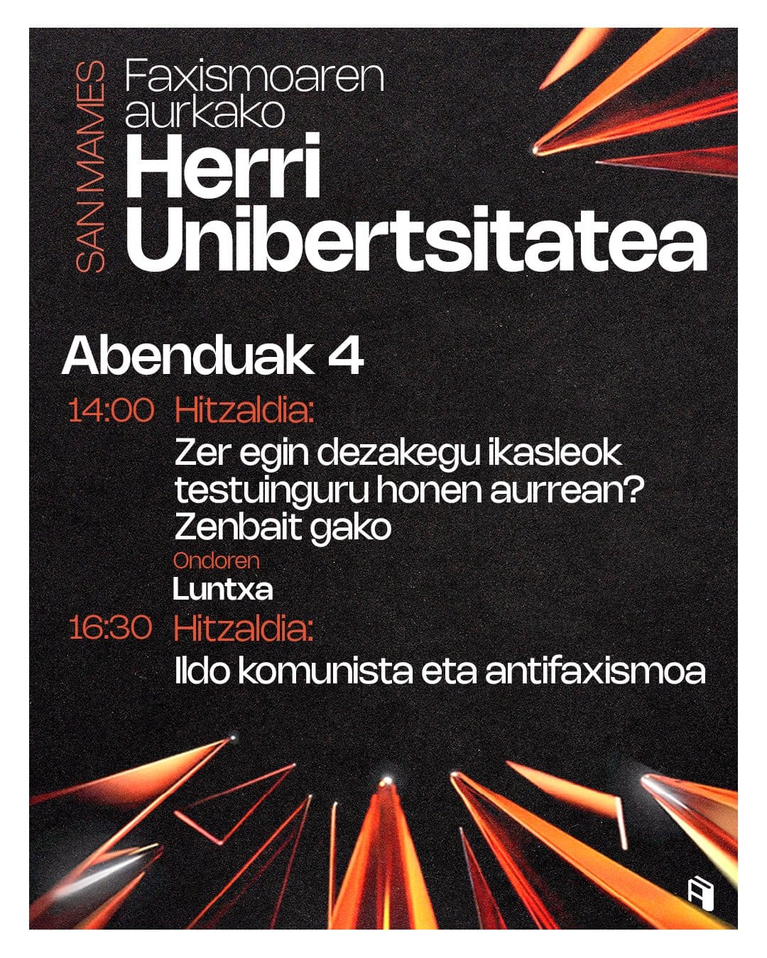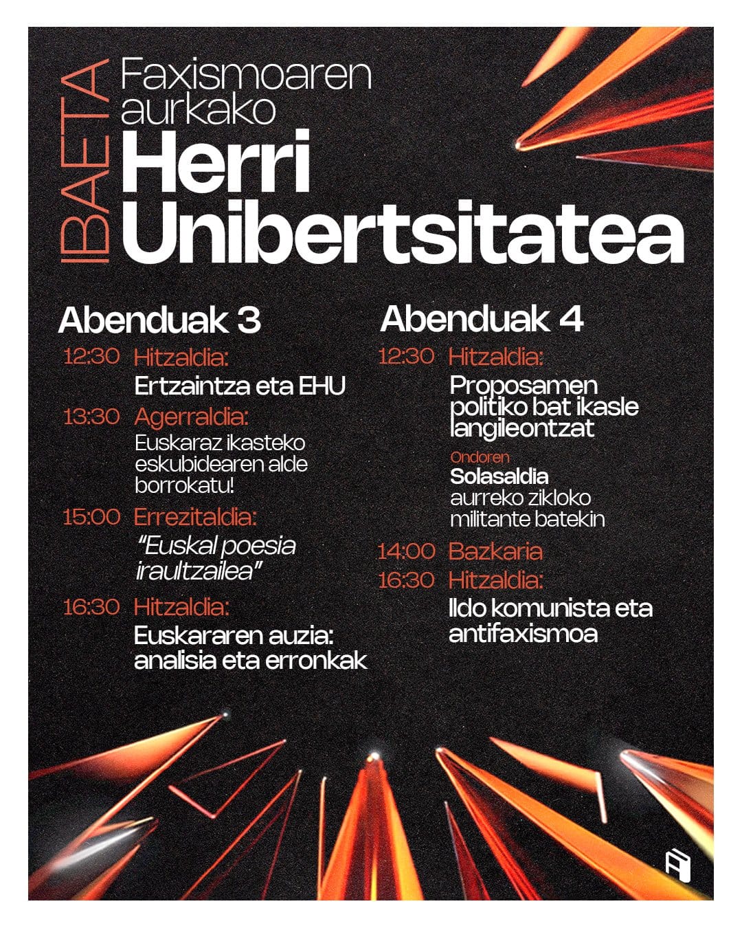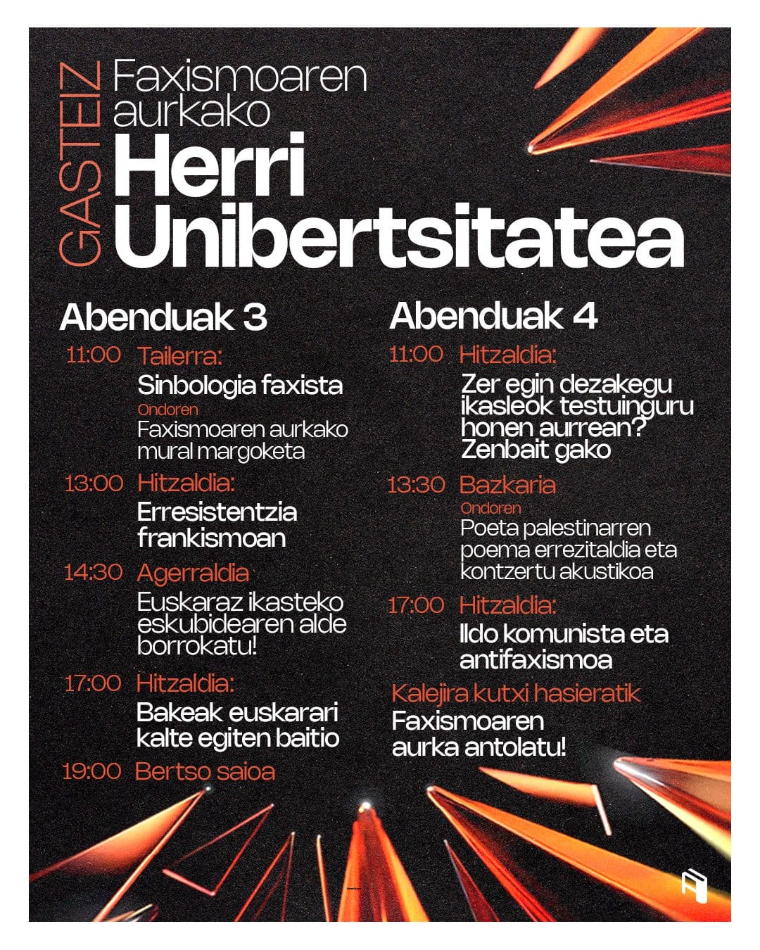 "Es imprescindible difundir las ideas antifascistas entre el alumnado. Para ello hemos organizado varias charlas, poniendo en el centro el debate estudiantil y la formación política", han explicado los organizadores de las Herri Unibertsitateak (Universidades Populares). Este año, más allá de las fechas habituales, han organizado los programas para diciembre en siete campus de Euskal Herria: las Herri Unibertsitateak Contra el Fascismo.