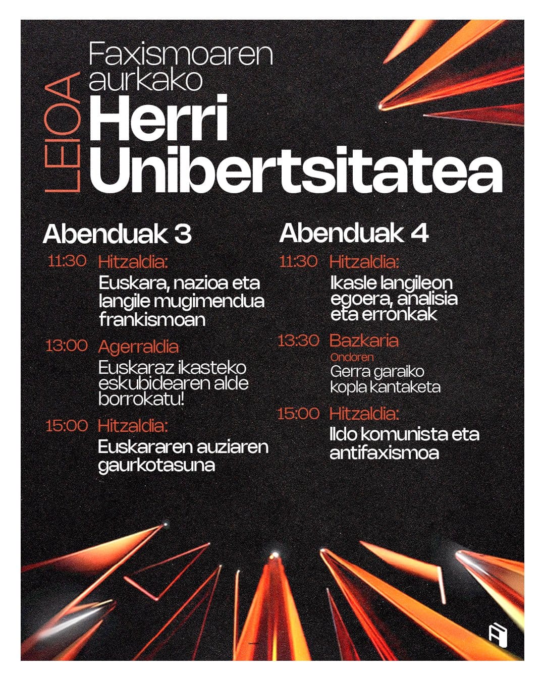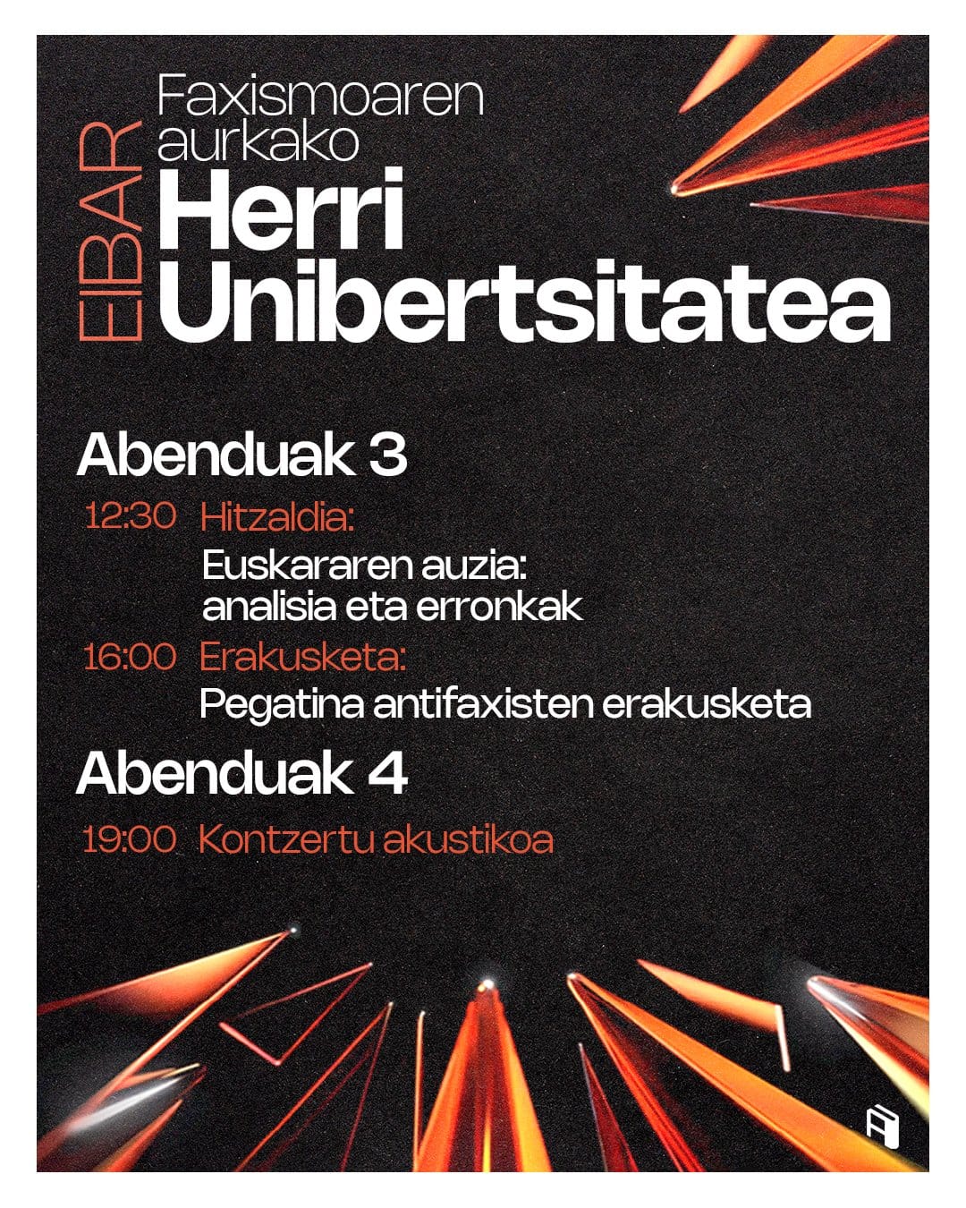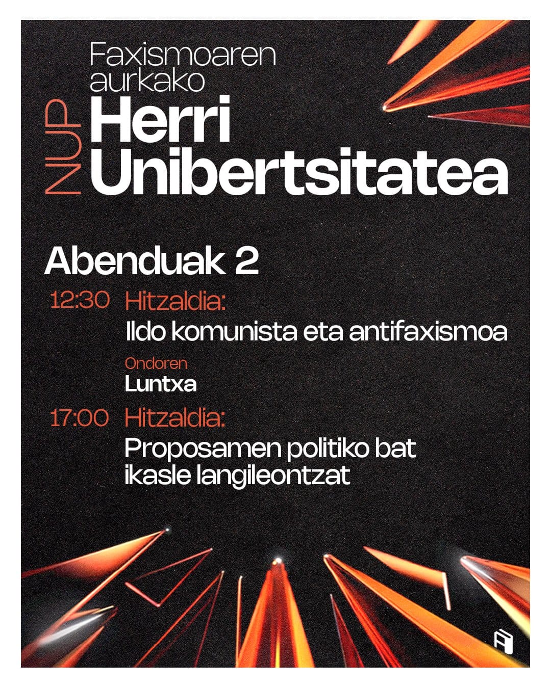 "Es imprescindible difundir las ideas antifascistas entre el alumnado. Para ello hemos organizado varias charlas, poniendo en el centro el debate estudiantil y la formación política", han explicado los organizadores de las Herri Unibertsitateak (Universidades Populares). Este año, más allá de las fechas habituales, han organizado los programas para diciembre en siete campus de Euskal Herria: las Herri Unibertsitateak Contra el Fascismo.