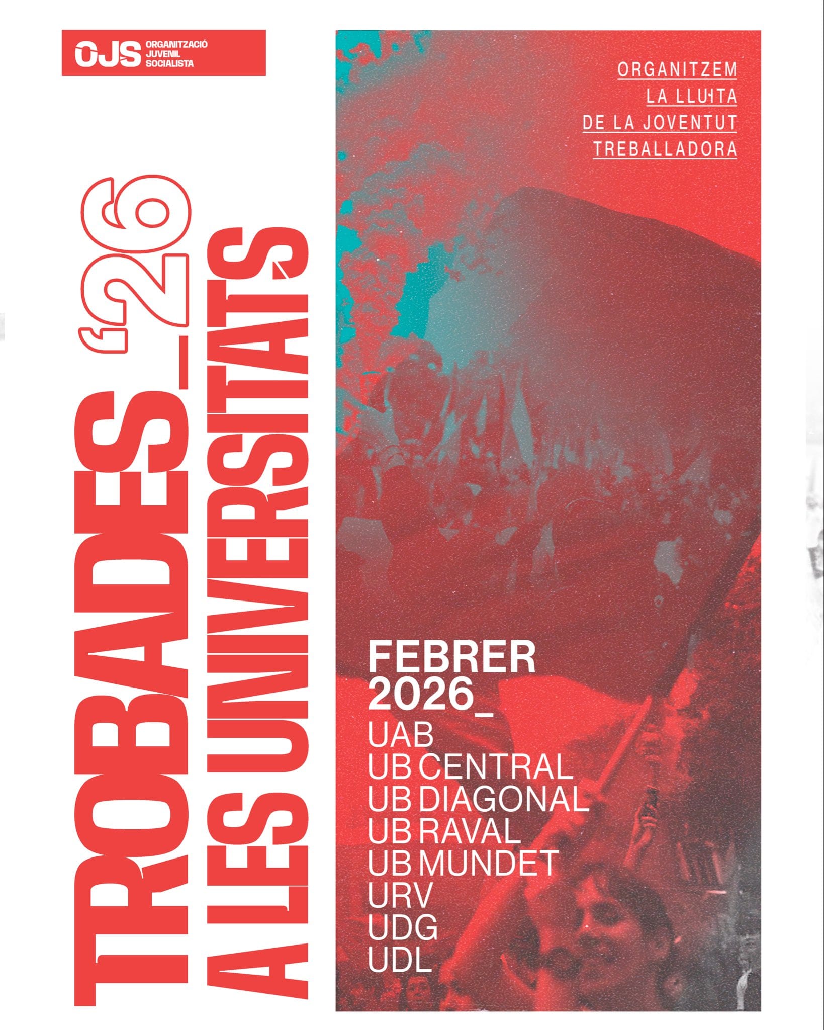 La Organització Juvenil Socialista de Catalunya (OJS) ha anunciado la puesta en marcha de las Trobades’26 a les Universitats, una serie de espacios de encuentro que se celebrarán entre diciembre y febrero en centros como la UAB, UB (Central, Diagonal, Raval y Mundet), URV, UDG y UDL. Según la organización juvenil del Moviment Socialista, su objetivo es organizar la lucha de la juventud trabajadora mediante actividades de formación política y debate. La iniciativa ha sido presentada públicamente a través de un cartel publicado sus redes sociales, donde se detallan las primeras fechas y campus donde tendrán lugar las trobades.