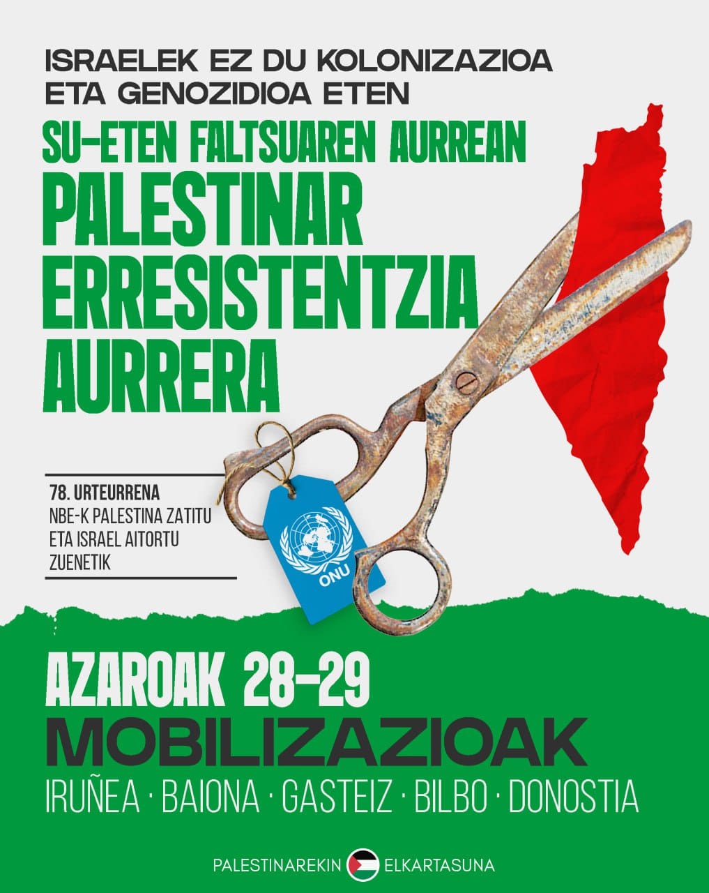 La plataforma Palestinarekin Elkartasuna volverá a realizar movilizaciones este fin de semana en apoyo a la resistencia palestina. Ha convocado manifestaciones en las cinco capitales de Euskal Herria para denunciar, por un lado, el “alto el fuego falso” que “Israel ha roto desde el primer momento”; y por otro, para denunciar la “hipocresía” de Naciones Unidas y del resto de instituciones internacionales con motivo del aniversario del plan de partición impuesto por la ONU en 1947.