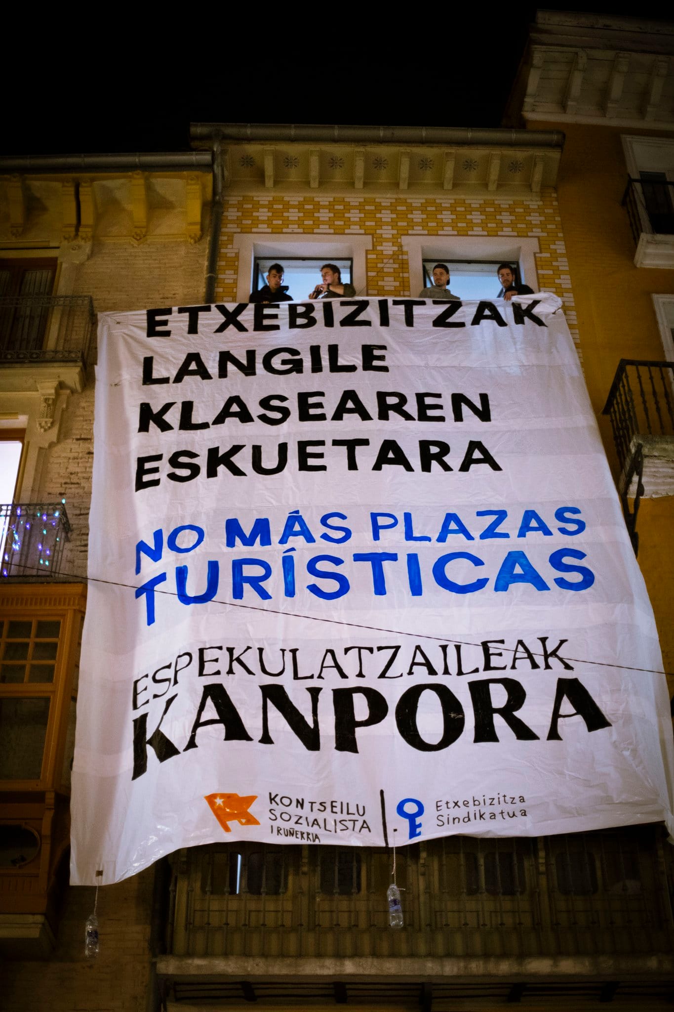 La marcha partió a las 18:00 horas de la Plaza de Recoletas y recorrió las principales vías del Casco Viejo, finalizando frente al portal número 18 de la calle Mercaderes. Allí, los manifestantes señalaron directamente el edificio propiedad de Vidaurre Group, cuya intención es transformar las 11 viviendas en un bloque íntegramente turístico. Los vecinos llevan meses resistiendo prácticas de acoso inmobiliario: obras innecesarias e interminables, averías no reparadas como la falta de agua caliente o el ascensor inutilizado, todo para forzar su salida.
