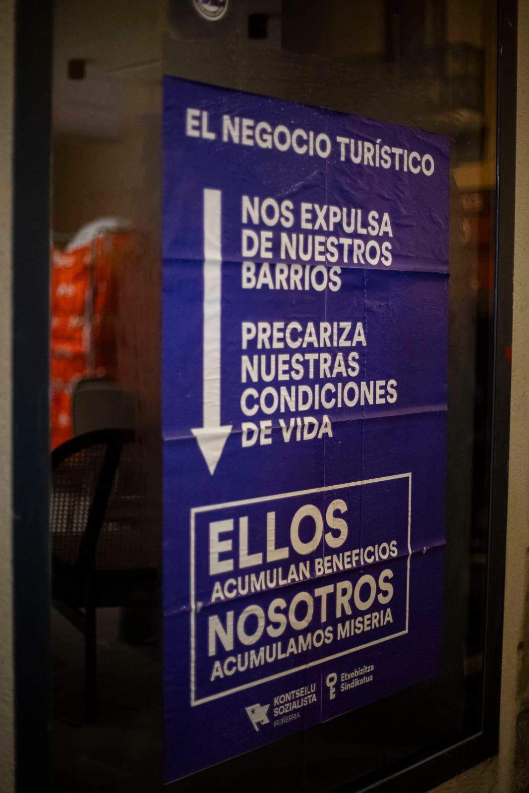 Durante el recorrido, los participantes colocaron pegatinas y carteles en establecimientos turísticos, especialmente en la calle Eslava, para visibilizar cómo el modelo turístico destruye redes comunitarias, empeora las condiciones de vida y expulsa a los residentes habituales. En la intervención final, se destacó que en el Casco Viejo ya hay 225 viviendas turísticas registradas, una de cada 30 casas, sin contar las plazas en hoteles y albergues. “Lo de Mercaderes 18 no es un caso aislado, es el reflejo de un barrio orientado al negocio”, afirmaron los portavoces.