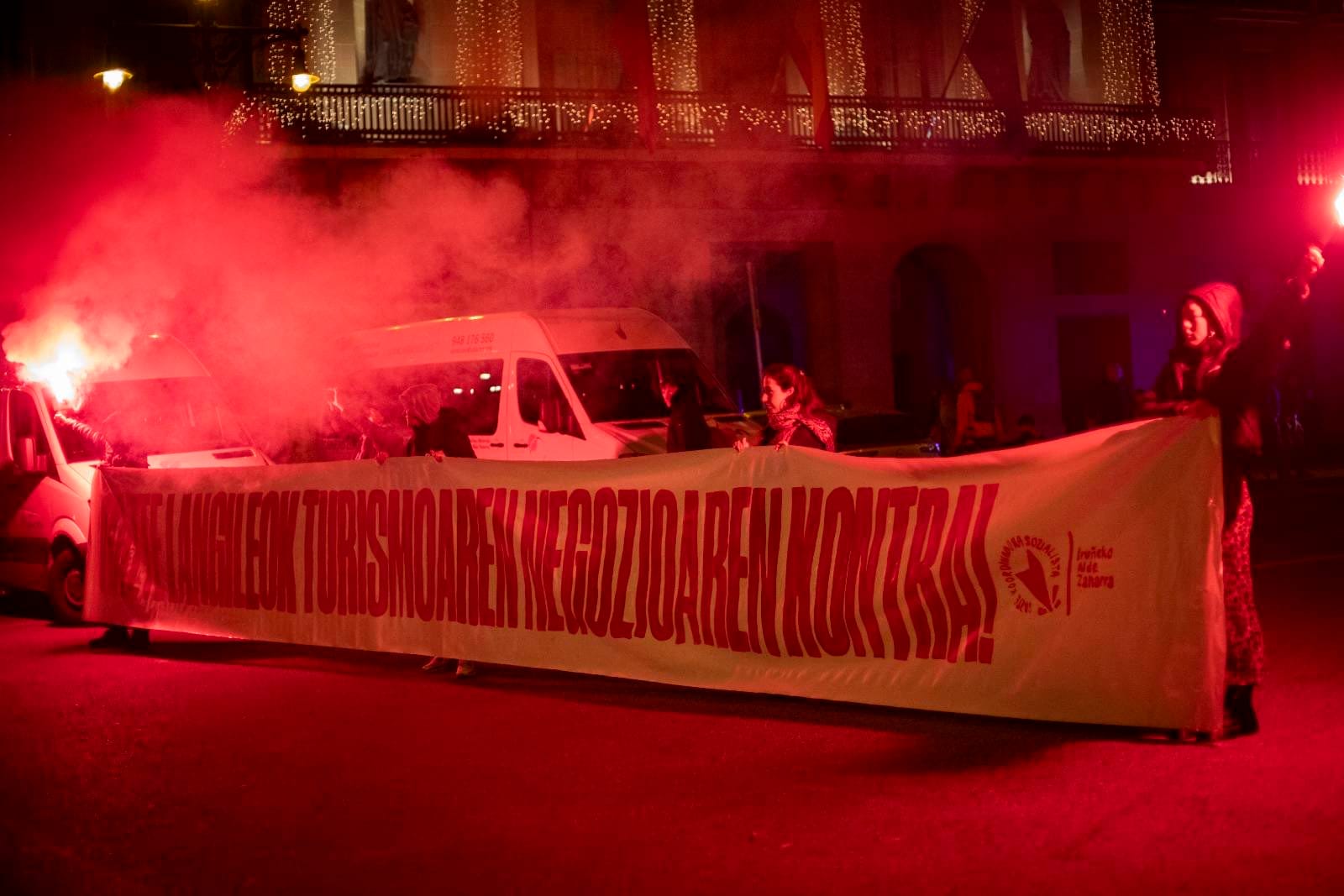 Se mencionaron otros proyectos en marcha que agravan la situación: el bloque turístico ya operativo en Eslava 13, el futuro hostal en San Agustín o el macro-hostel Unzu en Mercaderes, que sería el mayor del barrio. Todo ello representa “un chollo para especuladores y miseria para la clase trabajadora”, según los convocantes, que criticaron la permisividad municipal del consistorio liderado por EH Bildu al aprobar licencias en tramitación, pese a la suspensión de nuevas autorizaciones anunciada a finales de 2024.