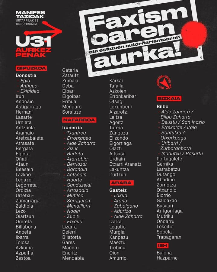Ha organizado manifestaciones para el 31 de enero en Iruñea y Bilbo. Durante las próximas semanas, celebrará presentaciones en múltiples pueblos y barrios de Euskal Herria.
