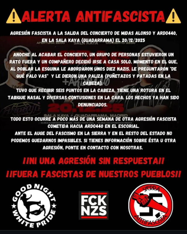 En la noche del 20 de diciembre, la Sierra de Guadarrama vivió un nuevo capítulo de violencia nazi cuando un grupo de unos diez personas agredió brutalmente a un joven a la salida del concierto de Midas Alonso y Ardo440 en la Sala Kaya de Guadarrama. La víctima, que decidió regresar sola a su domicilio tras la actuación, fue abordada al doblar una esquina por los atacantes, quienes tras preguntarle “¿de qué palo vas?” empezaron a propinarle una paliza concentrada con puñetazos y patadas a la cabeza.