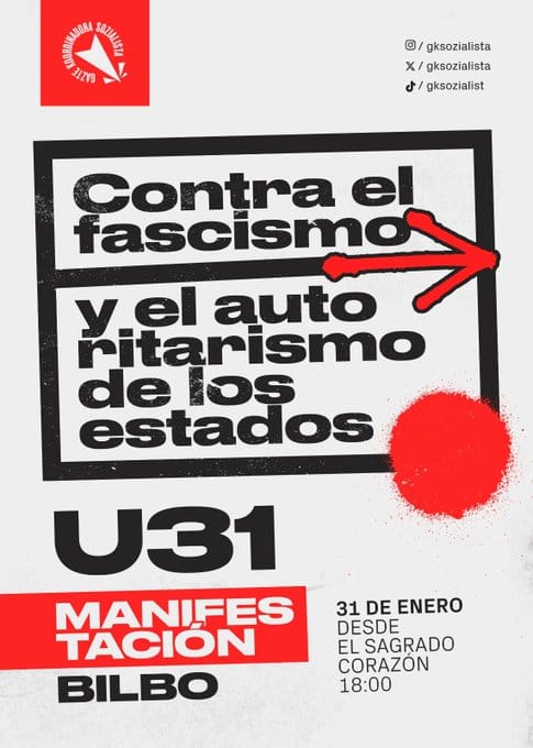 Gazte Koordinadora Sozialista (GKS) ha lanzado un fuerte llamamiento a la movilización para el próximo 31 de enero bajo el lema "contra el fascismo y el autoritarismo de los estados". Las manifestaciones tendrán lugar en Bilbo (Bizkaia) e Iruñea (Nafarroa) y la coordinadora ya ha dado cuenta de horas y puntos de partida concretos. Ambas movilizaciones partirán al anochecer; a las 18:00 horas la de Bilbo, saliendo del Sagrado Corazón, y a las 18:30 horas la de Iruñea, frente al Monumento franquista a los Caídos.