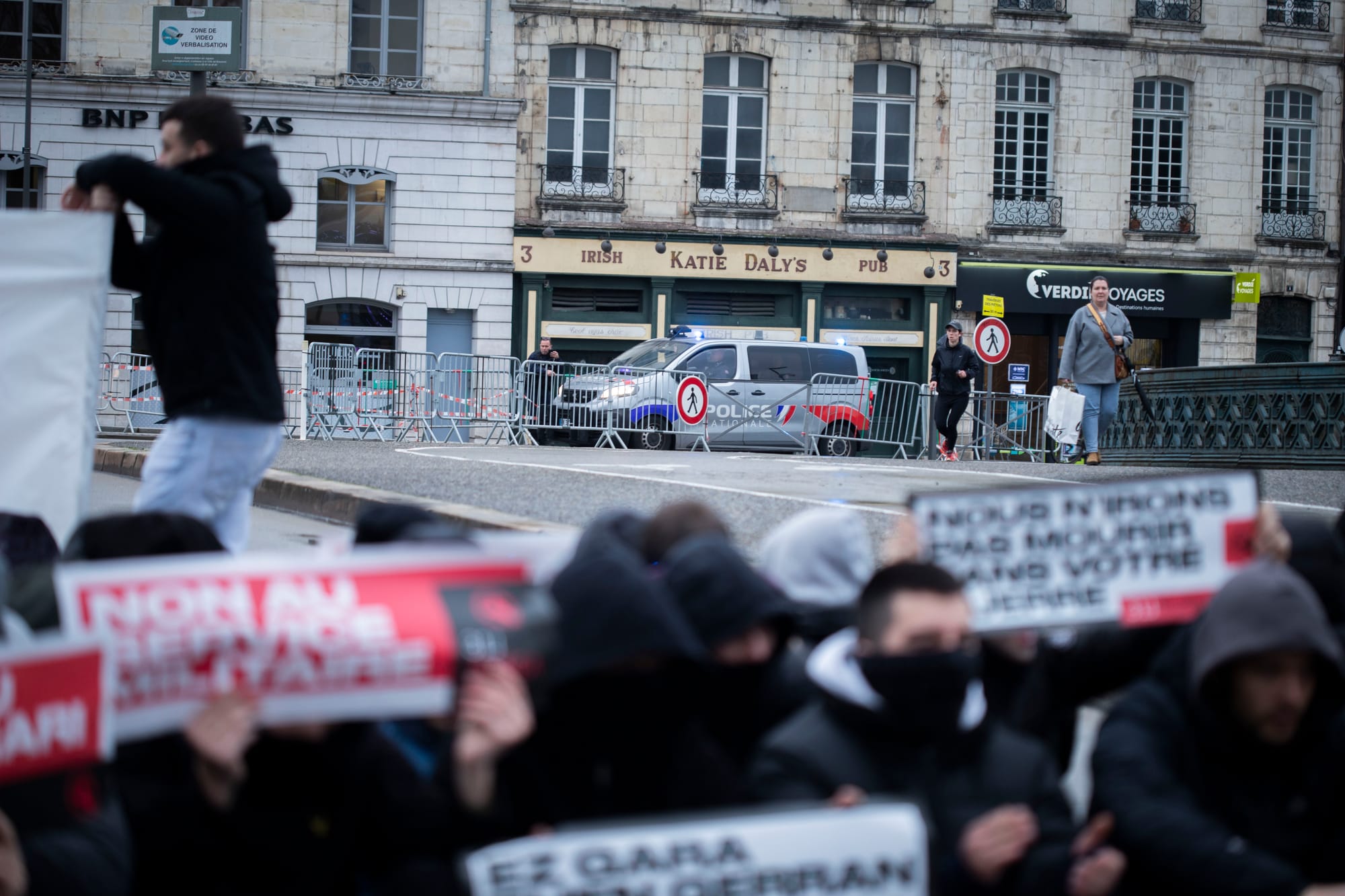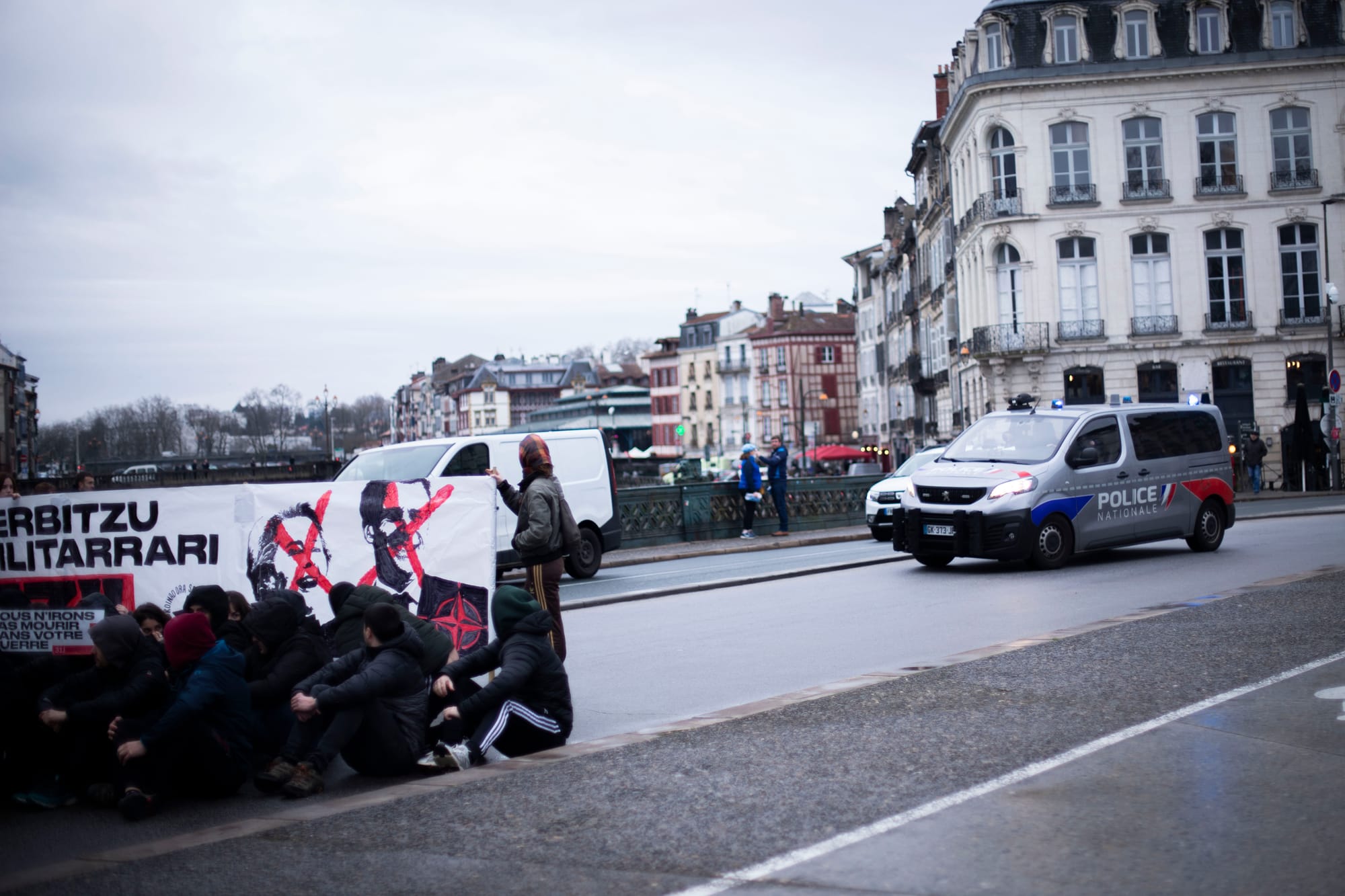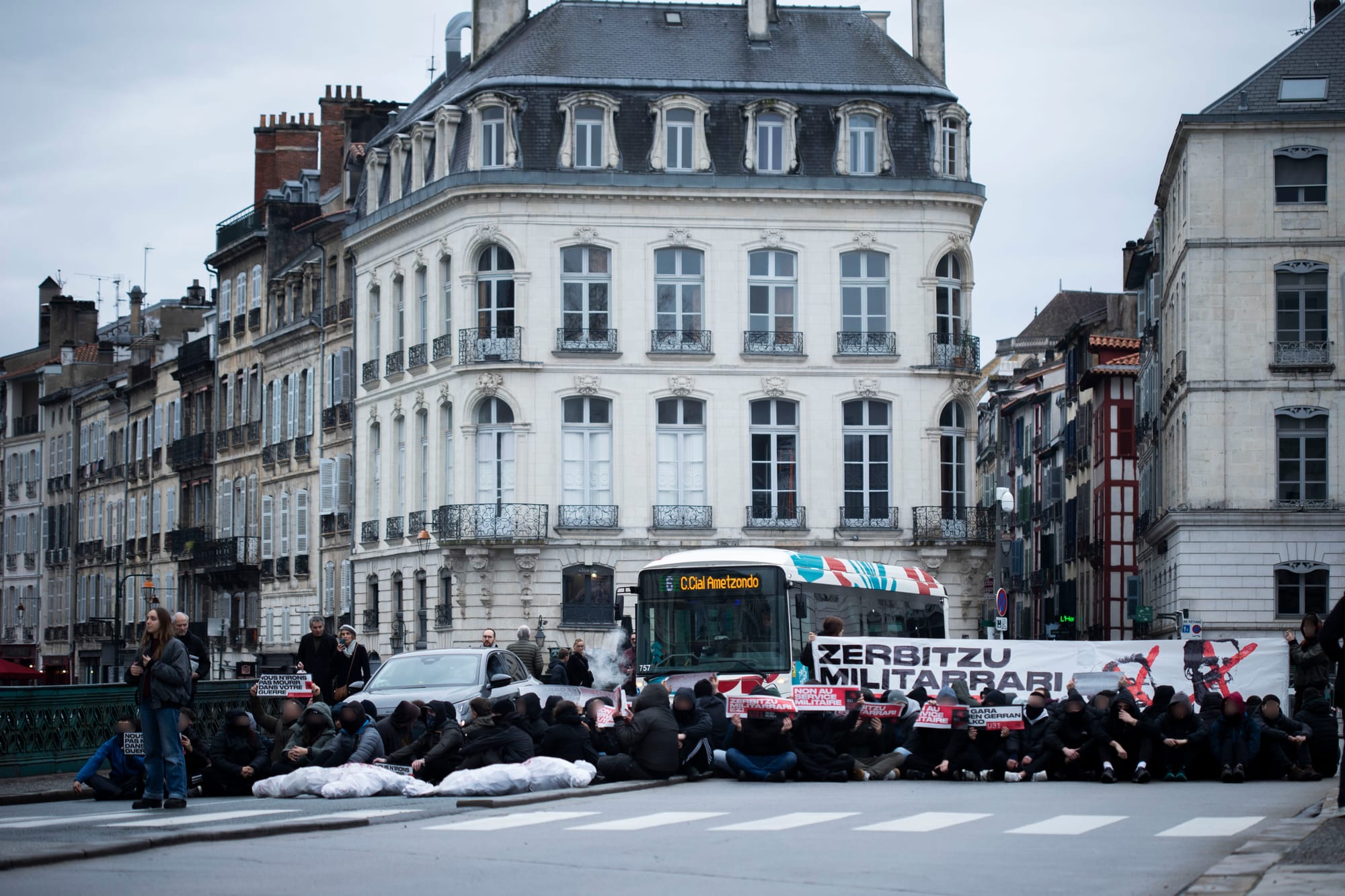 La Gazte Koordinadora Sozialista (GKS) llevó a cabo el sábado por la mañana una acción de protesta de ámbito nacional en Baiona (Lapurdi) para denunciar el modelo de servicio militar que se está imponiendo en el Estado francés. Varios jóvenes han cortado el puente frente al Ayuntamiento con una pancarta en la que se leía "¡No al servicio militar!". Durante el corte de carretera se han escuchado consignas contra la OTAN, la Unión Europea y el Gobierno francés, y los manifestantes han coreado con fuerza: "Hacer frente al servicio militar. Hacer frente a la guerra de los capitalistas".
