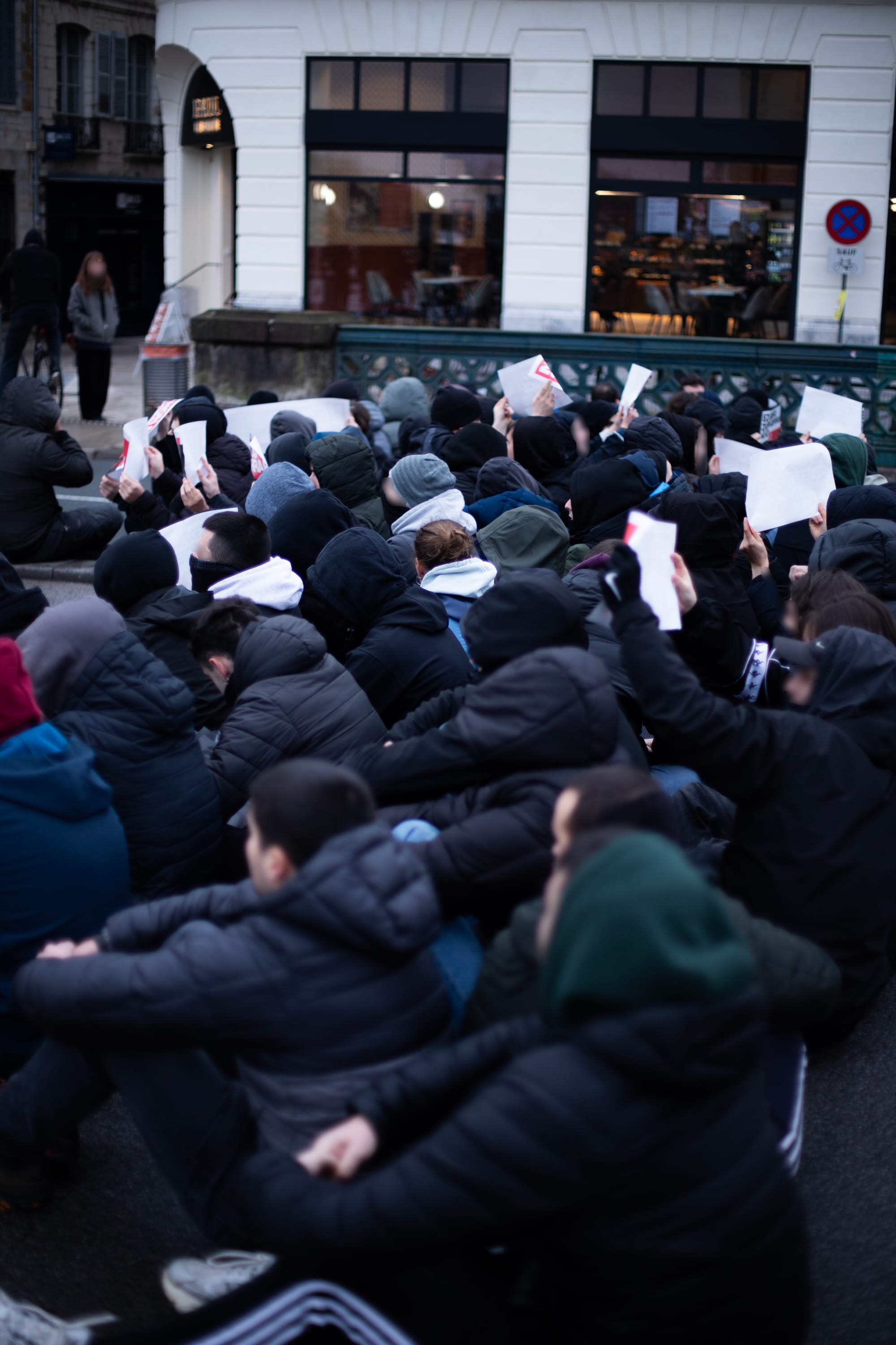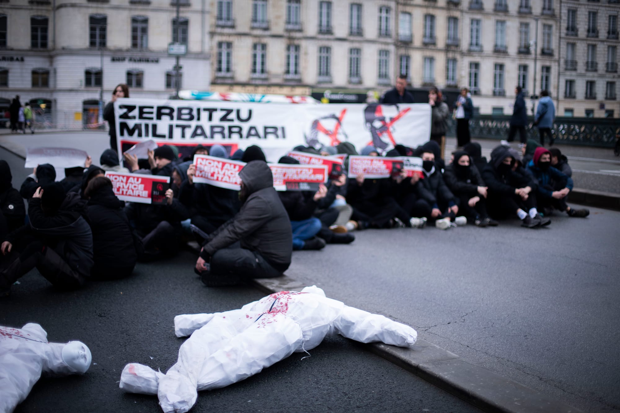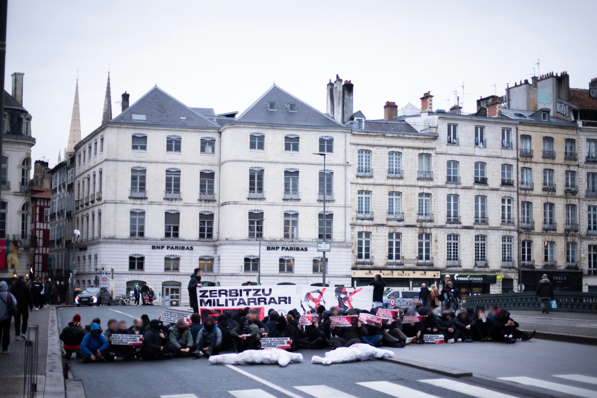 Baionako herriko etxearen parean eserialdia egin dugu Frantziak ezarri nahi duen soldaduskaren aurkako mezua zabaltzeko.