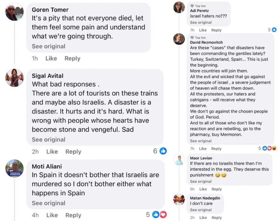 Publicaciones en secciones de comentarios en la prensa israelí que cubre el accidente ferroviario en el Estado español han recogido mensajes que celebran la tragedia y la vinculan al "antisemitismo". Según capturas de pantalla y traducciones automáticas consultadas, algunos usuarios escriben "Castigo del cielo a los antisemitas" o "Qué pena que solo sean siete". Otro responde: "Antisemitas. Es una final". Aunque también hay comentarios más explícitos en su desprecio hacia la sociedad española en su conjunto. Un usuario llamado Maor Levian afirma: "Si no hay israelíes allí, entonces estoy interesado en el huevo. Ellos merecen este castigo".