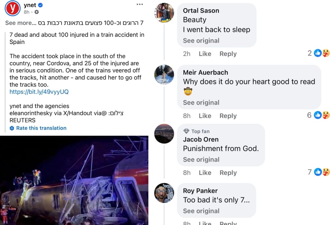 Estas reacciones, surgidas en la caja de comentarios del perfil del medio israelí Ynet, se producen en medio del dolor tras el accidente ferroviario en Córdoba, cuyas causas técnicas siguen bajo investigación por las autoridades españolas.