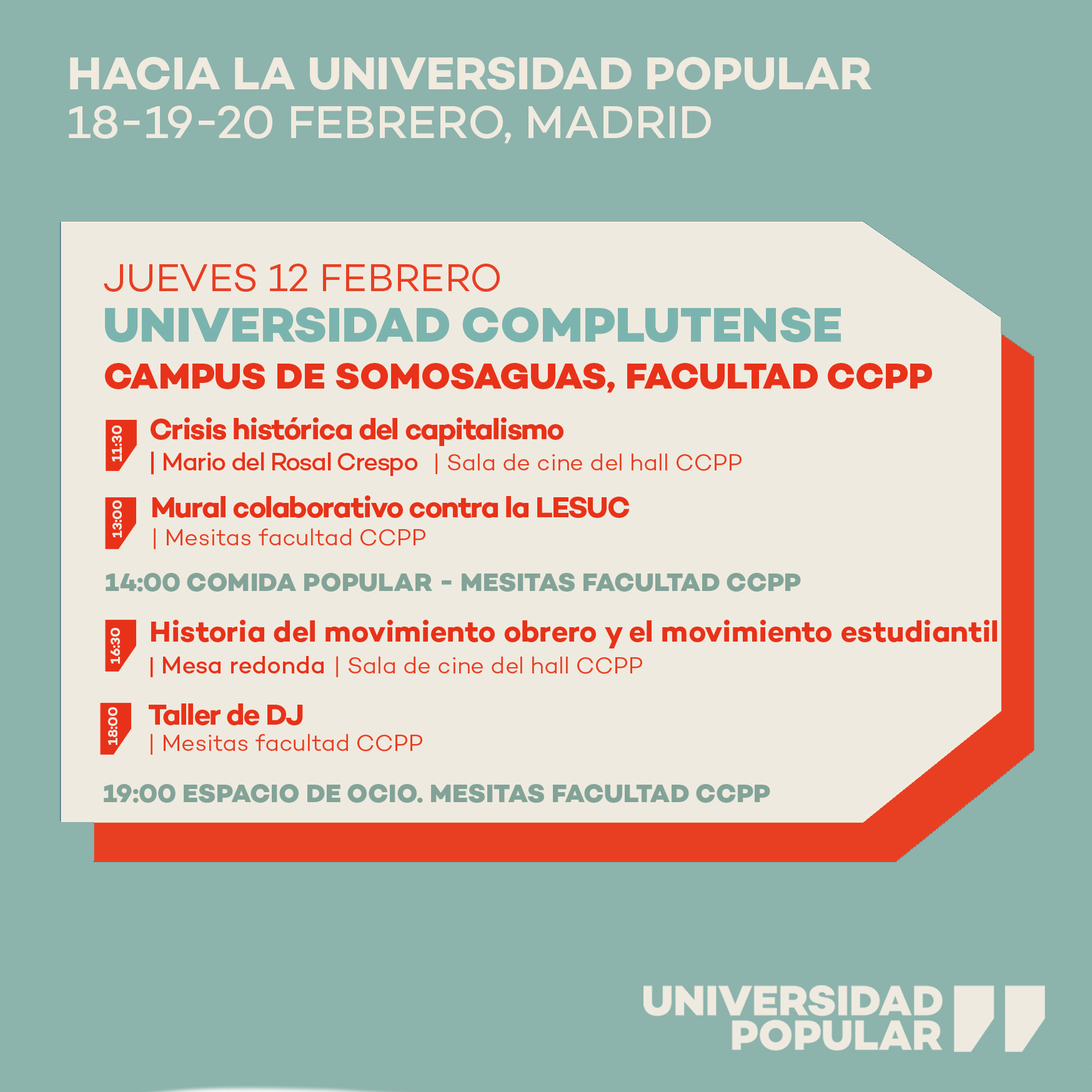 Estos actos locales funcionan como preludio del programa principal que tendrá lugar en Madrid. Según información previa difundida por los organizadores, las jornadas madrileñas incluirán formación política, charlas sobre temas como el fascismo, la crisis ecológica o la causa palestina, actividades culturales y una manifestación el 19 de febrero contra la ley de universidades que prepara el Gobierno de la Comunidad de Madrid presidido por Isabel Díaz Ayuso.