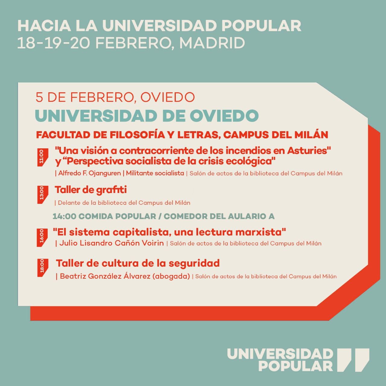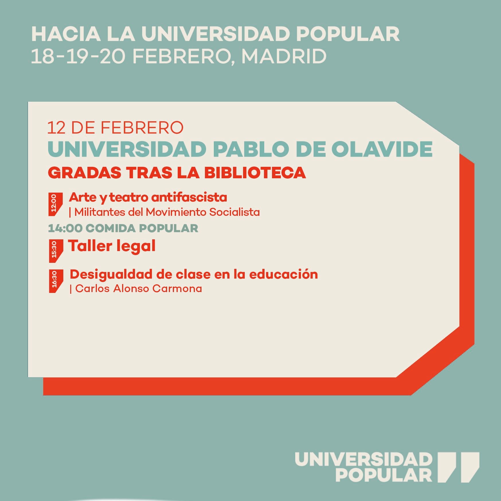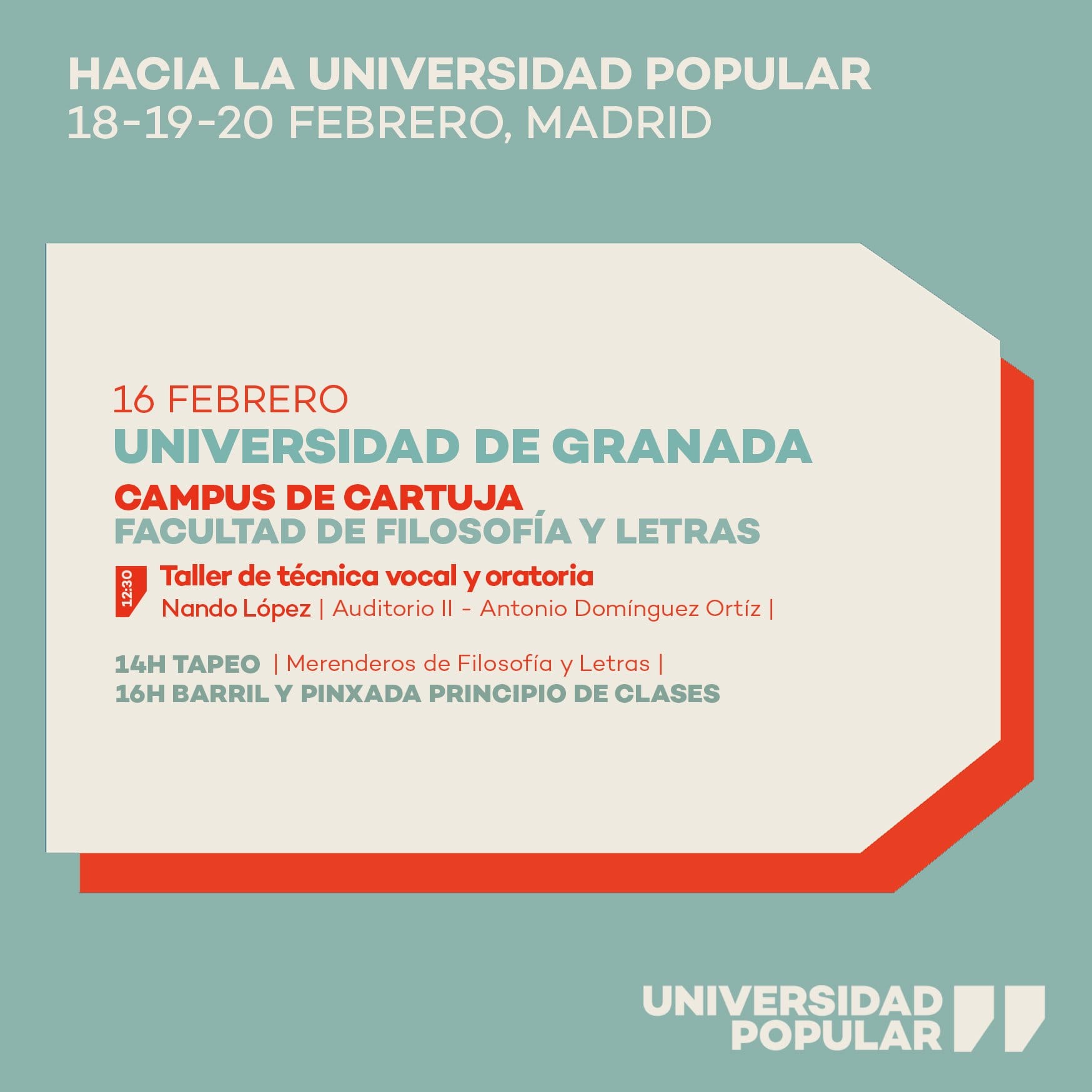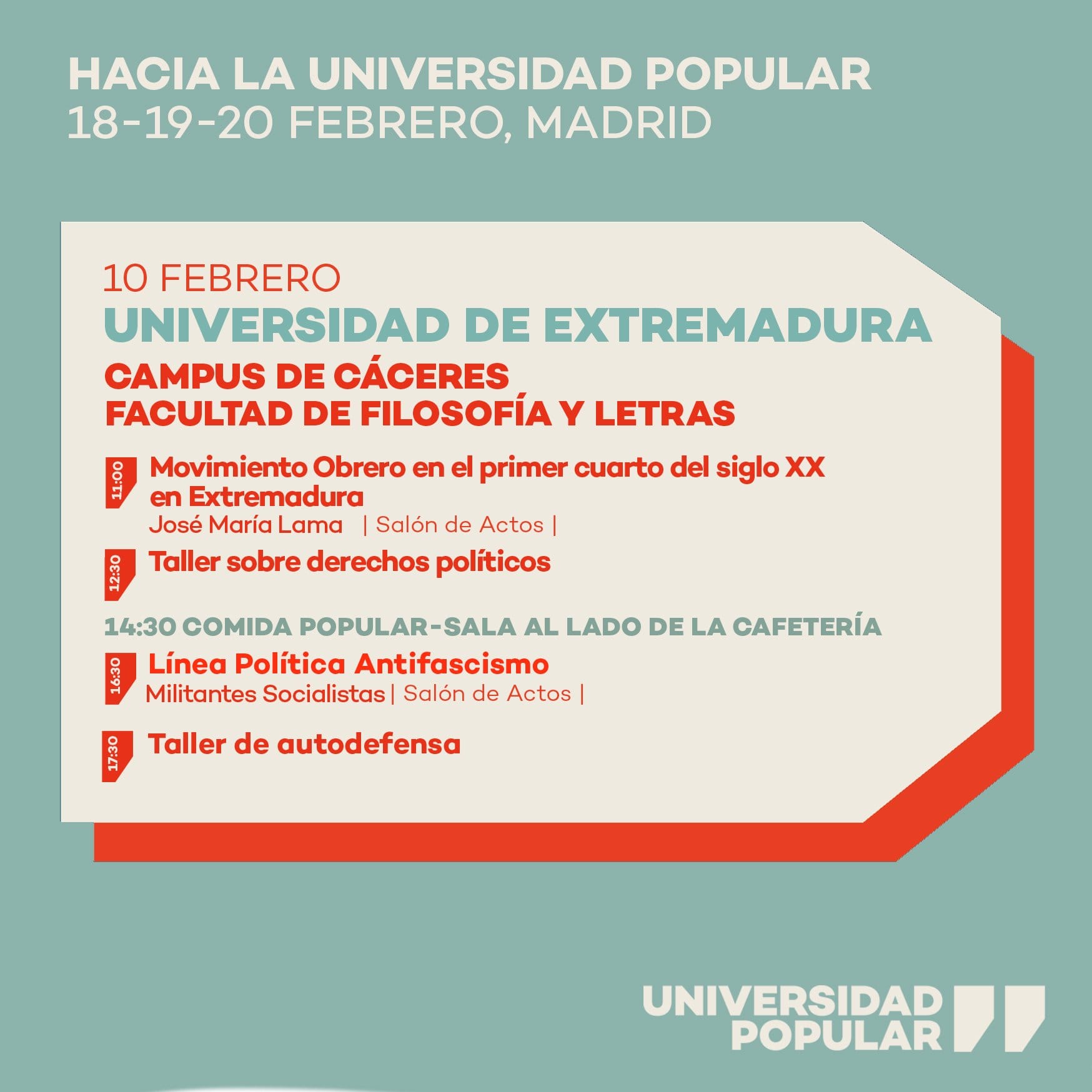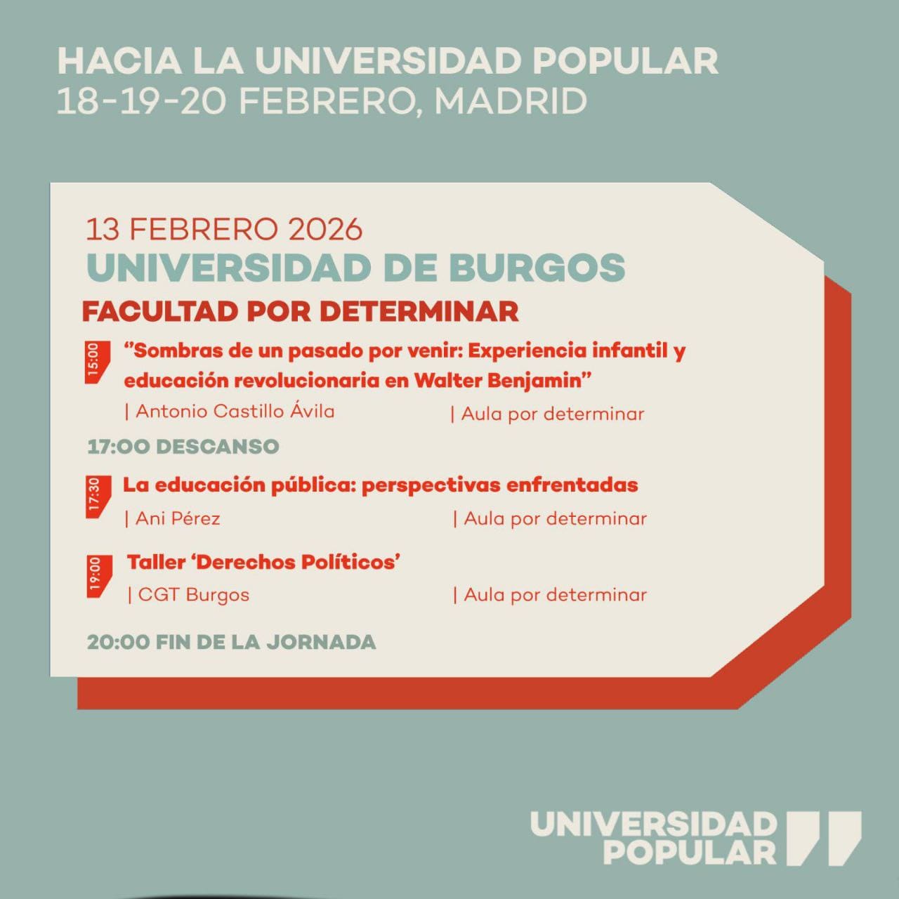 La Universidad Popular 2026 ha anunciado una extensa ronda de actos preparatorios que recorrerá más de una decena de campus universitarios del Estado español a lo largo de las próximas semanas. Según la convocatoria difundida por la organización a través de sus cuentas oficiales de redes sociales, esta ronda de eventos previa culminará con las jornadas centrales en Madrid los días 18, 19 y 20 de febrero. Los eventos, que sirven como lanzamiento y movilización para el encuentro estatal, se enmarcan bajo el lema "Estudiar, educar, organizar".