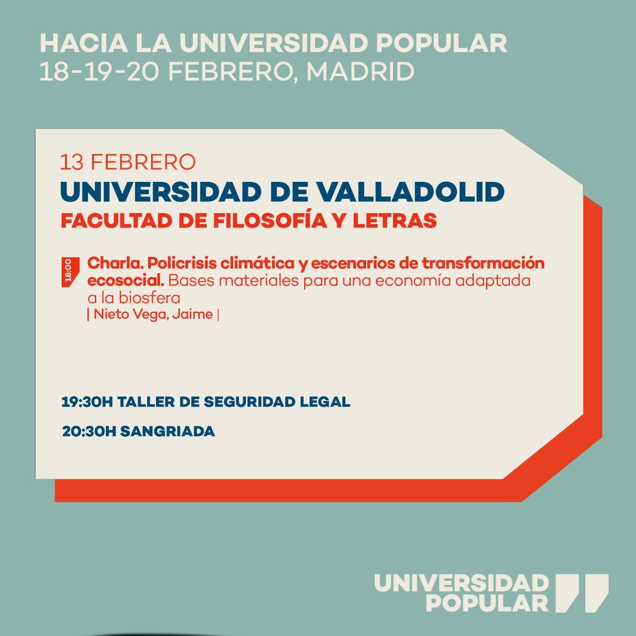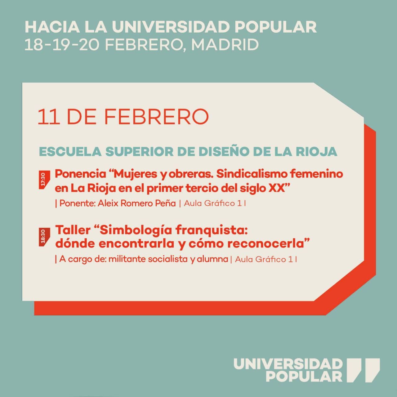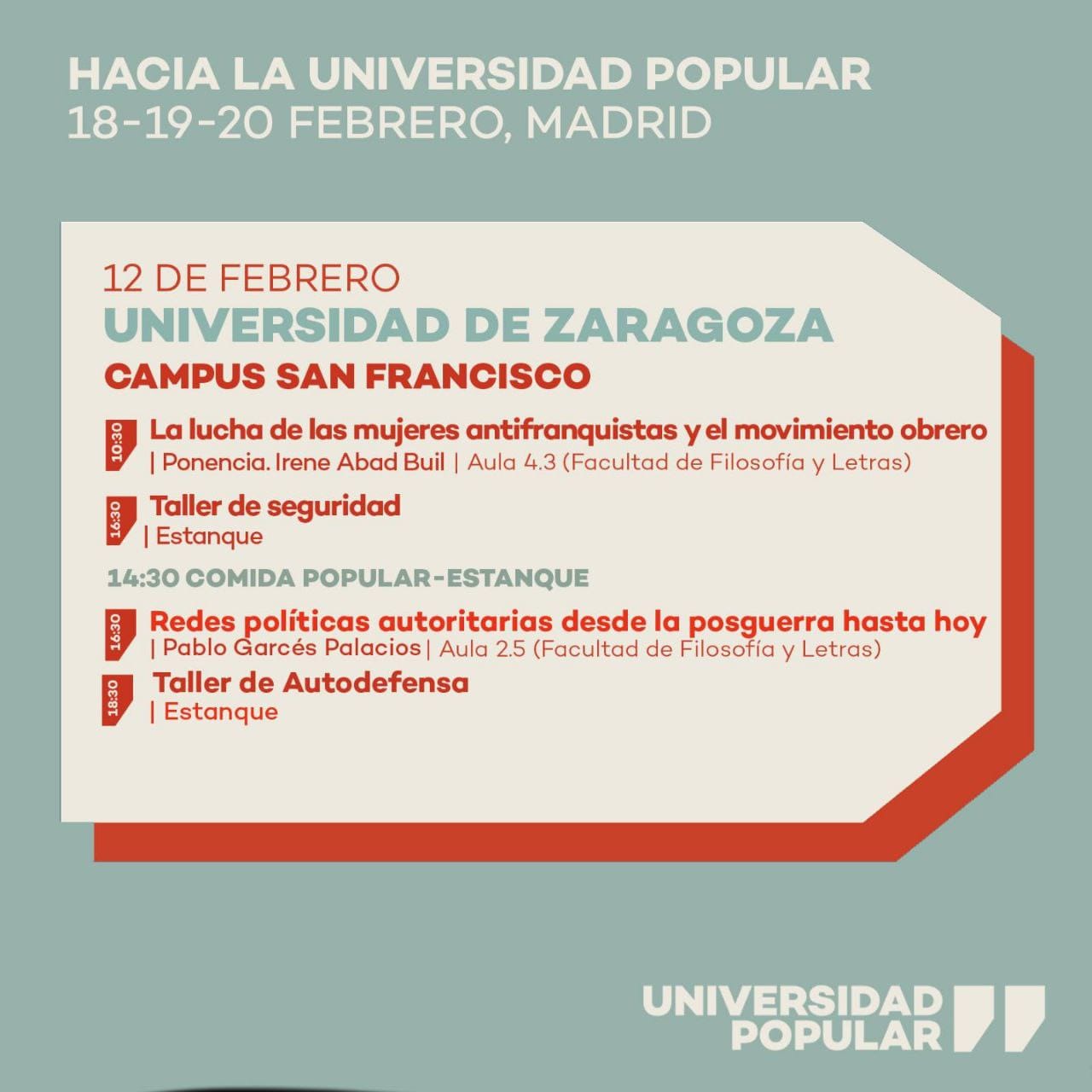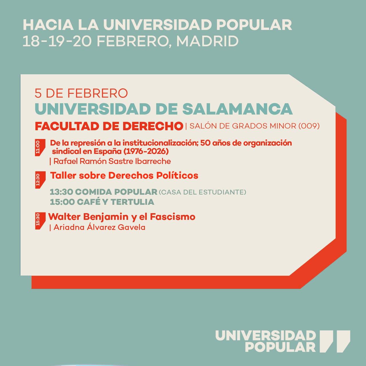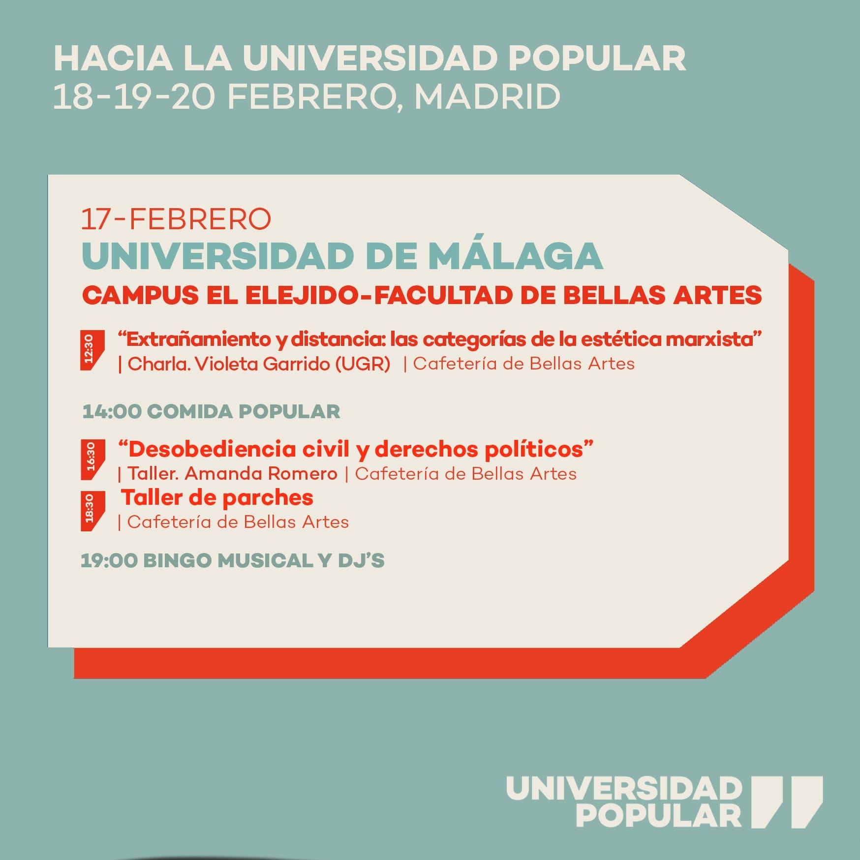 La Universidad Popular 2026 ha anunciado una extensa ronda de actos preparatorios que recorrerá más de una decena de campus universitarios del Estado español a lo largo de las próximas semanas. Según la convocatoria difundida por la organización a través de sus cuentas oficiales de redes sociales, esta ronda de eventos previa culminará con las jornadas centrales en Madrid los días 18, 19 y 20 de febrero. Los eventos, que sirven como lanzamiento y movilización para el encuentro estatal, se enmarcan bajo el lema "Estudiar, educar, organizar".