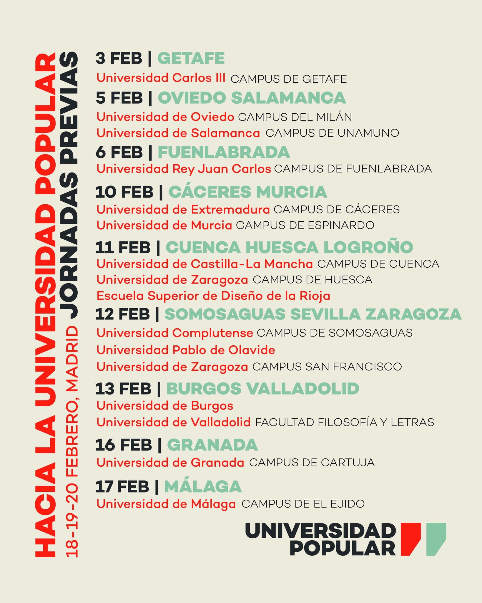 La gira comenzará el próximo lunes 3 de febrero en Getafe y se extenderá hasta el 17 de febrero. Según el calendario publicado, las jornadas se celebrarán en Oviedo y Salamanca (5 de febrero), Fuenlabrada (6 de febrero), Cáceres y Murcia (10 de febrero), Cuenca, Huesca y Logroño (11 de febrero), el campus de Somosaguas, Sevilla y Zaragoza (12 de febrero), Burgos y Valladolid (13 de febrero), Granada (16 de febrero) y Málaga (17 de febrero).