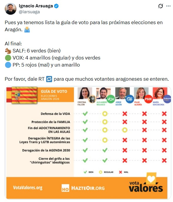 Hazte Oír ha desplegado un autobús con propaganda electoral en Aragón que carga directamente contra Vox, preguntando ¿Es Vox un PP verde? y ¿Nueva derechita cobarde?. La acción electoral, bajo el lema Vota valores, ha sido difundida por algunos medios de comunicación y el analista e investigador Julián Macías Tovar. La propaganda coincide en plena campaña para las elecciones autonómicas aragonesas, y supone una ruptura pública entre Vox y Hazte Oír, que hasta ahora habían sido señaladas como "aliadas". En algunas ocasiones incluso se llegó a especular sobre que Vox estuviera cooptado por El Yunque, una sociedad secreta ultracatólica de México. Macías Tovar señala en su hilo de X que este revés propagandístico podría ser "la venganza" de Ignacio Arsuaga, fundador de Hazte Oír, por la expulsión de Vox de Jaime Hernández, el antiguo líder de las juventudes del partido, Revuelta.