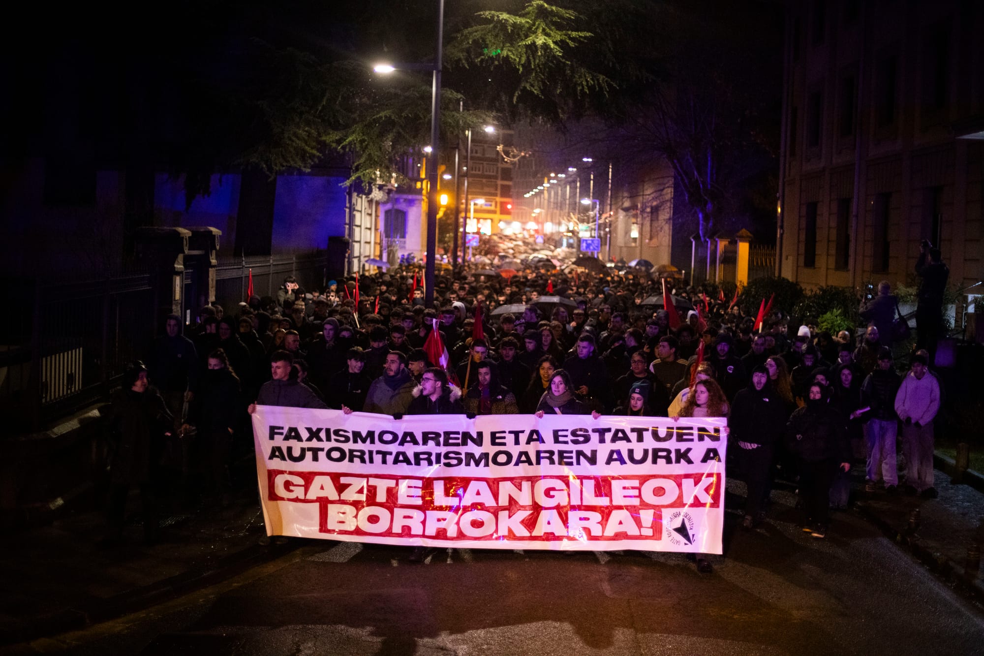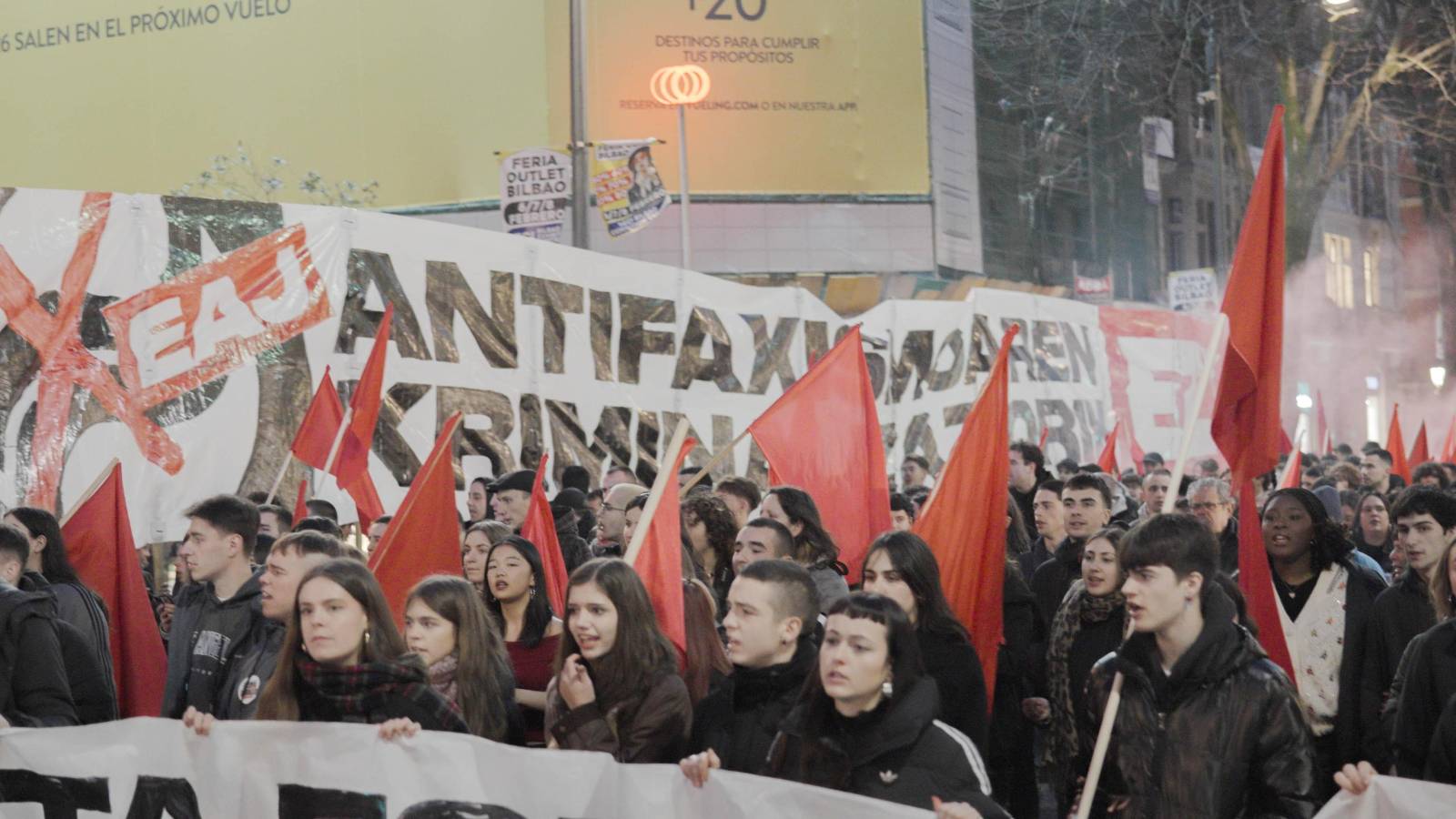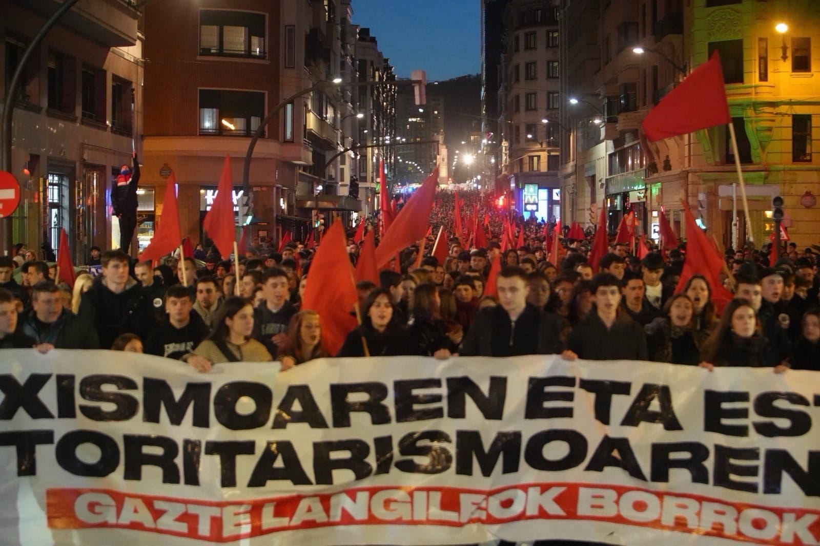 La organización juvenil del Movimiento Socialista presentó en diciembre la convocatoria de movilizaciones para ayer, y desde entonces destacó que su objetivo era "construir un muro de contención ante el fascismo y el giro autoritario de los estados". Un compromiso que reiteró ayer: "No vamos a aceptar la exaltación de la dictadura franquista, no vamos a aceptar ideas supremacistas contra Euskal Herria o contra el euskera, tampoco aceptaremos el racismo contra las personas inmigrantes, ni los discursos machistas que dicen que la mujer debe estar al servicio del hombre".