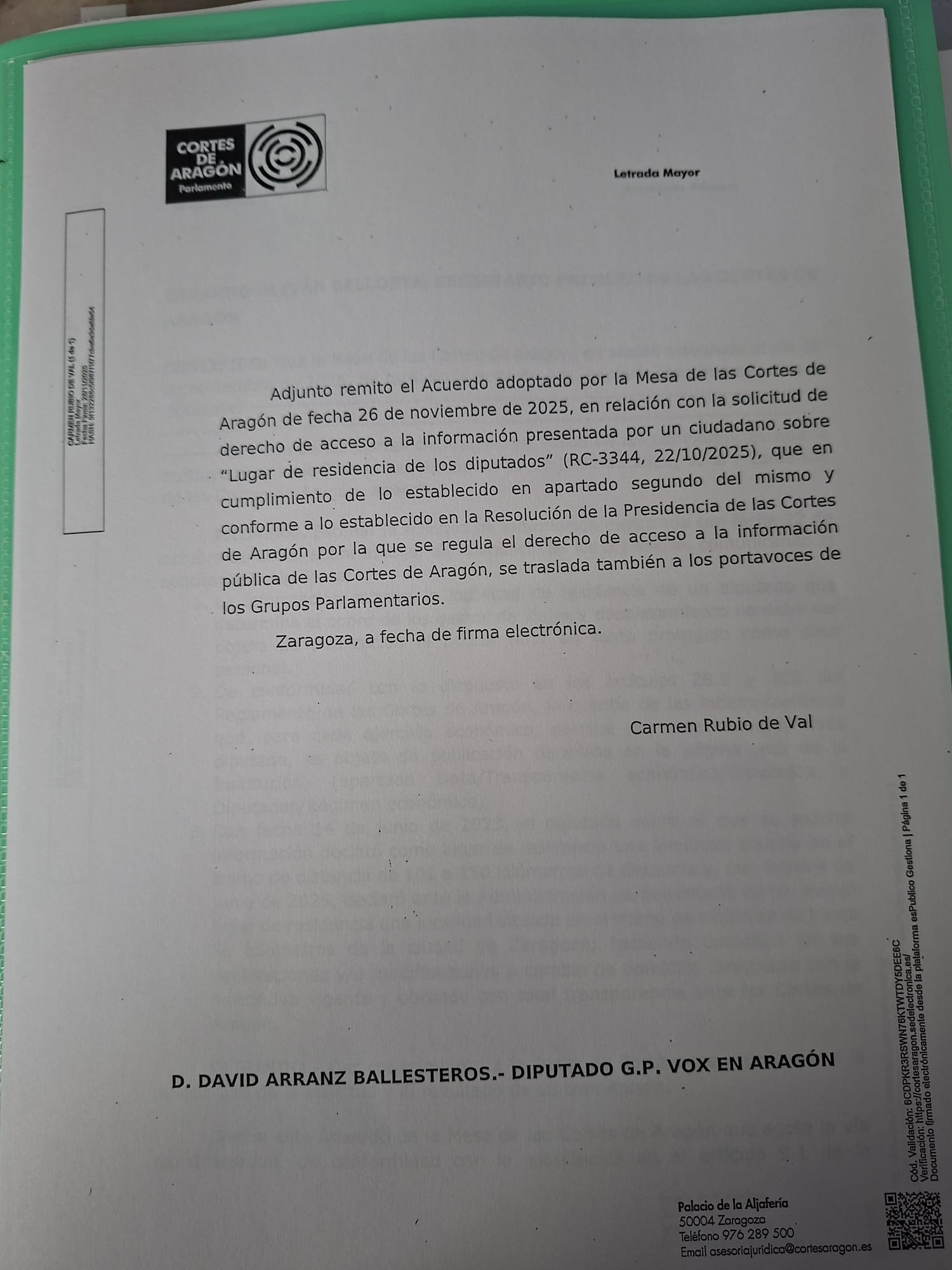 Lejos de desmentir la información publicada por DIARIO SOCIALISTA, que se basa exclusivamente en datos del portal de transparencia de la cámara y las declaraciones previas del propio Arranz, la respuesta del diputado introduce nuevas pruebas documentales. Adjunta un Acuerdo de la Mesa de las Cortes de Aragón, fechado el 26 de noviembre de 2025, que certifica dos fechas clave: