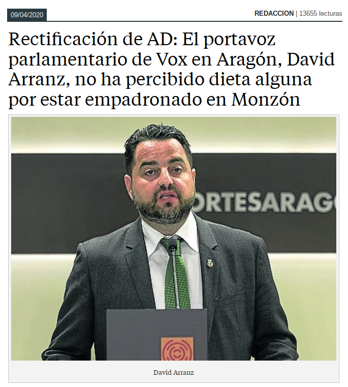 El diputado de Vox por Huesca y cabeza de lista de la provincia en las elecciones al Gobierno de Aragón del próximo 8 de febrero, David Arranz, ha respondido a la revelación de su discrepancia en las dietas por desplazamiento con unas declaraciones públicas, afirmando que va a emprender acciones legales. Para ello ha aportando, paradójicamente, un documento oficial que confirma y detalla la secuencia de hechos descritos por este diario, que originaron la controversia.