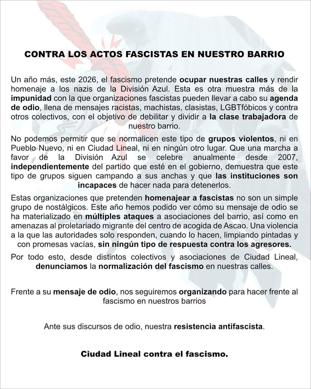 La Asamblea de la Juventud Trabajadora (AJT) de Ciudad Lineal y una decena de colectivos vecinales han denunciado la convocatoria para este sábado, 7 de febrero, de un acto de homenaje a la División Azul en el barrio de Pueblo Nuevo. La marcha, que se realiza anualmente desde 2007, culmina en el monumento a los divisionarios en el Cementerio de La Almudena y conmemora la batalla de Krasni Bor, donde voluntarios fascistas españoles combatieron junto al ejército nazi en la invasión contra la Unión Soviética. Los organizadores, vinculados a la Hermandad Nacional de la División Azul y a grupos neonazis como Núcleo Nacional, proclaman mensajes racistas, machistas, clasistas y LGBTfóbicos, según el comunicado difundido por Ciudad Lineal contra el fascismo.