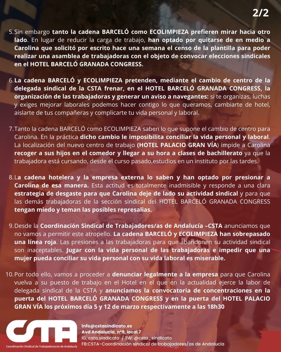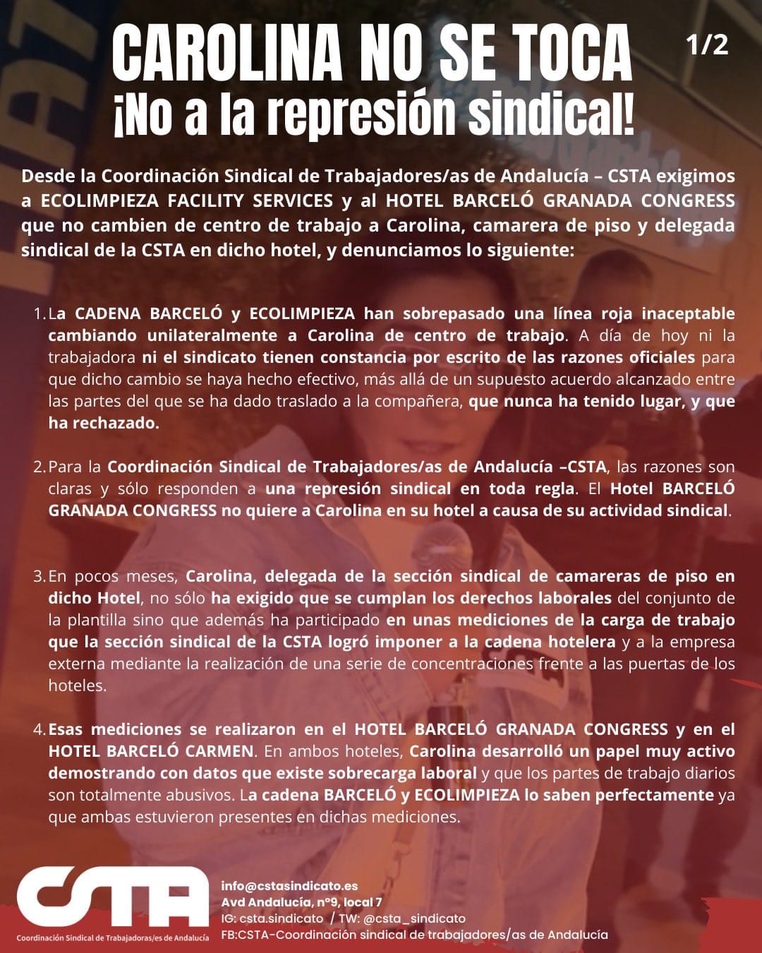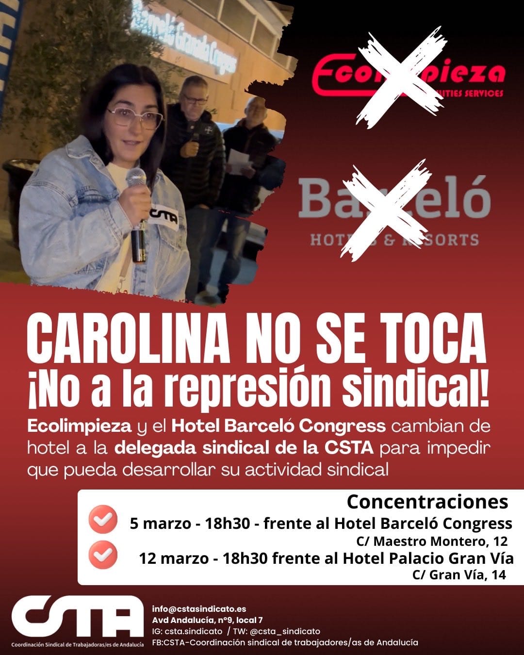 La Coordinación Sindical de Trabajadores y Trabajadoras de Andalucía (CSTA) ha denunciado que la cadena Barceló y la empresa subcontratada Ecolimpieza han cambiado de centro de trabajo a Carolina, delegada sindical de la organización en el Hotel Barceló Congress de Granada, como represalia por su actividad sindical. Carolina ha sido trasladada al Hotel Palacio Gran Vía, una medida que, en palabras del sindicato, responde a su papel activo en las mediciones de tiempo realizadas en diciembre y enero en los hoteles Congress y Carmen, que demostraron la existencia de sobrecarga laboral entre las camareras de piso. Denuncian que la trabajadora no ha recibido notificación oficial de las razones del cambio, que ella ha rechazado.