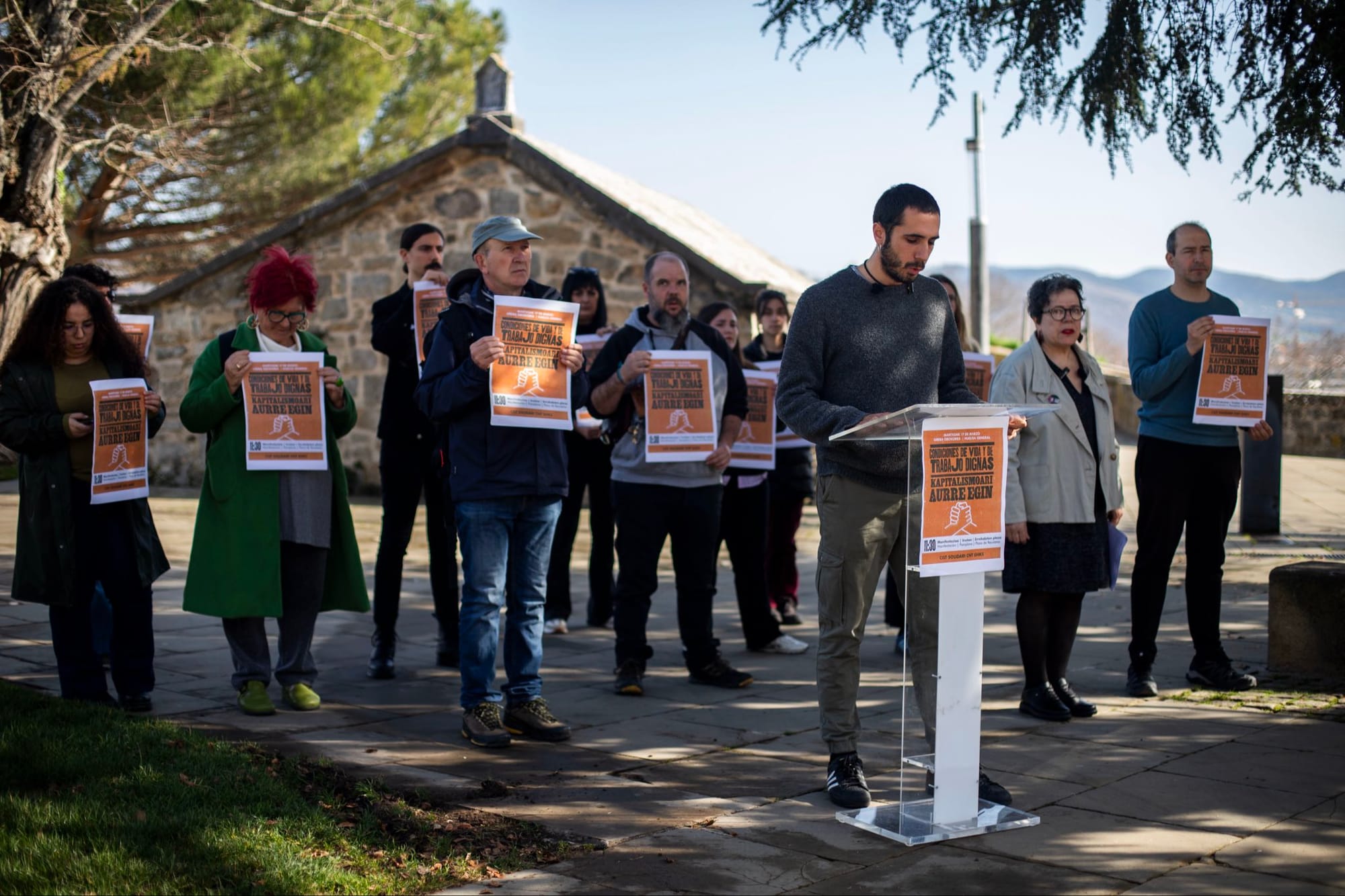 CGT, Solidari, CNT y EHKS han recordado que "estamos asistiendo al auge del autoritarismo de los Estados", junto con "el incremento de las tensiones bélicas" y "el endurecimiento de las medidas represivas". Han denunciado que el aumento del presupuesto militar implica, entre otras cosas, "el deterioro progresivo de los servicios básicos", y han advertido de que esa agenda basada "en el empobrecimiento y el autoritarismo" está siendo impulsada principalmente "desde la Unión Europea". Por ello, han subrayado la necesidad de "actuar desde una perspectiva internacionalista", con el objetivo de "articular la unidad de las luchas en Europa y a nivel internacional".