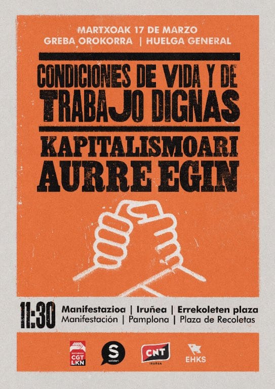 En la jornada de huelga del 17 de marzo, distintas organizaciones sindicales, políticas y sociales de Nafarroa se movilizarán conjuntamente. En concreto, CGT, Solidari, CNT y el Consejo Socialista de Euskal Herria (EHKS) han organizado una manifestación bajo el lema Condiciones de vida y de trabajo dignas, ¡hagamos frente al capitalismo!. La movilización comenzará a las 11:30 desde la Plaza de los Recoletas de Iruñea. La convocatoria cuenta además con el apoyo de diversos agentes de Iruñerria: se han sumado Dar Etxea, Ikasle Antolakunde Sozialista (IAS), Anticapitalistas, PIM, Gazte Komunistak, Gerrarik Ez, Sustrai Erakuntza, LAS de Iruñerria, el Sindicato Socialista de Vivienda de Iruñerria y la red de apoyo mutuo hARITU.