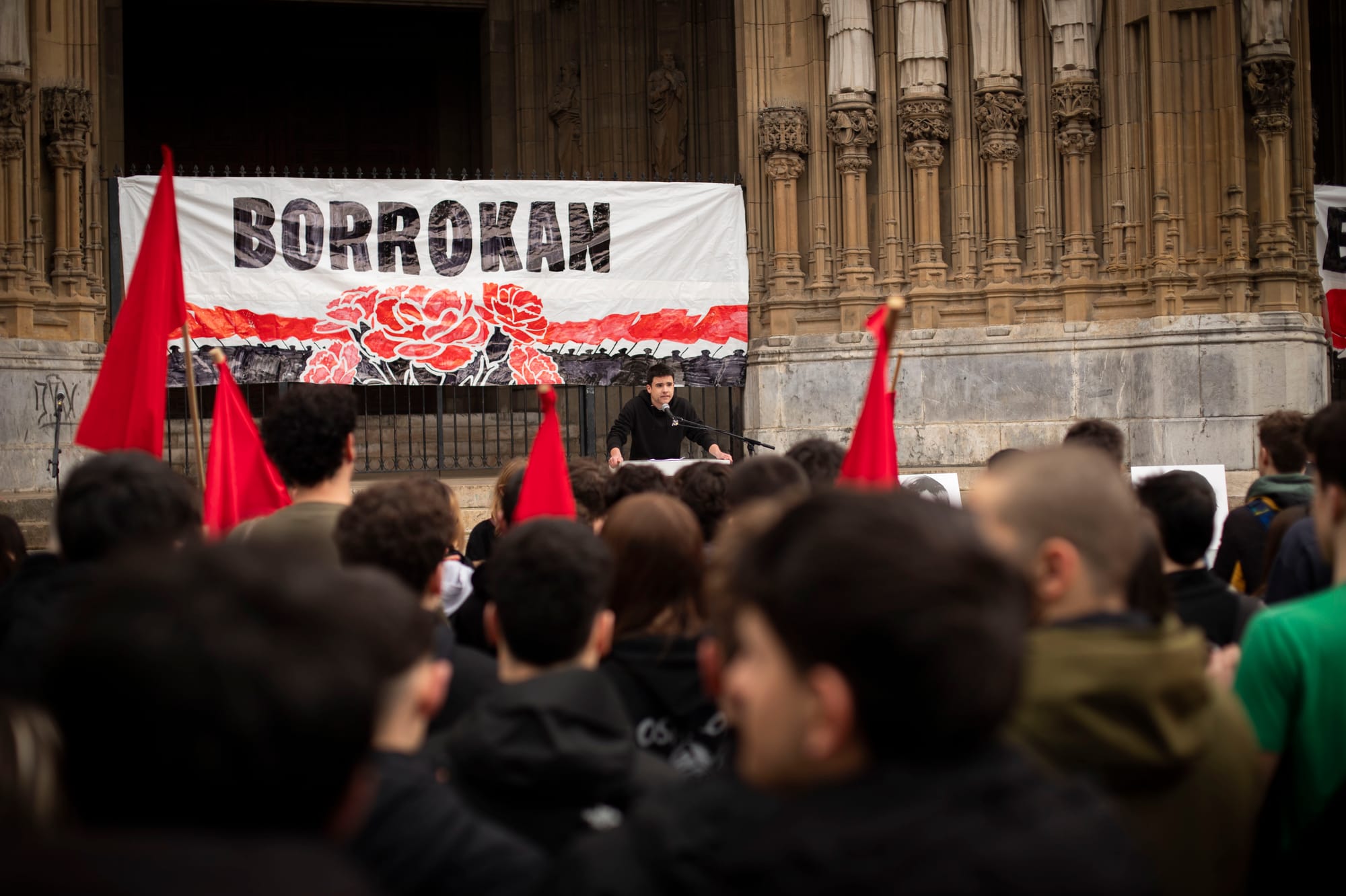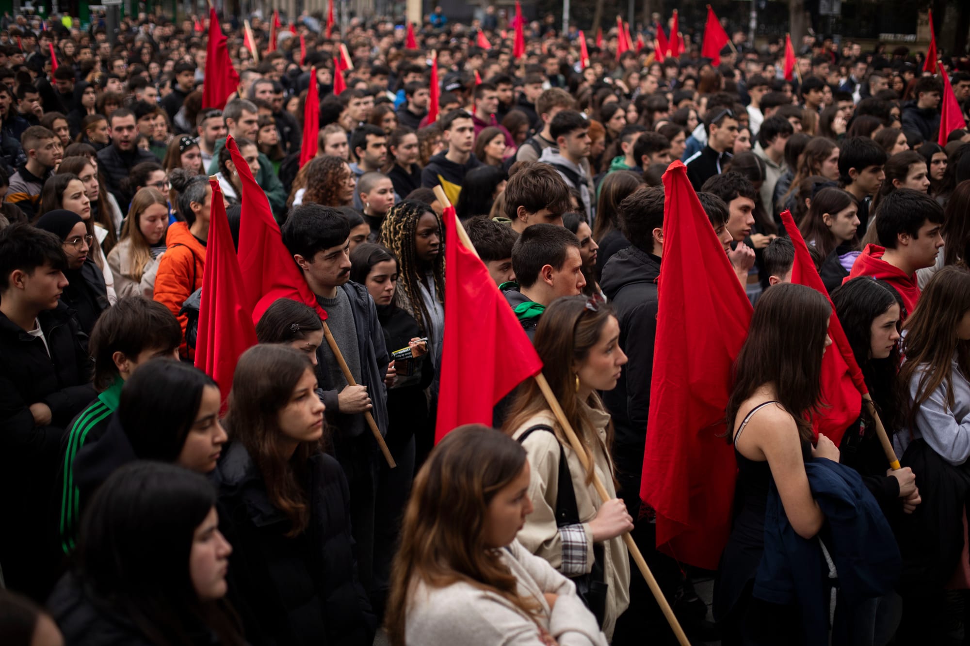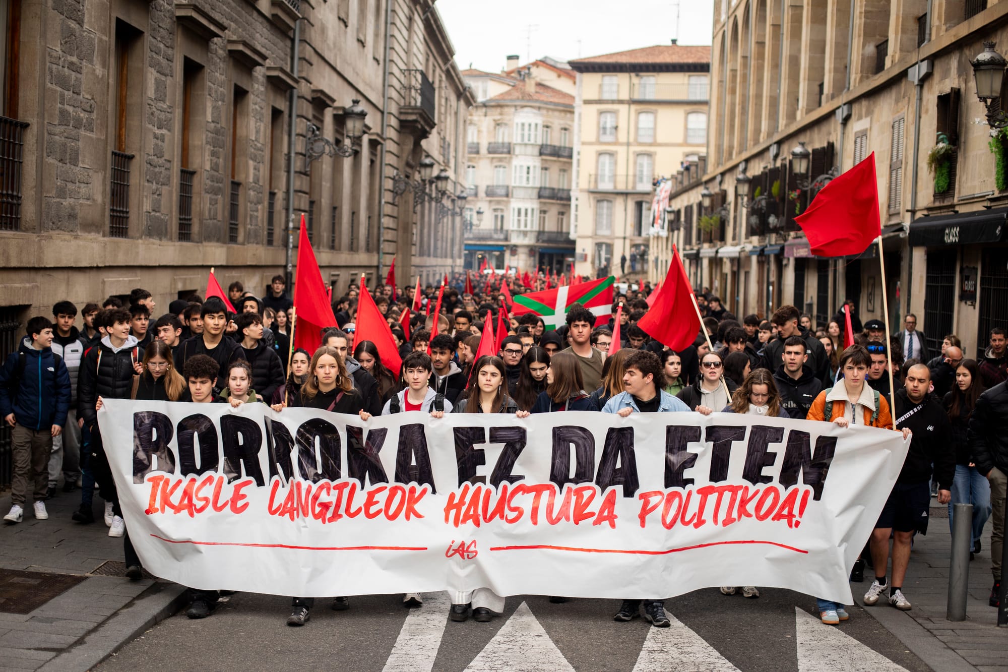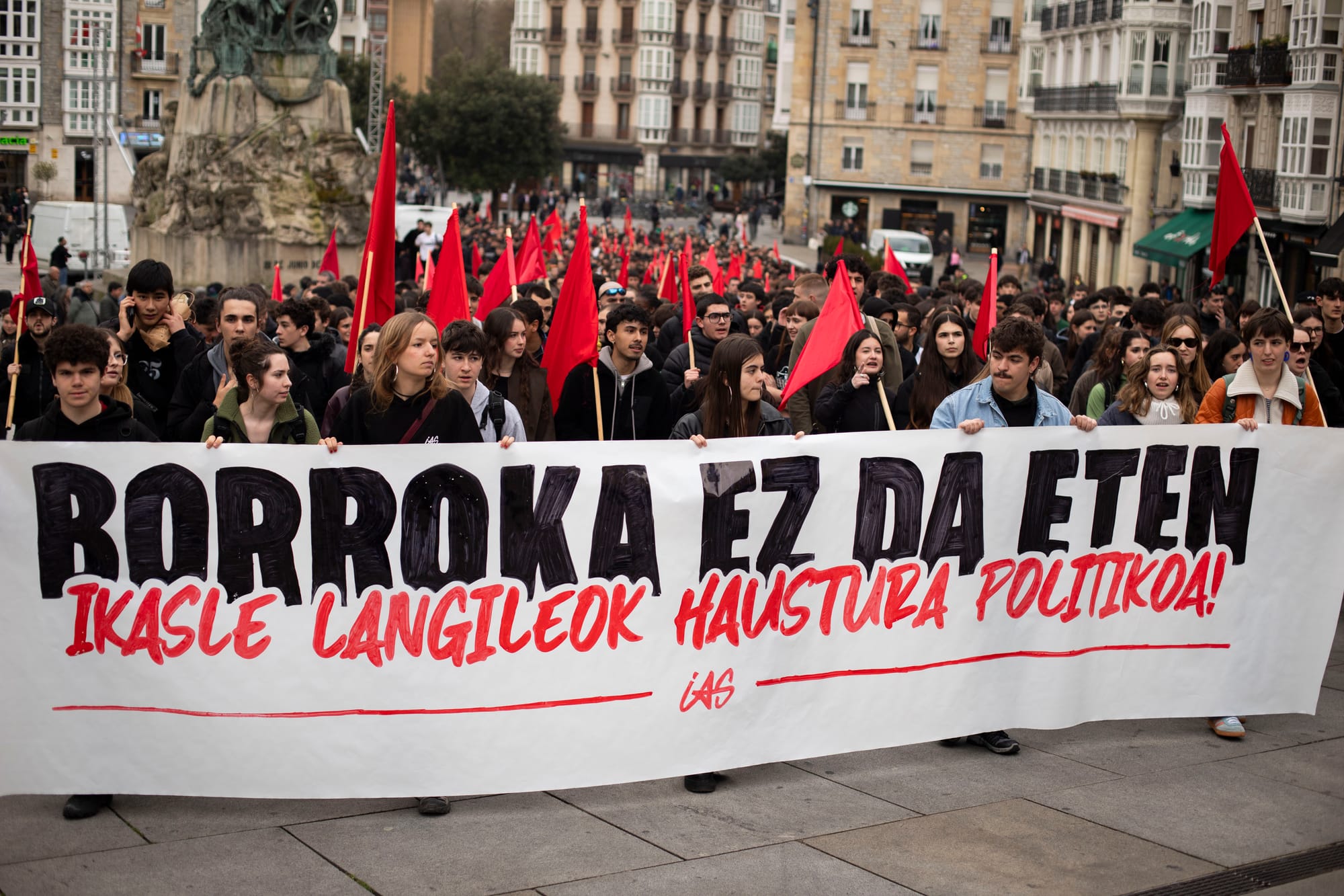 A medio siglo de la matanza de Gasteiz (Araba), los estudiantes de la capital han secundado la huelga en memoria de los huelguistas asesinados por la Policía Armada el 3 de marzo de 1976. Desde primera hora de la mañana se ha movilizado un gran número de estudiantes, coreando Borroka ez da eten! (¡La lucha no cesa!) de centro educativo en centro educativo y llamando a tomar las calles. A las 11:30, una multitud se ha concentrado en la Plaza de la Virgen Blanca, convocada por Ikasle Antolakunde Sozialista de Gasteiz (IAS) y Gazte Koordinadora Sozialista (GKS), para iniciar una manifestación.